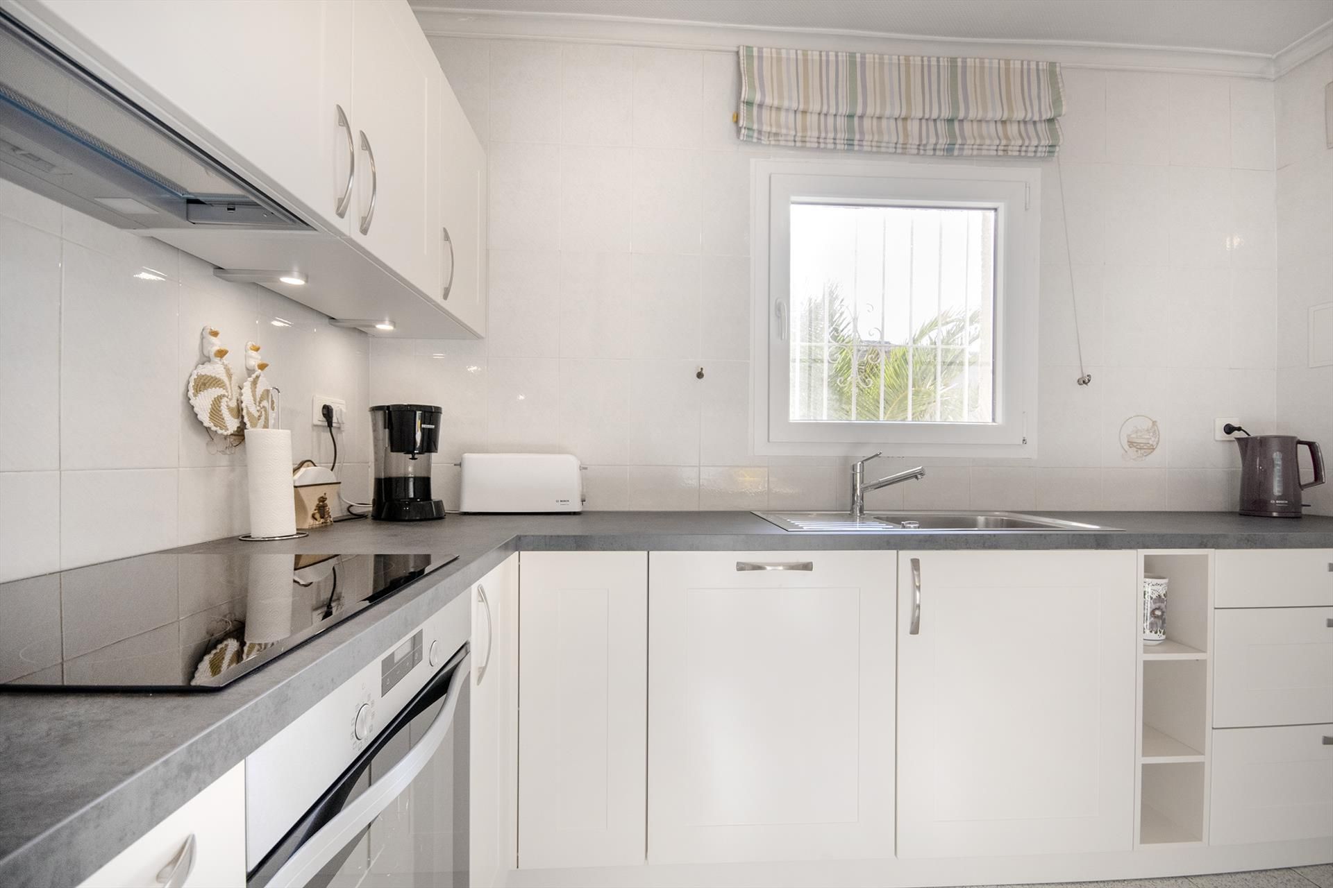 • kitchen with electric hob, electric oven, microwave, dishwasher, refrigerator-freezer, coffee machine, toaster and juicer