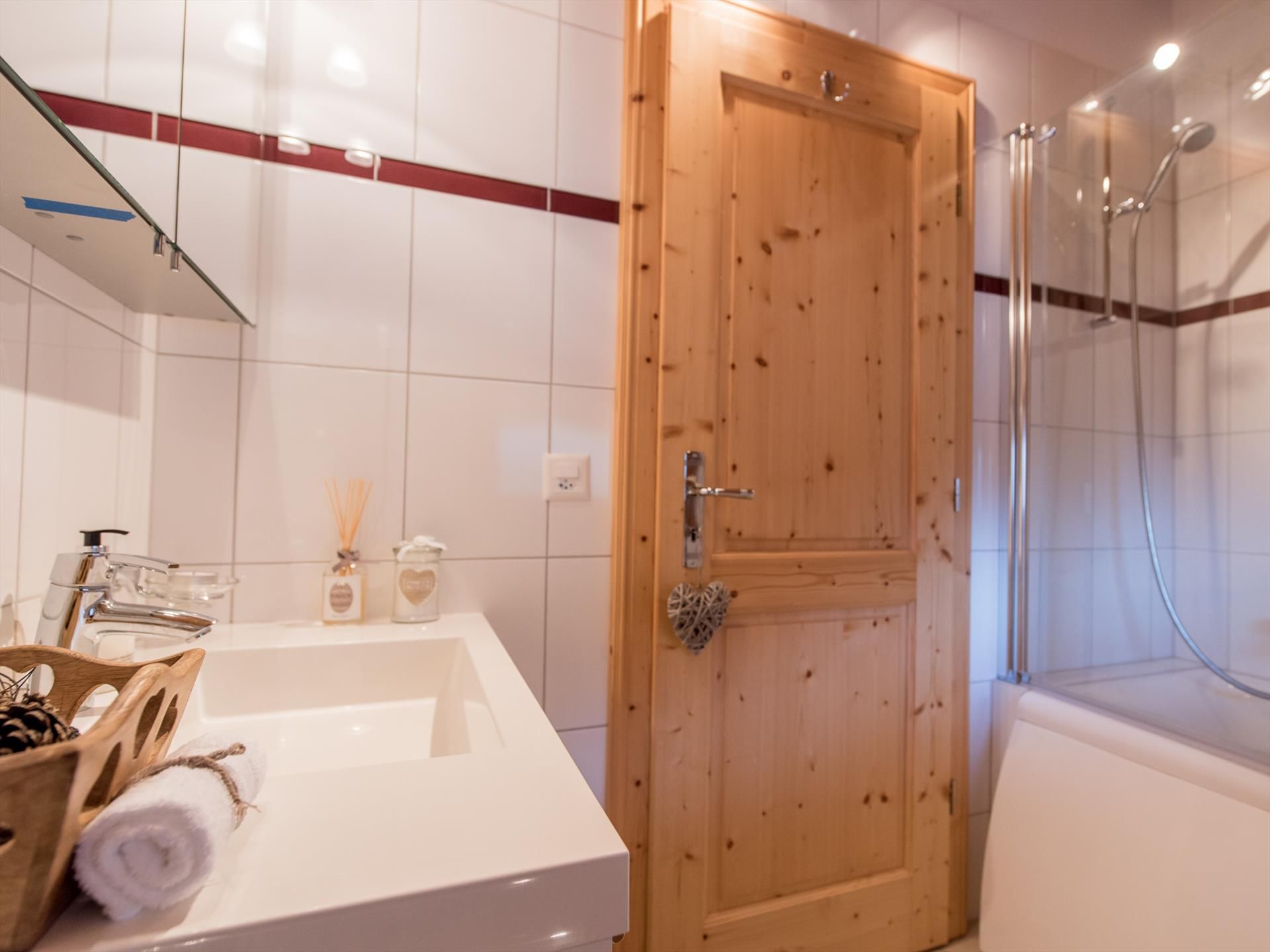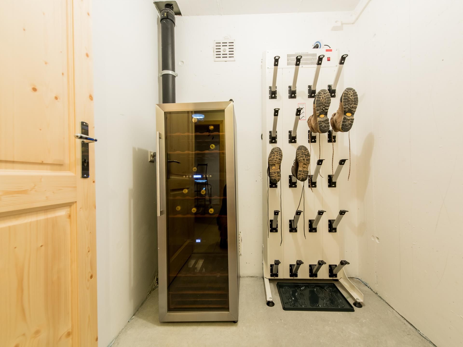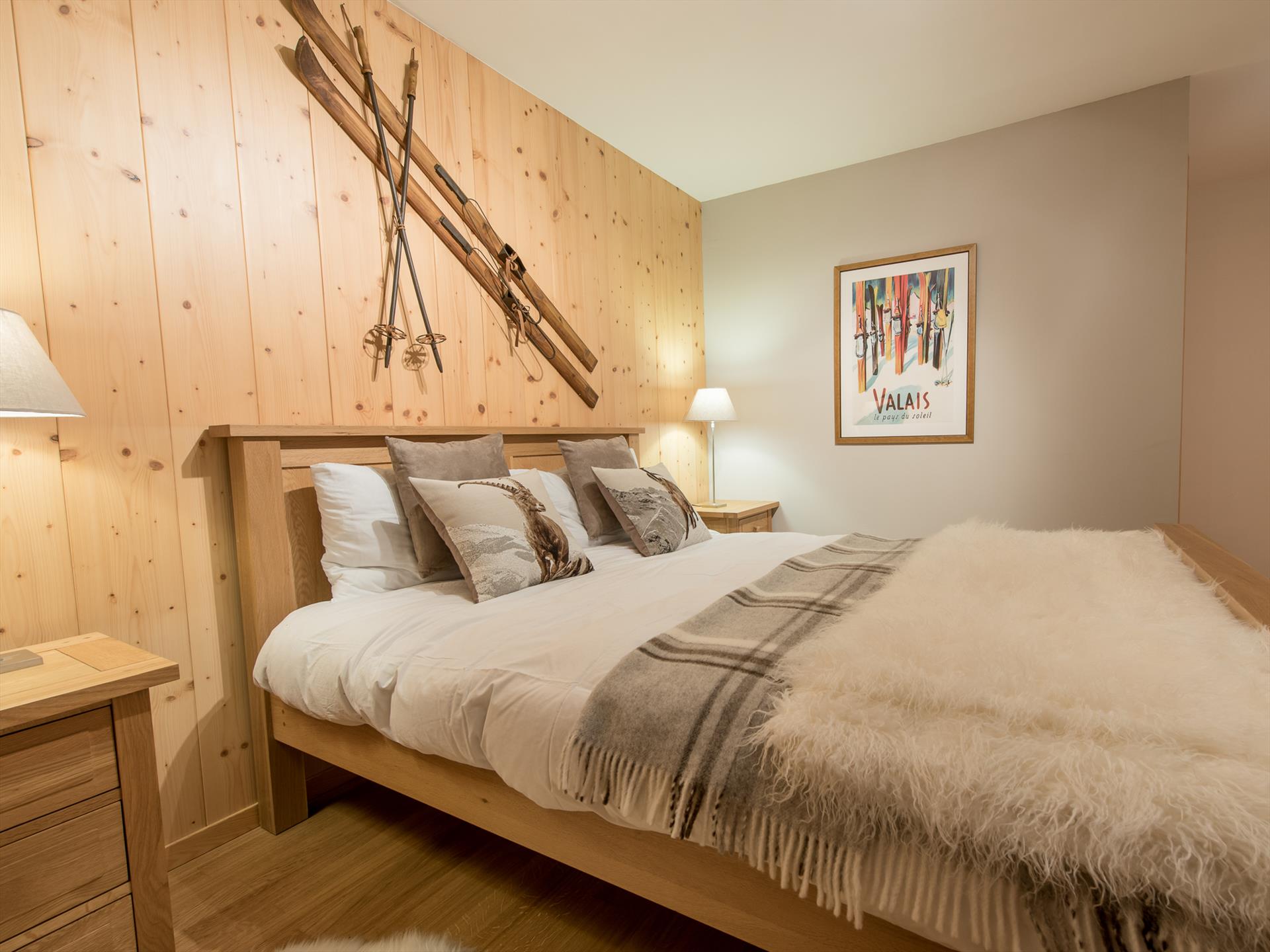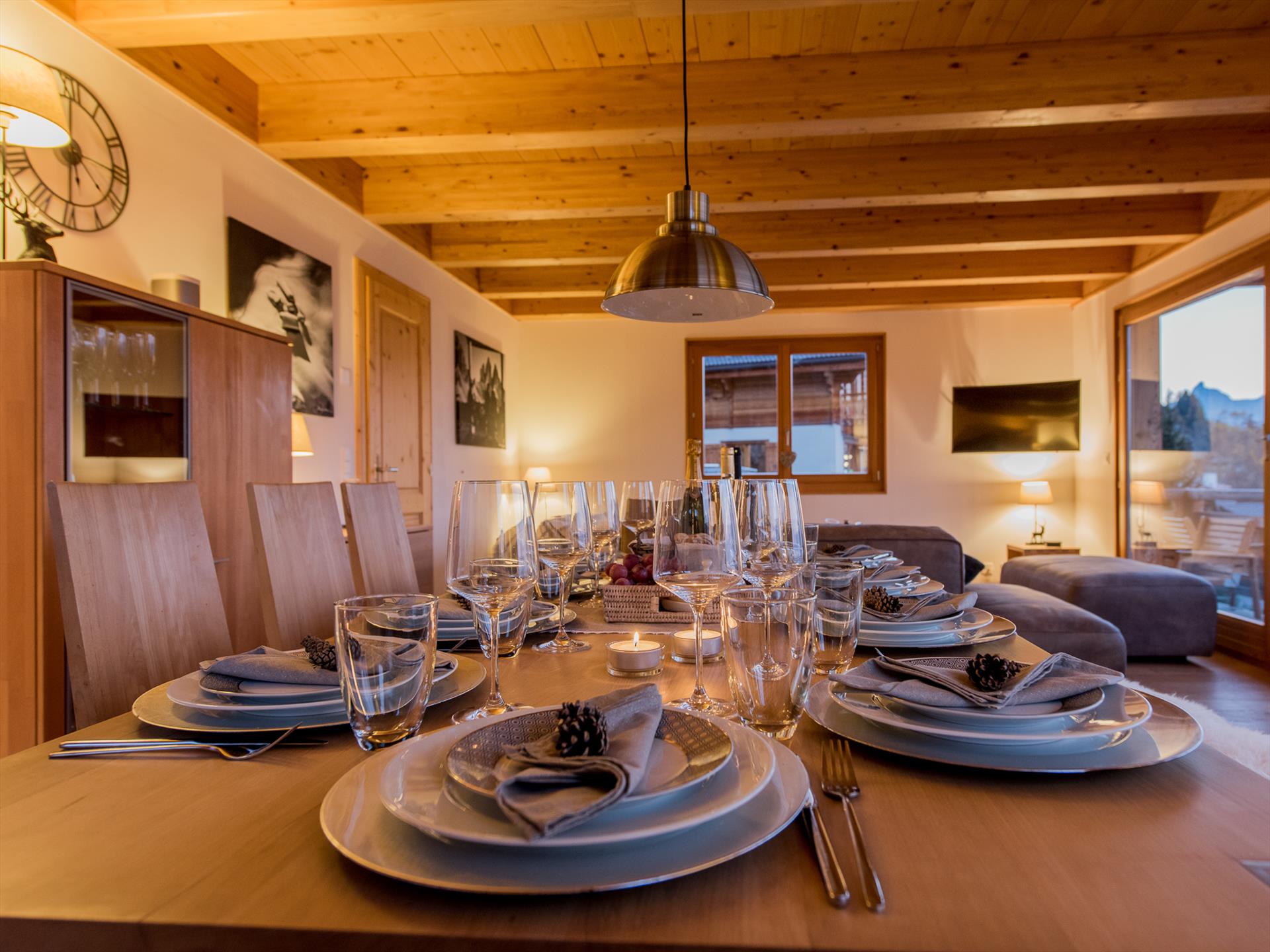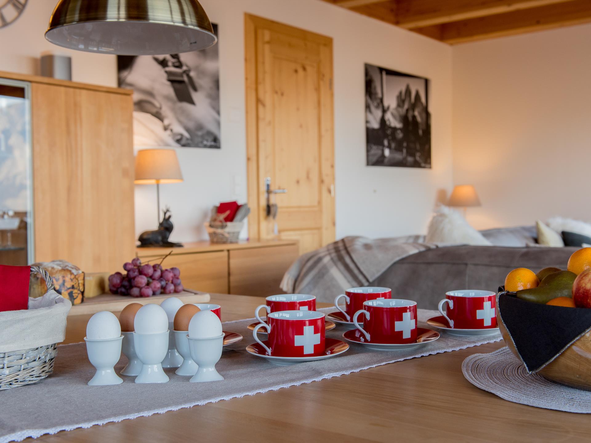 The main floor of the chalet is a beautiful open plan kitchen/living/dining area. It is fully equipped to a high standard with everything you might need for catering for two families, including double oven, large vitro-ceramic hob with five cooking rings, dishwasher, microwave, electric filter coffee machine, Nespresso coffee machine and fridge/freezer. There is a kettle, toaster, and plenty of crockery and glasses for every occasion. There are fondue and raclette sets for a traditional Swiss evening in front of the log fire. Washing machine, dryer, hairdryer and iron are all available for you to use and patio furniture should you wish to sit outside and enjoy the fresh air and truly breathtaking view. There is also a heated boot rack to keep your ski boots warm and ready for the next morning. There’s even a wine cooler to chill those great local wines.