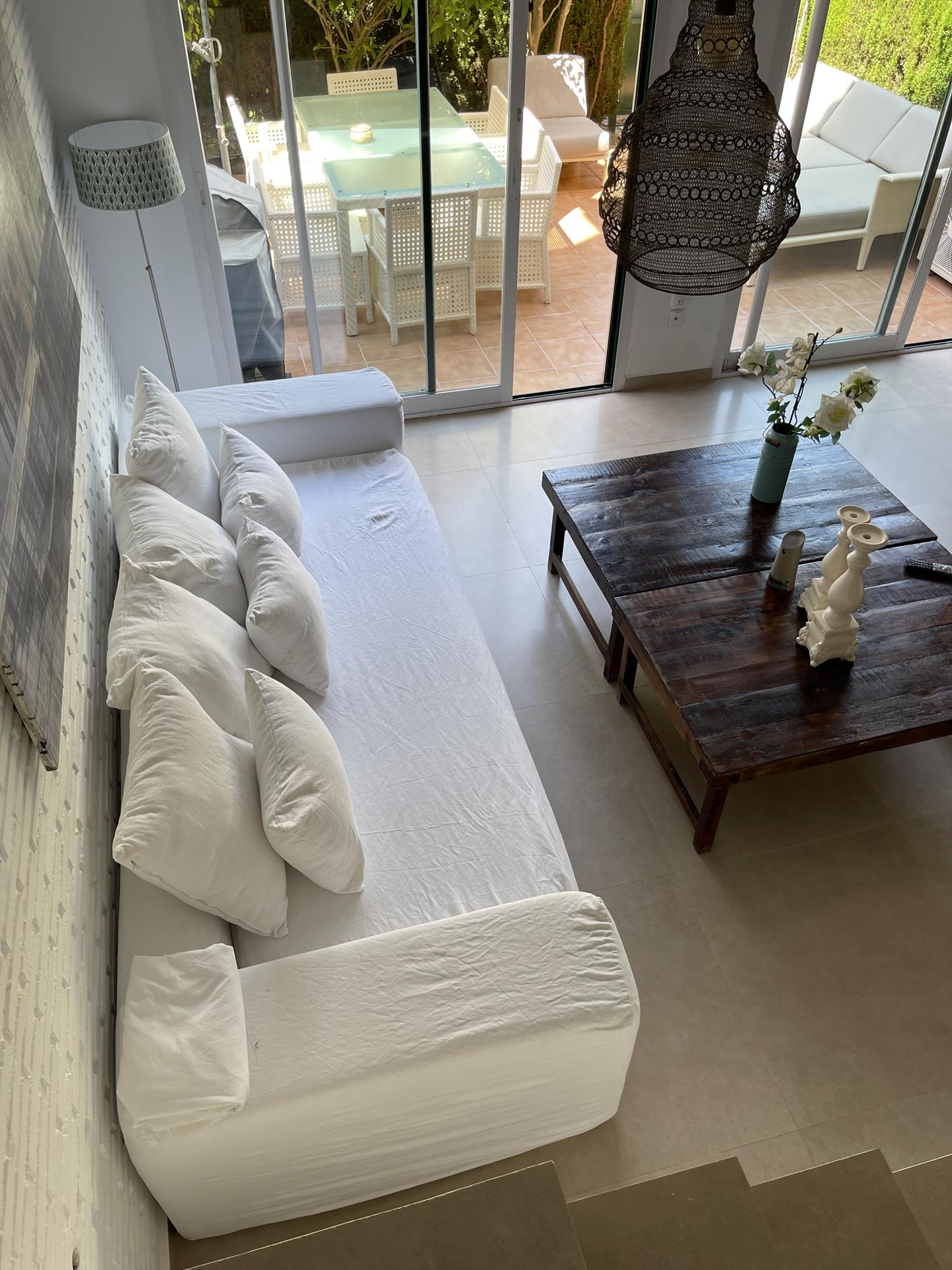 La casa tiene 5 dormitorios, 4 cuartos de baño y 1 aseo para invitados, distribuidos en 3 plantas. El alojamiento ofrece mucha privacidad y un jardín comunitario con césped y árboles. El confort y la cercanía de la playa, sitios para salir y lugares para ir de compras hacen de esta casa de vacaciones un alojamiento ideal para pasar sus vacaciones en España con familia o amigos.
