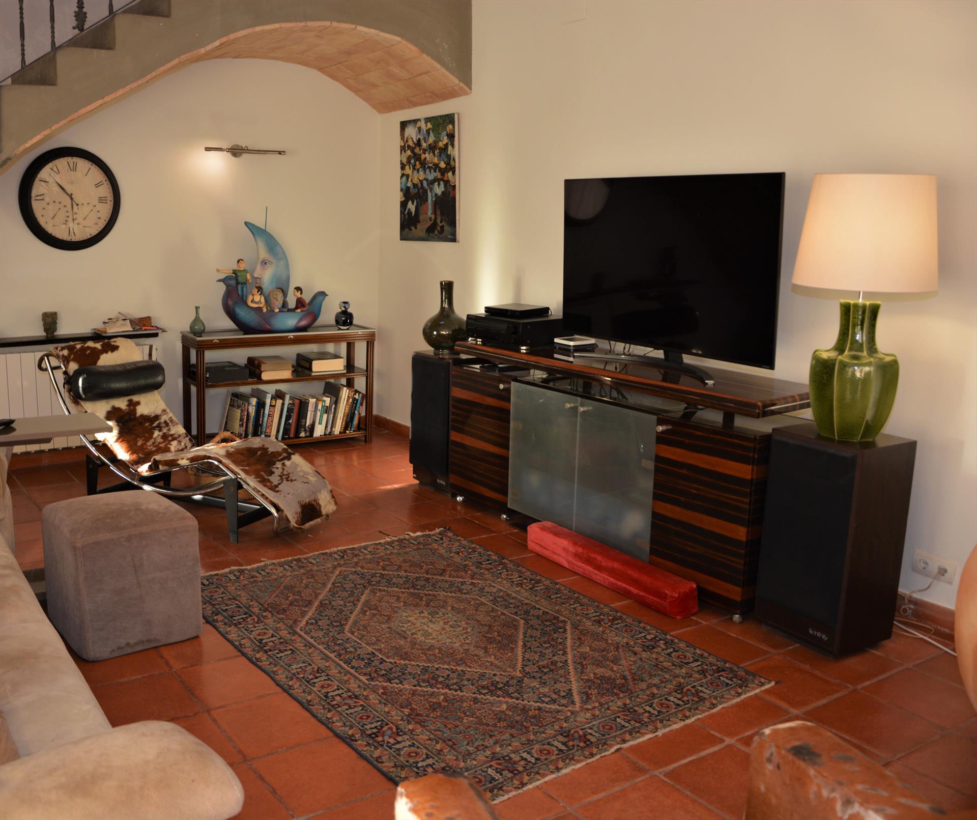 - salón con televisión, sistema de alta fidelidad y ventilador de techo