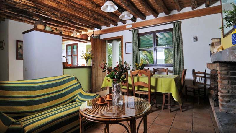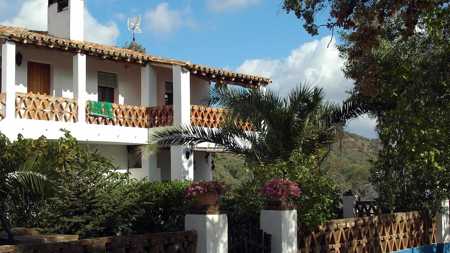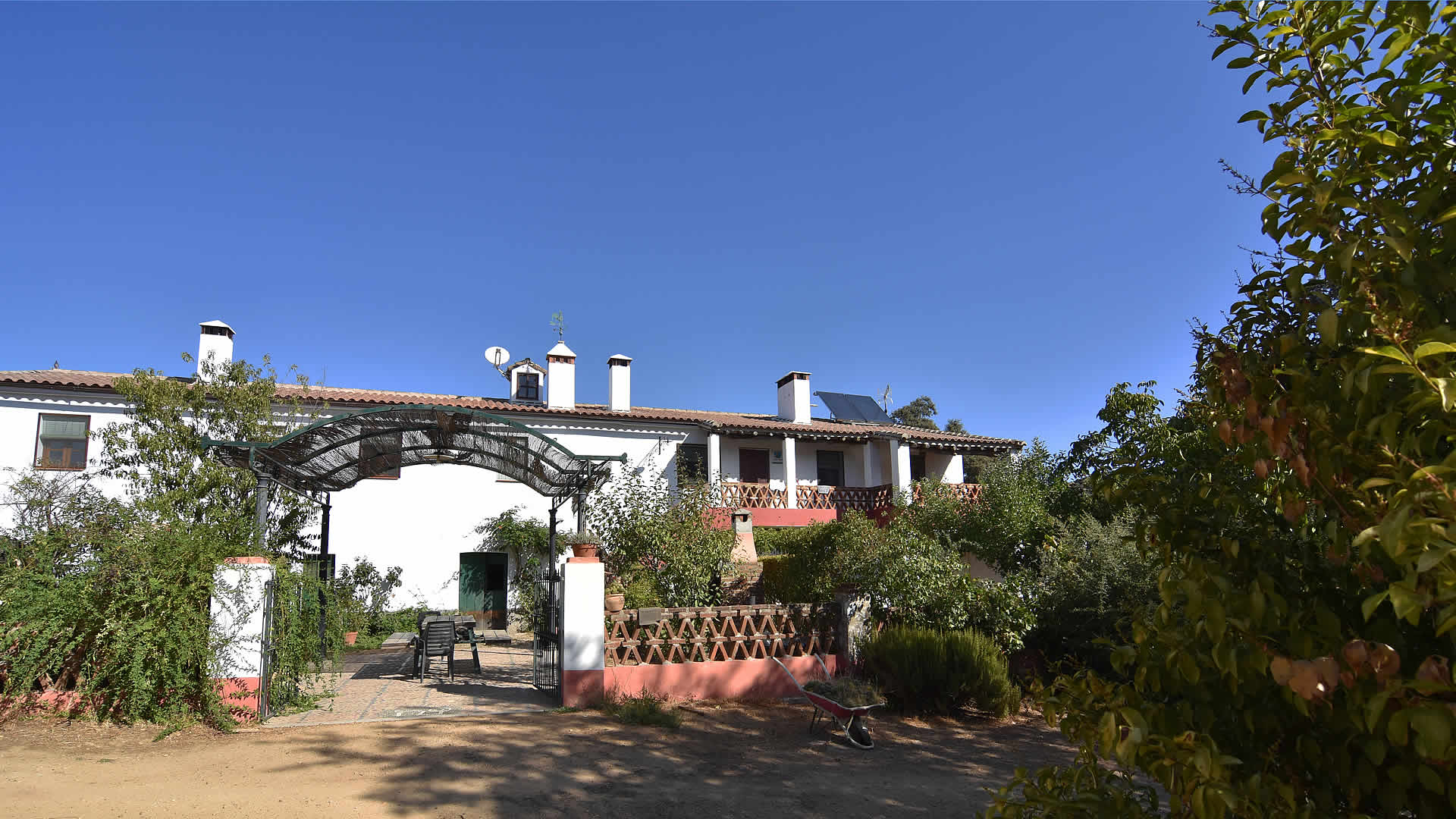 La casa es parte del cortijo que describimos en la Ref. Aracena 002 y tiene su propio jardín con mesa, sillas y barbacoa. El cortijo se encuentra en pleno campo, pues hay que cruzar un bello paraje de encinas y alcornocales. Dispone de una gran piscina para refrescarse donde los niños se lo pasan estupendamente.