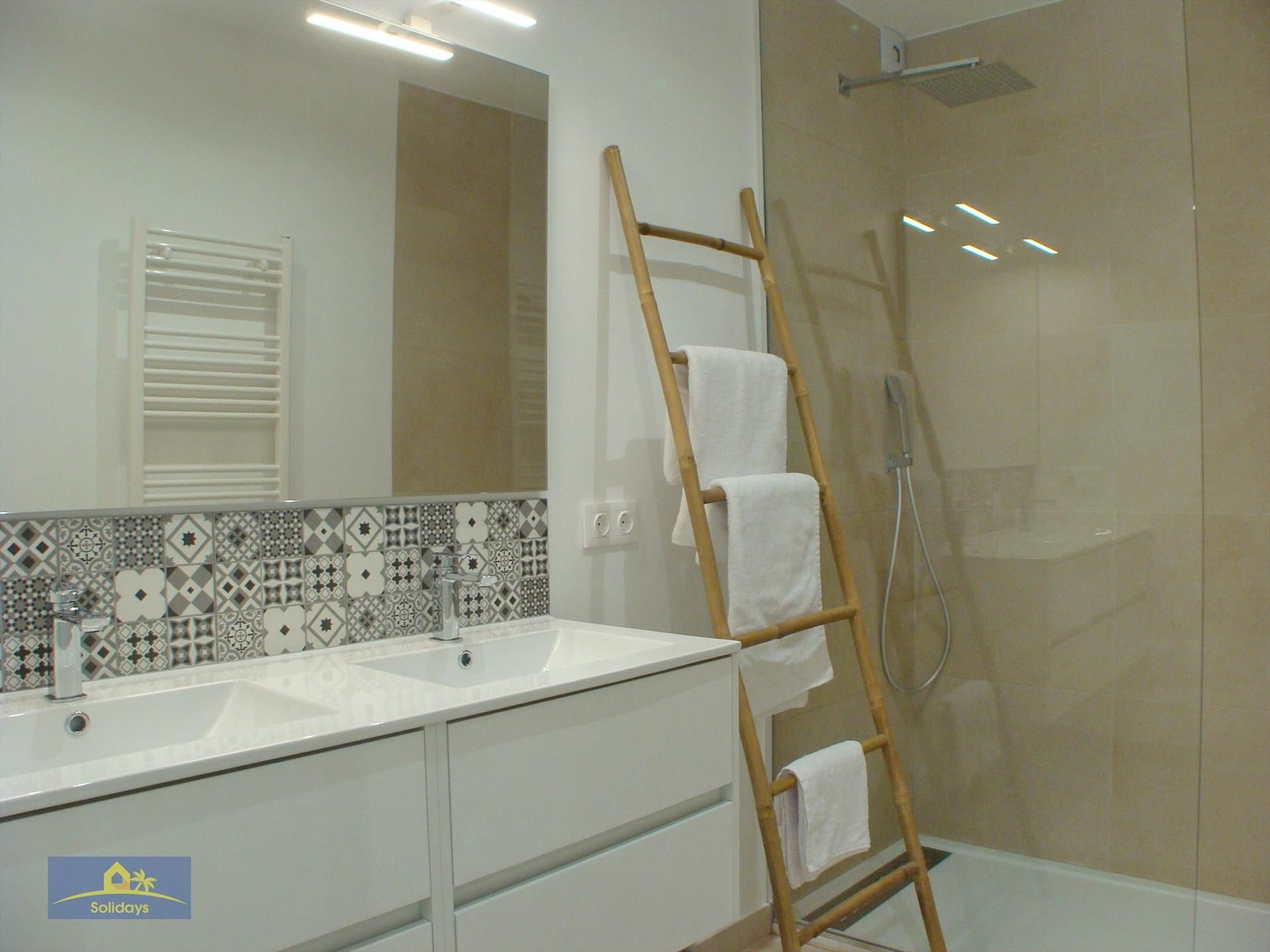 • 2 baños en suite, cada uno con lavabo doble, ducha, inodoro y secador de pelo