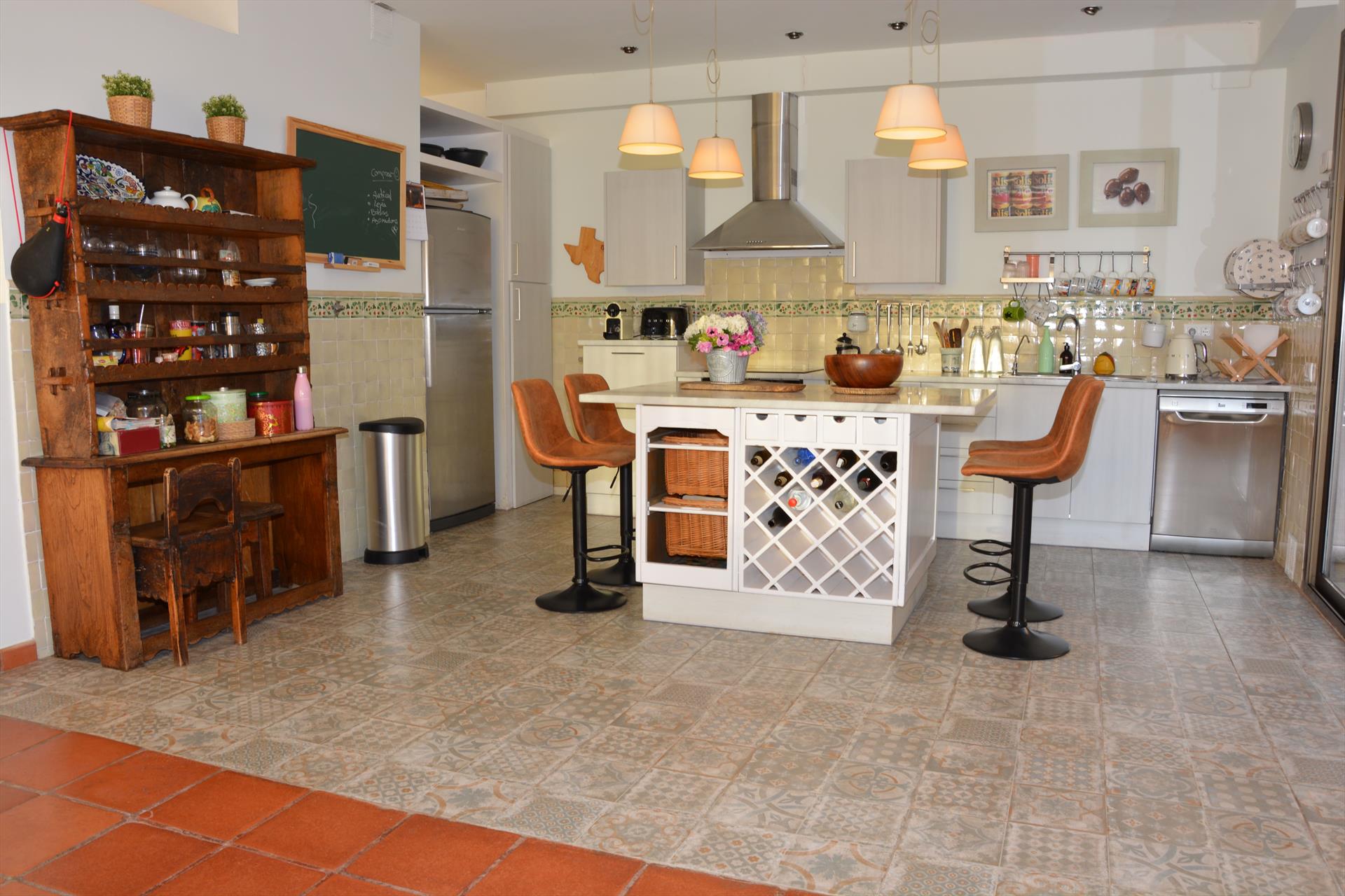 - cocina abierta con cocina de gas, horno eléctrico, microondas, lavavajillas, refrigerador-congelador, cafetera, tetera eléctrica, batidora, tostadora y exprimidor