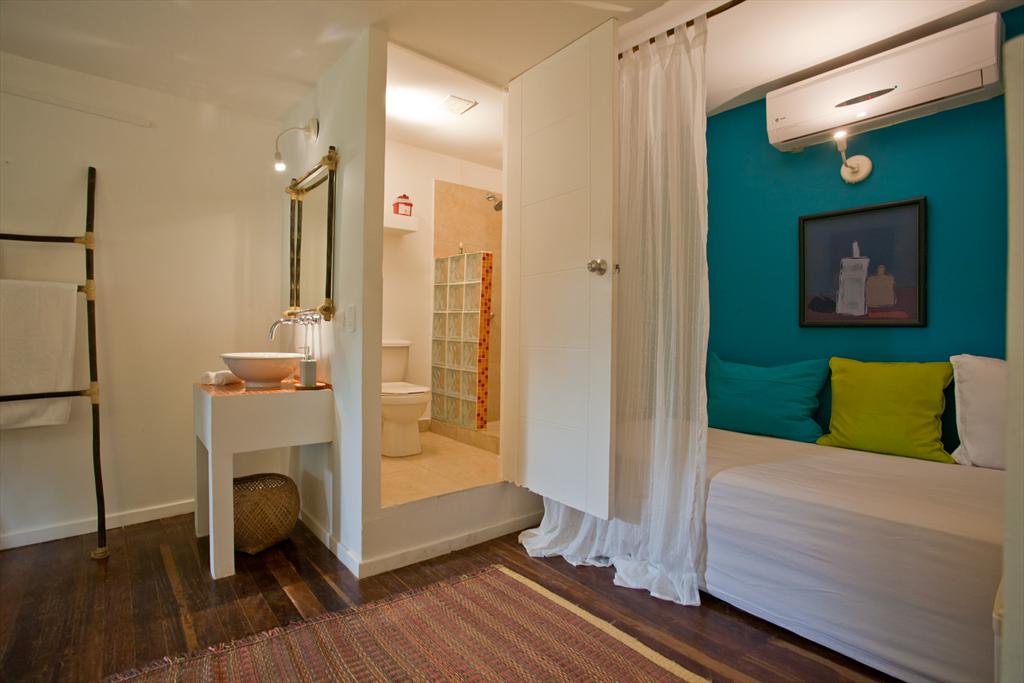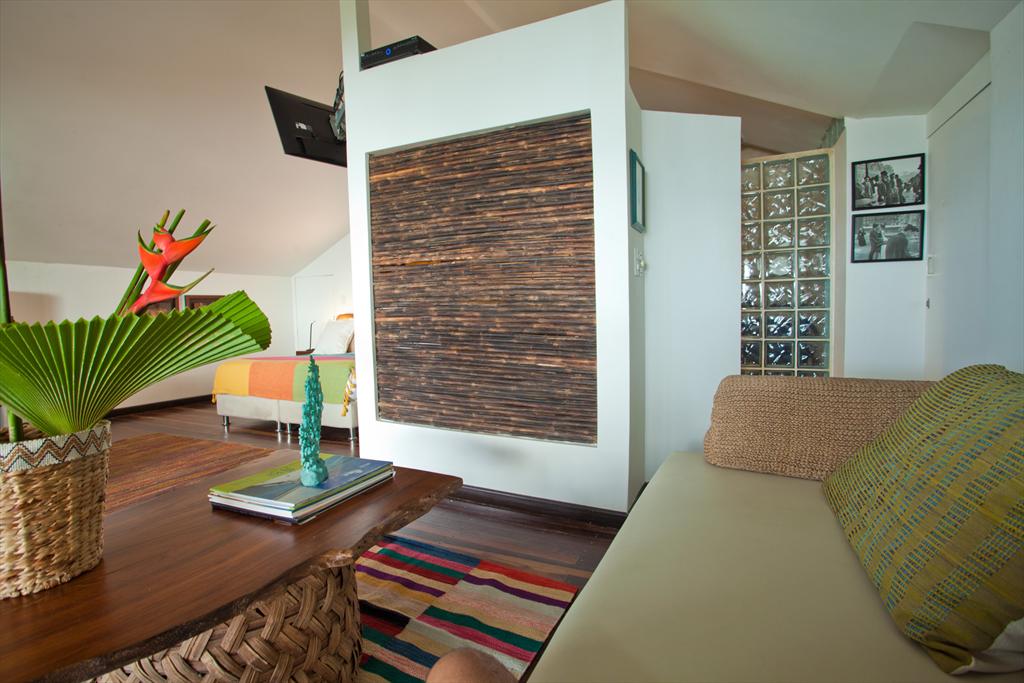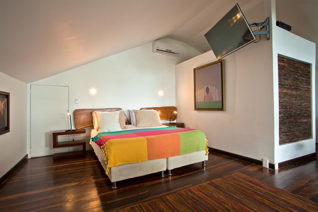 - quarto com cama king size, sofá cama, televisão, ar condicionado e banho em suite