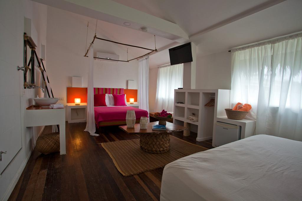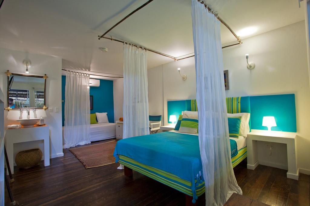 - quarto com cama de solteiro, cama de casal, televisão e ar condicionado