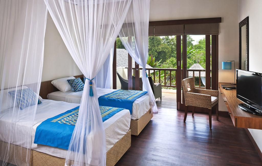 - quarto com 2 camas de solteiro, televisão, leitor de DVD, ventiladores de teto, ar condicionado e banho em suite