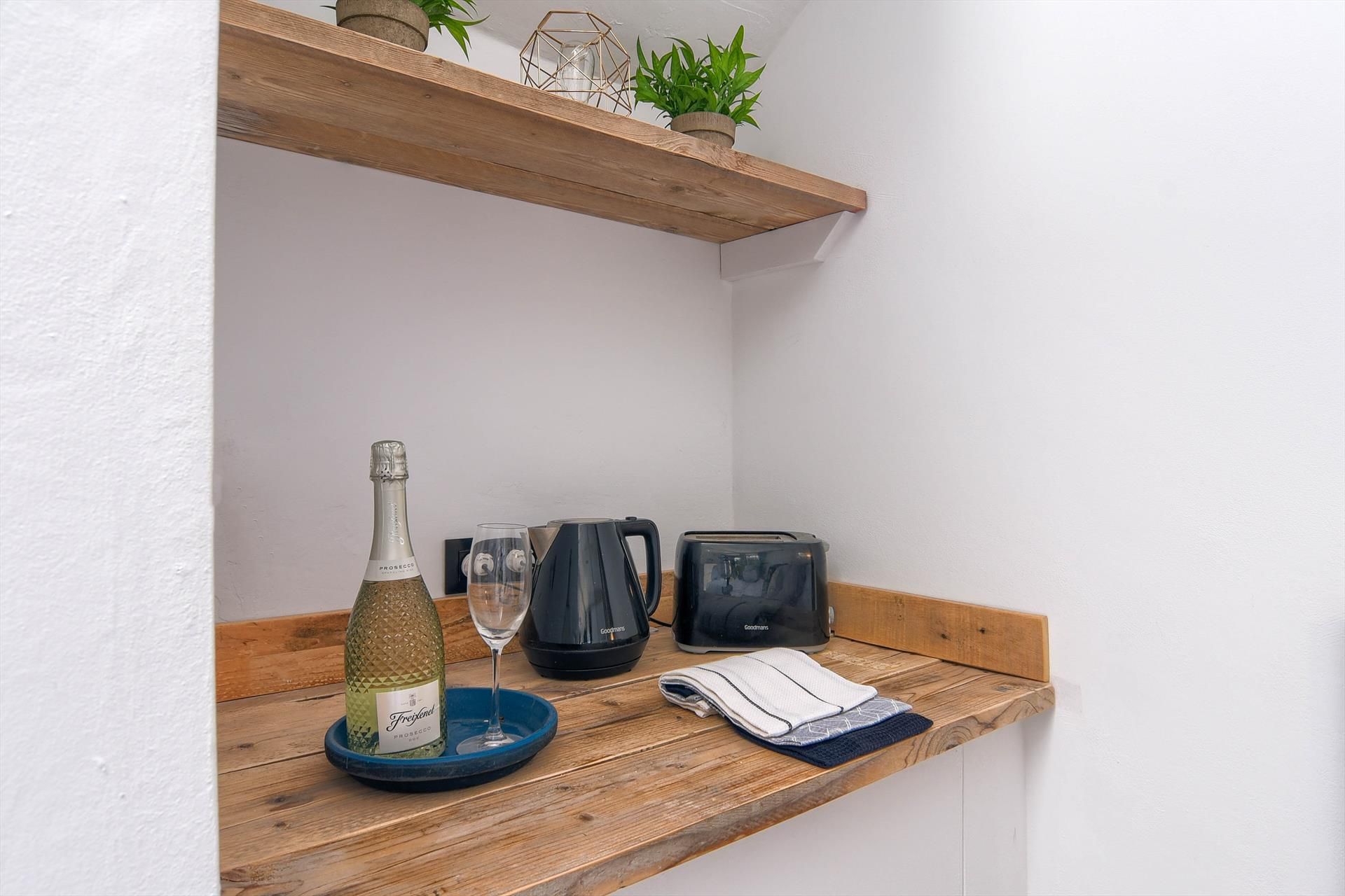• cozinha aberta com frigorífico, chaleira elétrica e torradeira