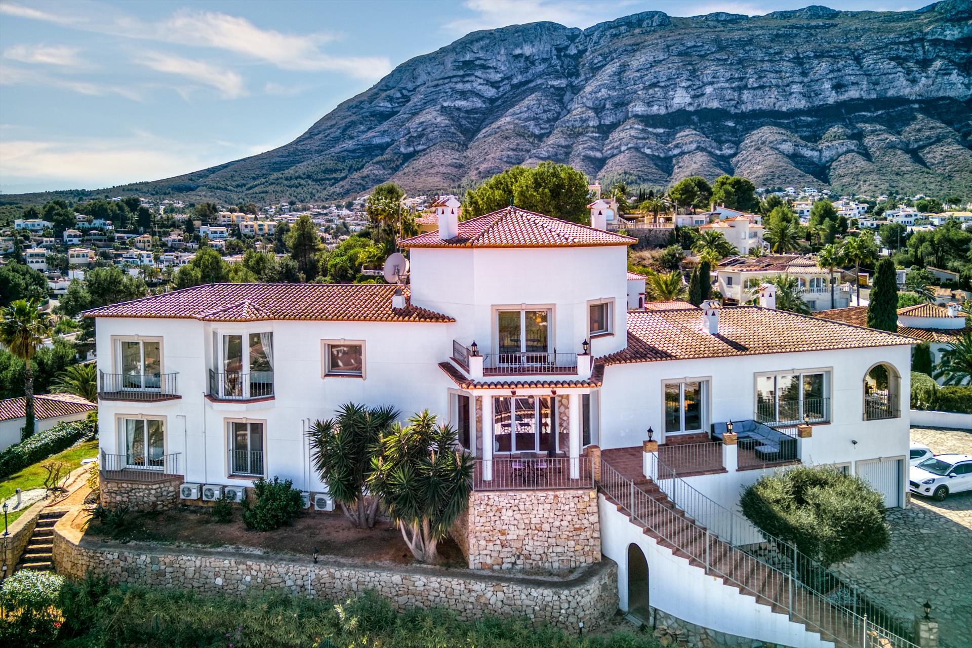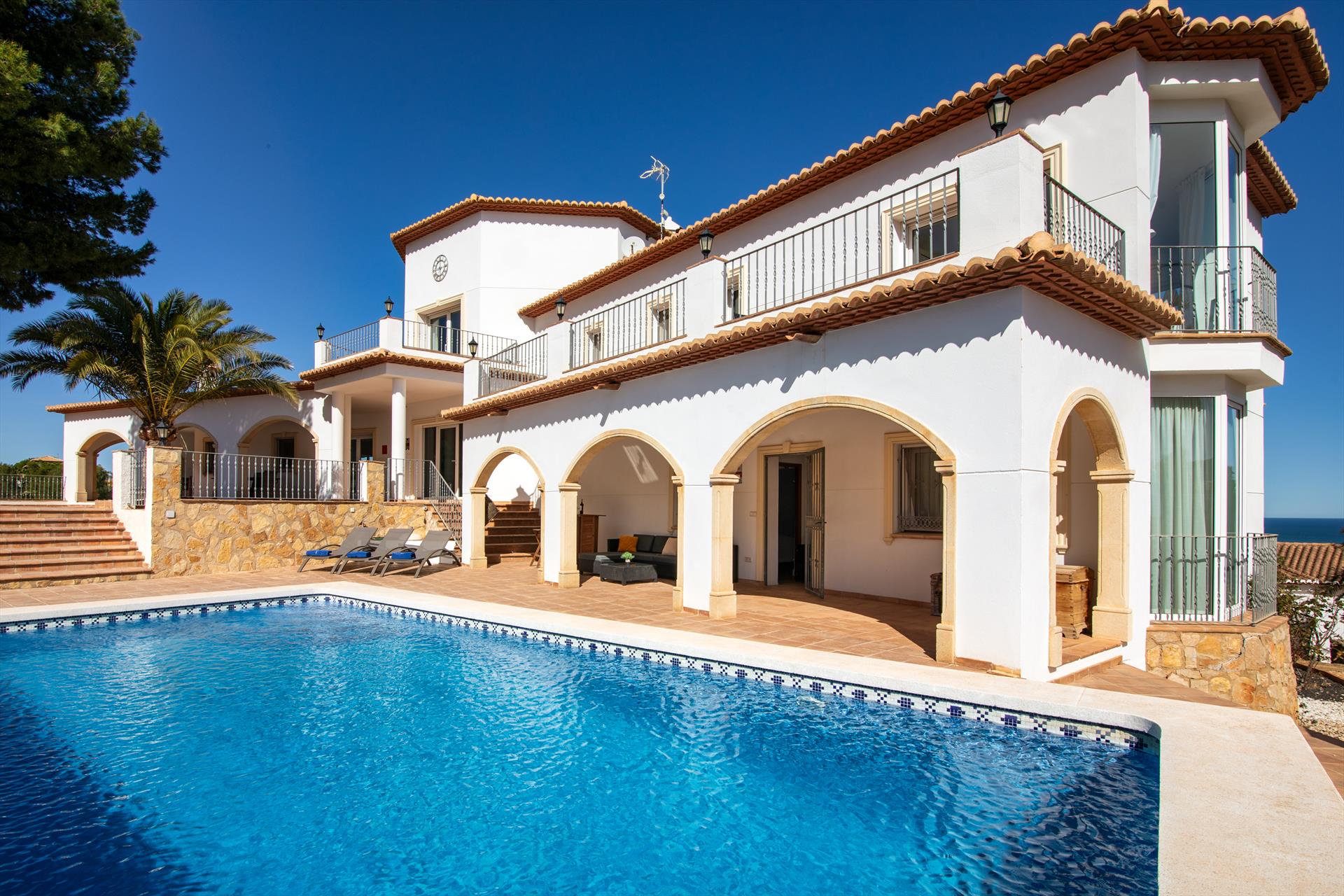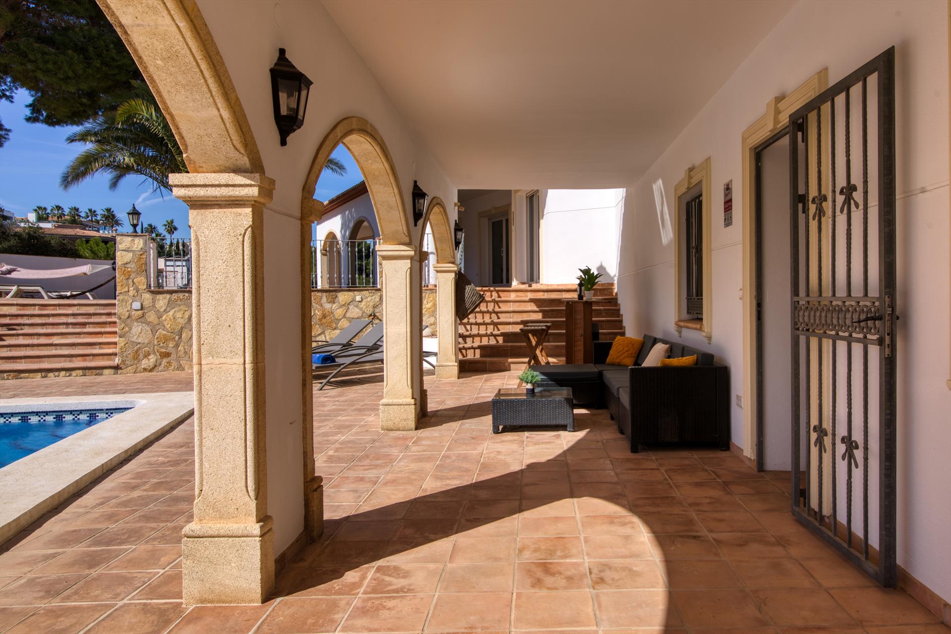 Grande e luxuosa villa em Denia, Costa Blanca, Espanha, com piscina privativa para 12 pessoas. A villa está situada em uma área urbana e montanhosa de praia, a 3 km da praia Marineta Cassiana e a 3 km do centro da cidade de Denia.