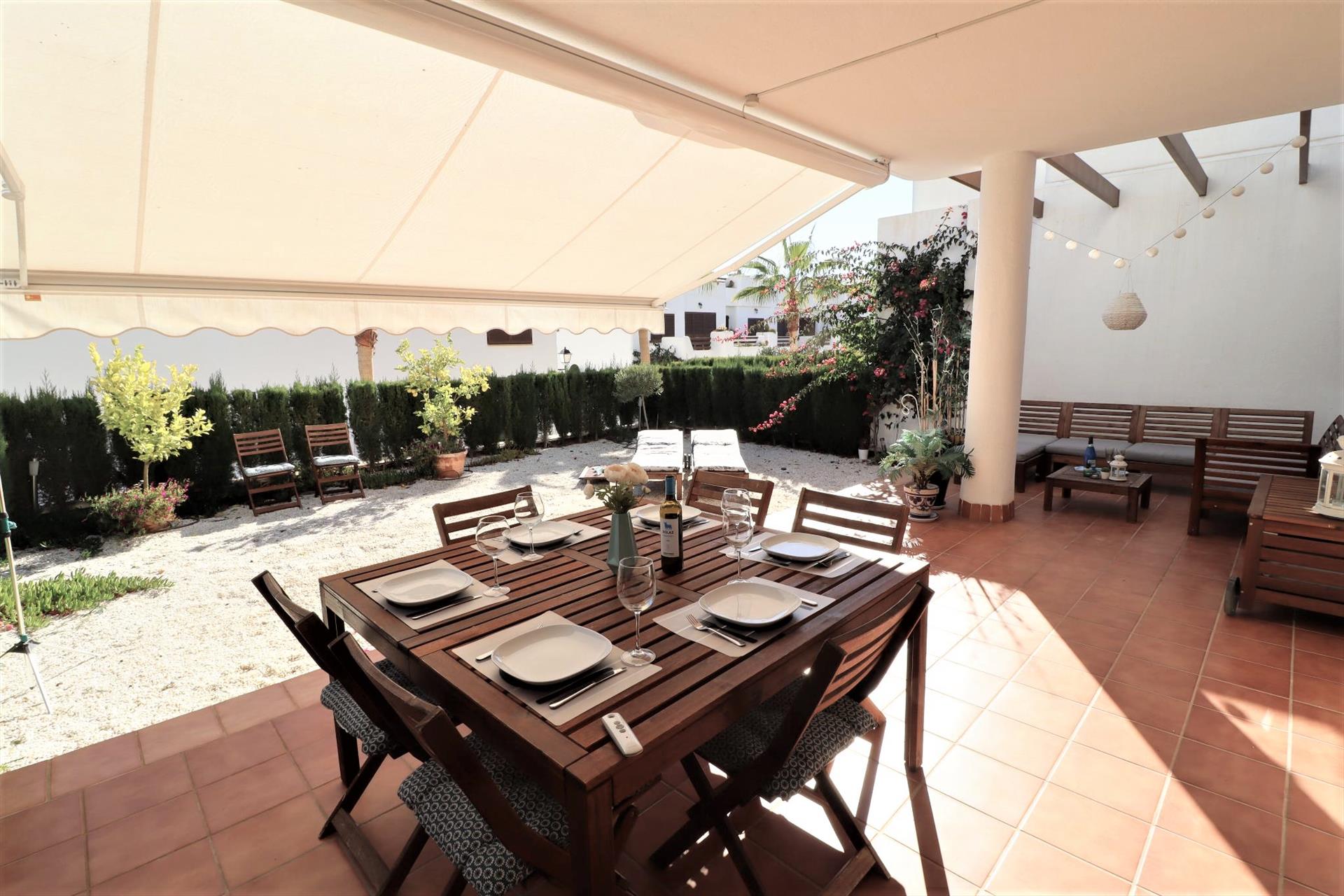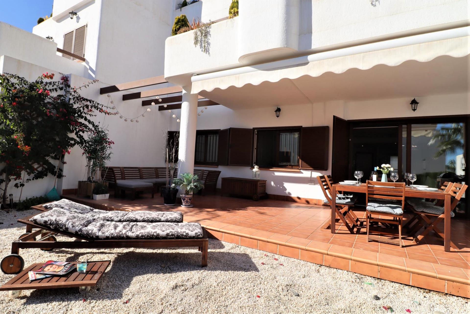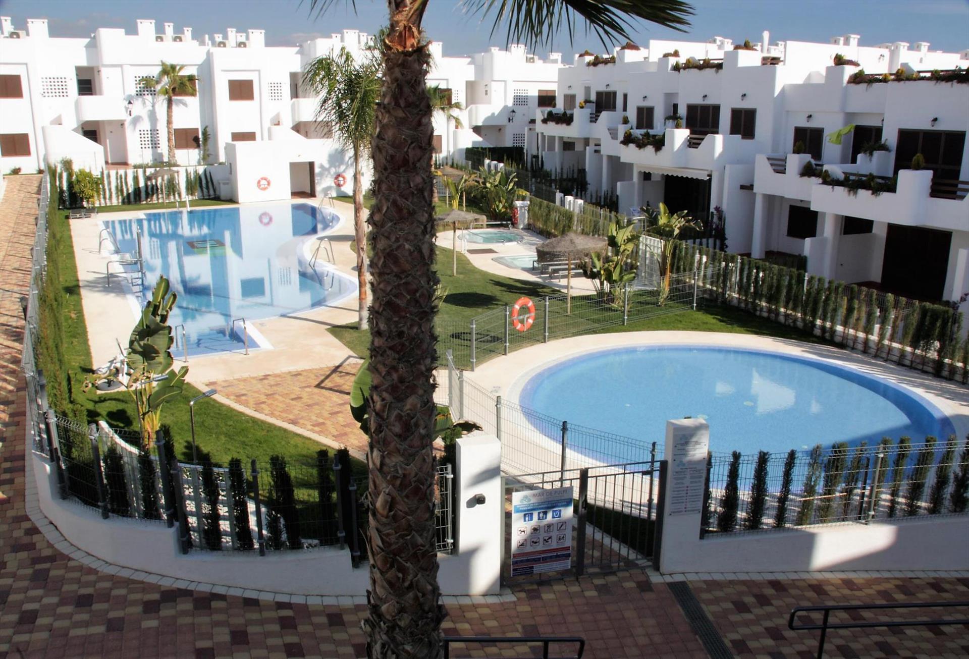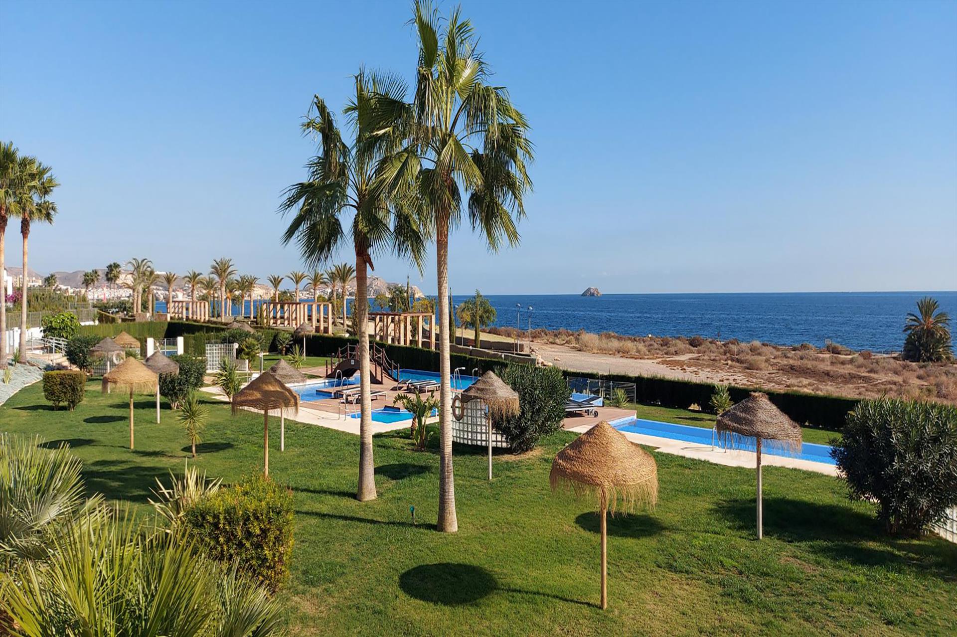 Incantevole e luminoso appartamento con piscina comune a San Juan de los Terreros, Andalusia, Spagna per 6 persone. L'appartamento è situato in un resort balneare, in una zona residenziale e montuosa vicino alla spiaggia, a breve distanza da supermercati e a 200 m dalla spiaggia.