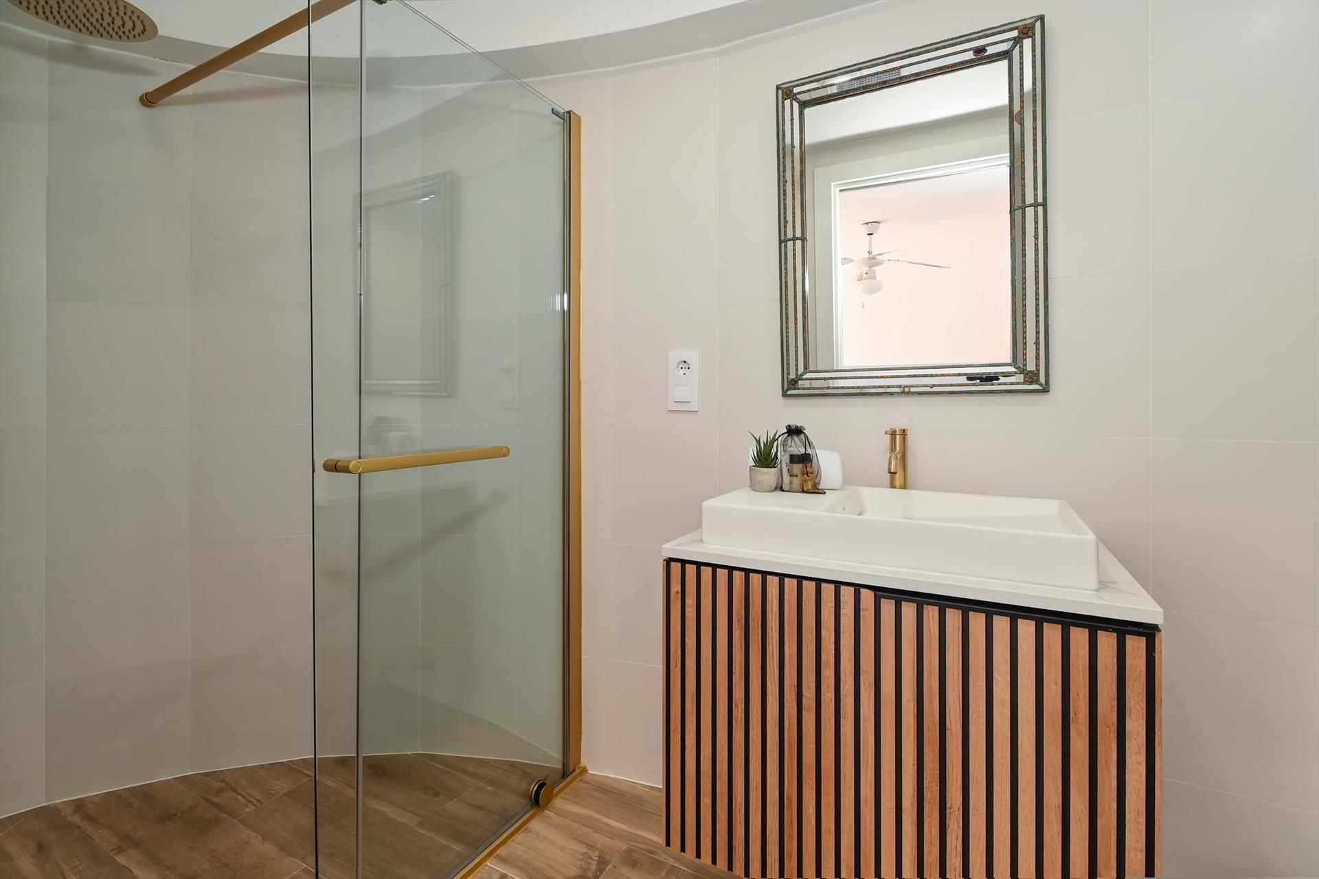• bagno en-suite con lavabo singolo, doccia e WC