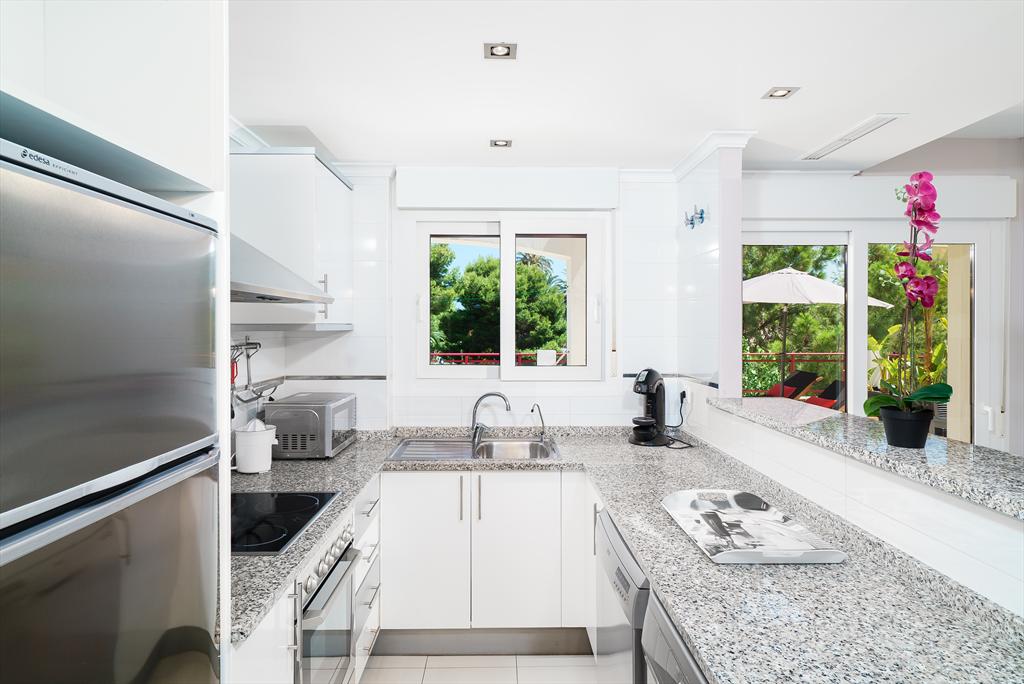 • otwarta kuchnia z elektryczną płytą grzewczą, elektrycznym piekarnikiem, kuchenką mikrofalową, zmywarką, lodówko-zamrażarką, ekspresem do kawy, mikserem, tosterem i wyciskarką do soków