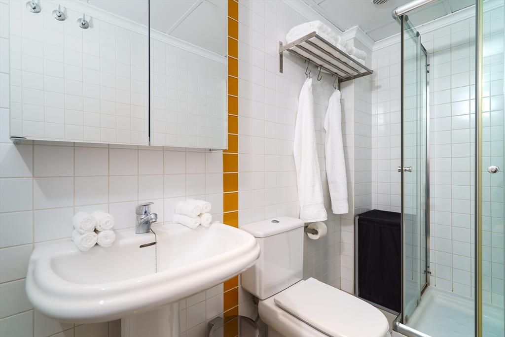 • łazienka z pojedynczą umywalką, prysznicem i toaletą