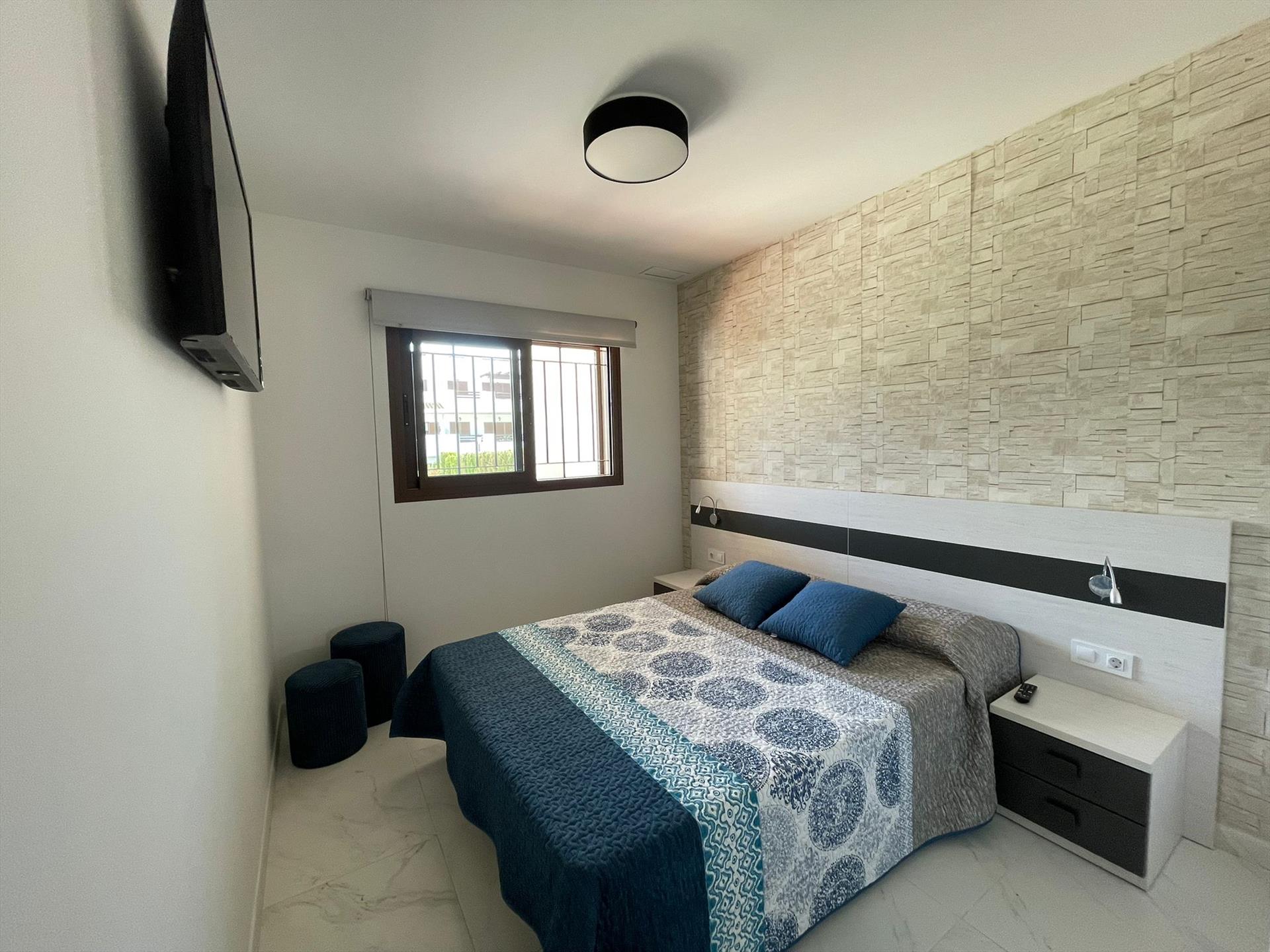 • soveværelse med aircondition, queensize seng (måler 200 x 150 cm) og fjernsyn