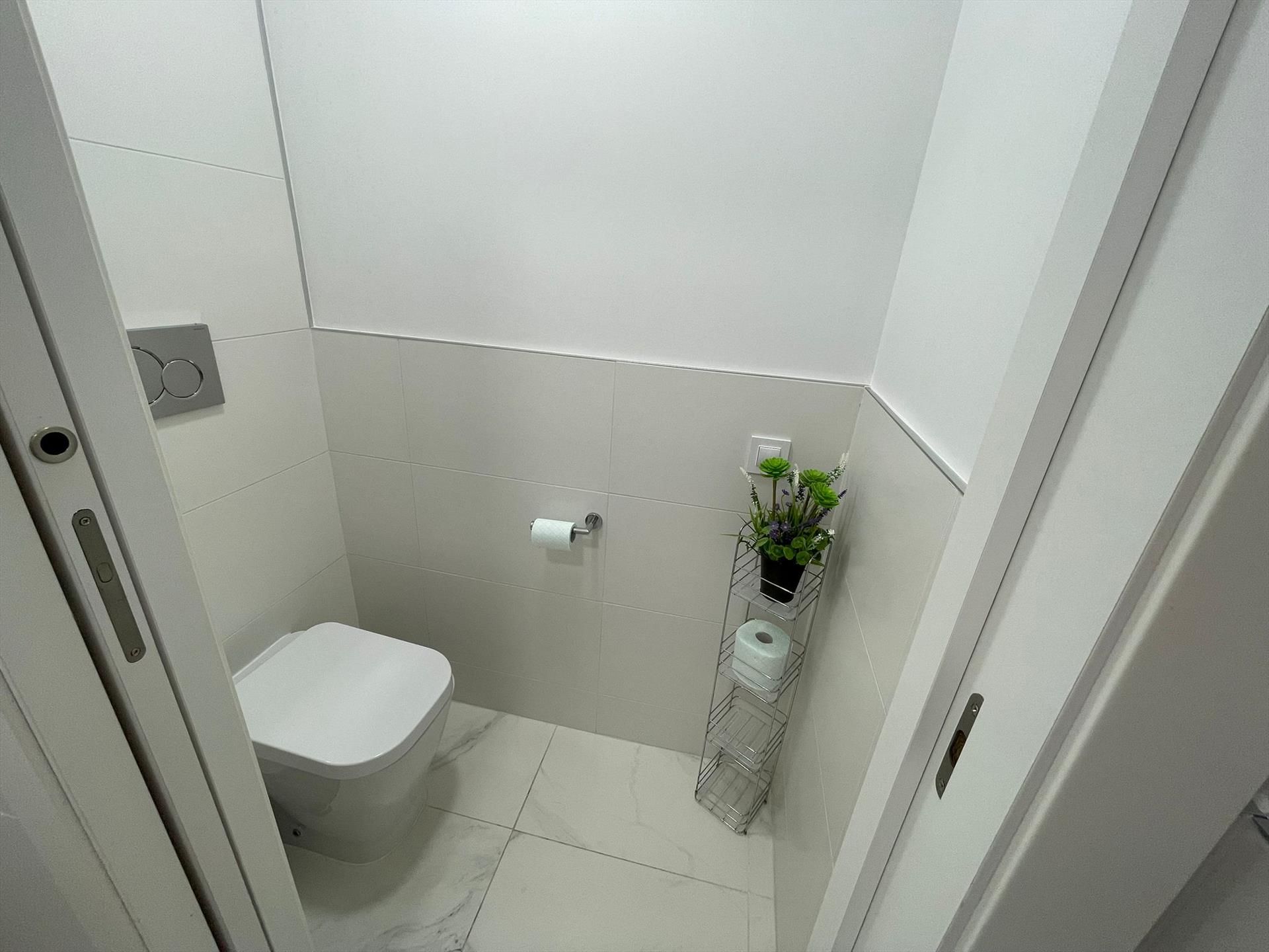 • badeværelse med håndvask, bruser, toilet og hårtørrer