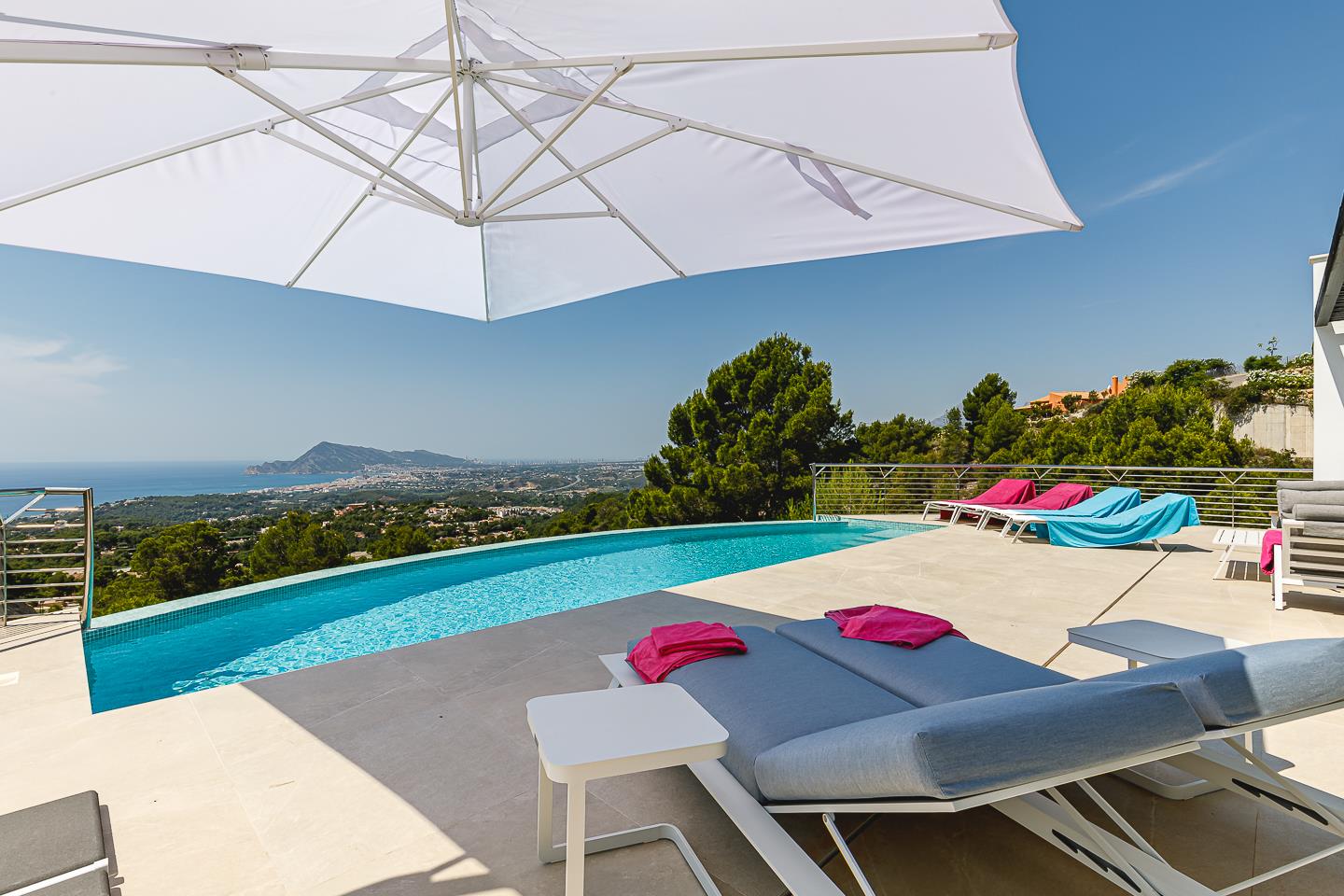Skøn og luksuriøs villa med privat pool i Altea, Costa Blanca, Spanien for 10 personer. Villaen er beliggende i et kystnært, bakket, skovrigt og beboelsesområde, og ligger 3 km fra Playa de la Olla strand.