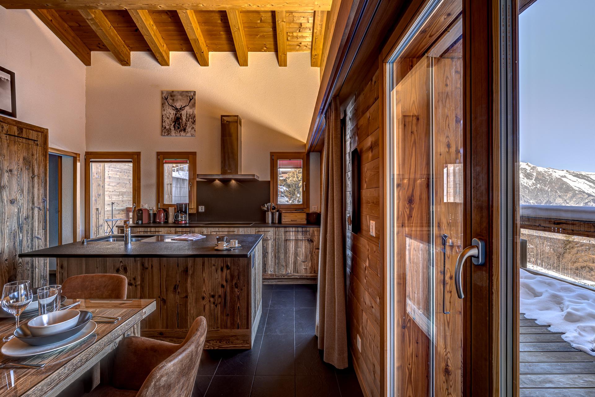 Das Hauptgeschoss dieses großen und gut ausgestatteten Chalets ist ein offener Küchen-/Wohn-/Essbereich, offen zu den Dachbalken und mit vielen Fenstern und Glastüren, von denen aus Sie die atemberaubende Aussicht bewundern können. Die Küche ist voll ausgestattet mit allem, was Sie für eine Gruppenverpflegung benötigen, darunter ein Geschirrspüler, eine elektrische Filterkaffeemaschine, eine Nespresso-Kaffeemaschine, eine Mikrowelle, ein Wasserkocher, ein Toaster, ein Kühlschrank mit Gefrierfach, ein Ofen, ein Dampfgarer und ein Kochfeld. Es gibt Fondue- und Raclette-Sets für einen traditionellen Schweizer Abend vor dem Holzfeuer. Eine separate Speisekammer enthält einen zusätzlichen großen Kühlschrank mit Gefrierfach und Eismaschine. Waschmaschine, Trockner, Bügeleisen und Gasgrill stehen Ihnen zur Verfügung.