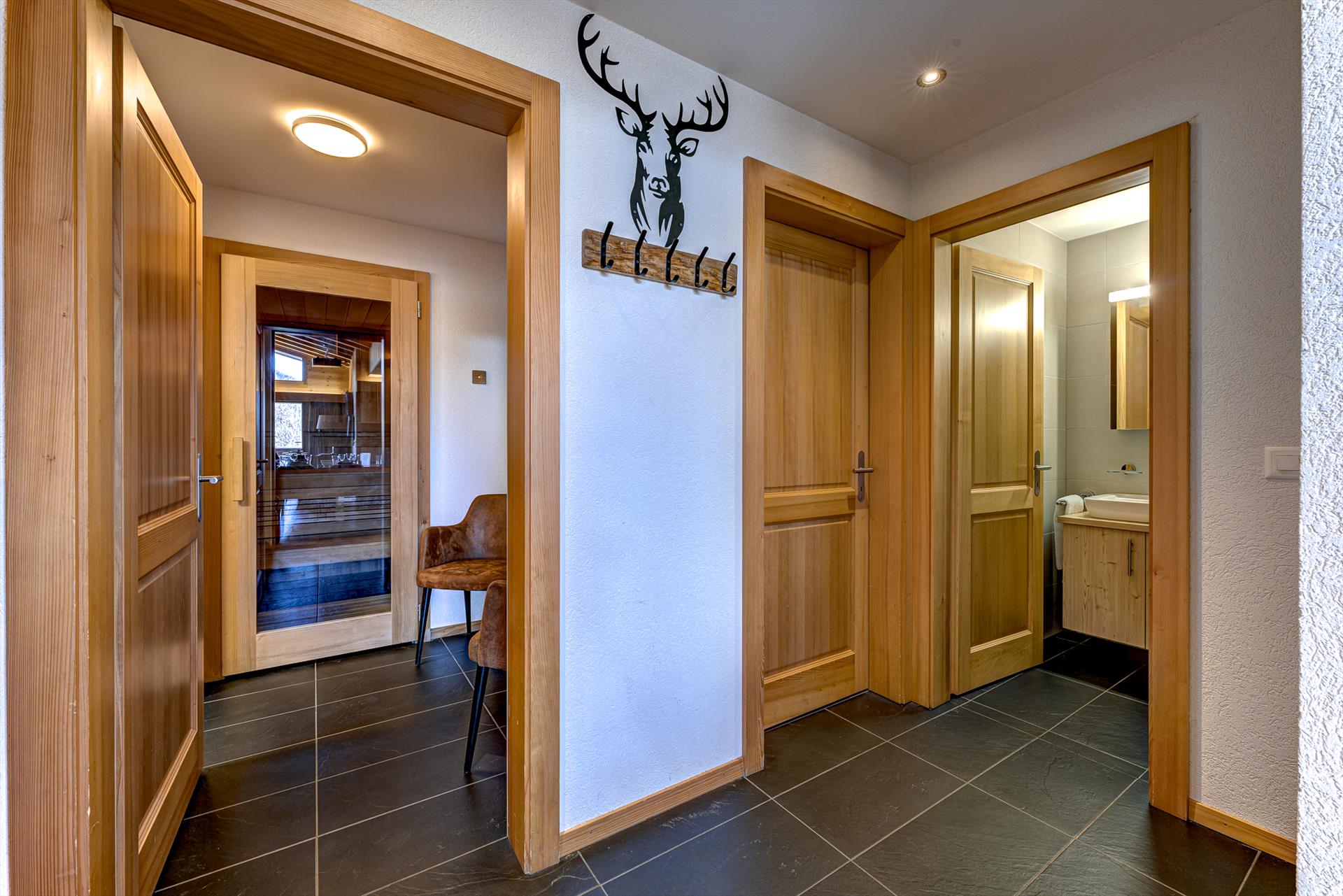 - Ein praktischer begehbarer Garderobenbereich im großen Eingangsbereich hilft Ihnen, Ihre gesamte Bergkleidung und Ausrüstung geordnet aufzubewahren. Es gibt jede Menge Haken für Ihre Outdoor-Kleidung und viel Platz im Kleiderschrank.