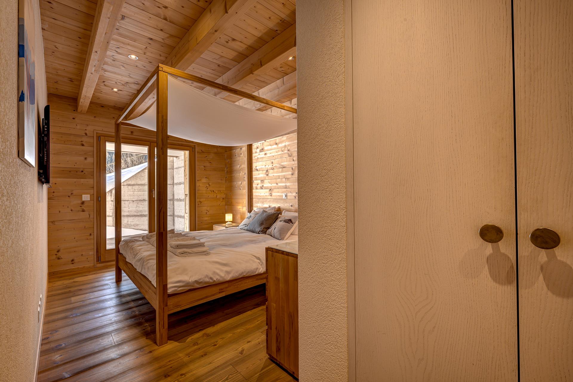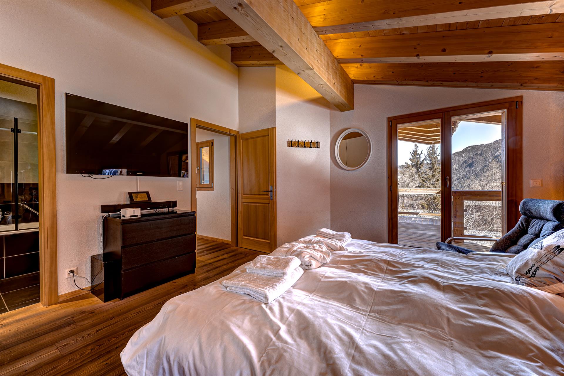 - großes Schlafzimmer mit Kingsize-Bett (200 x 180 cm), Fernseher, großem Kleiderschrank und Kommode. Die großen Glastüren zur Terrasse bieten einen herrlichen Blick auf die Berge.