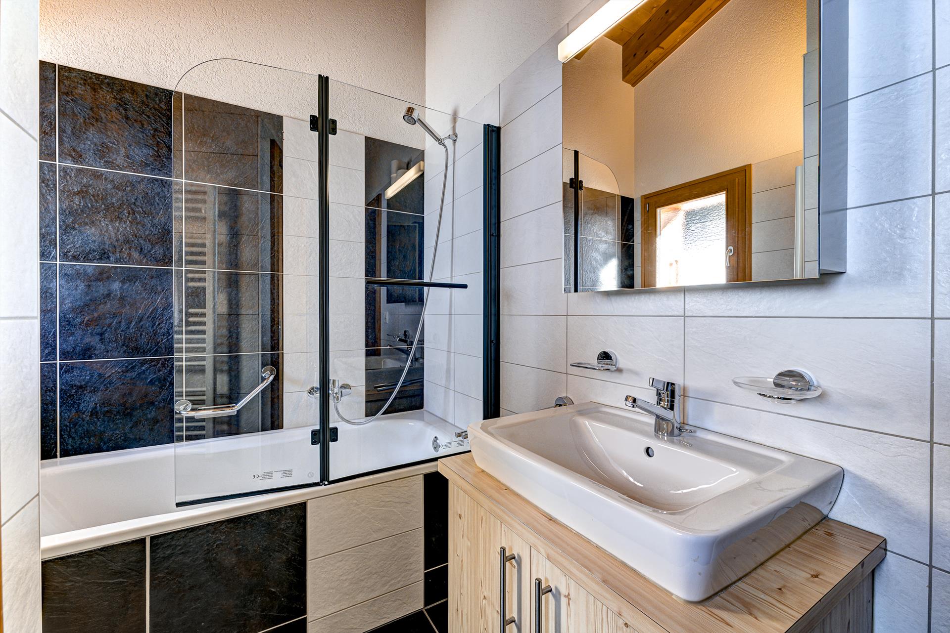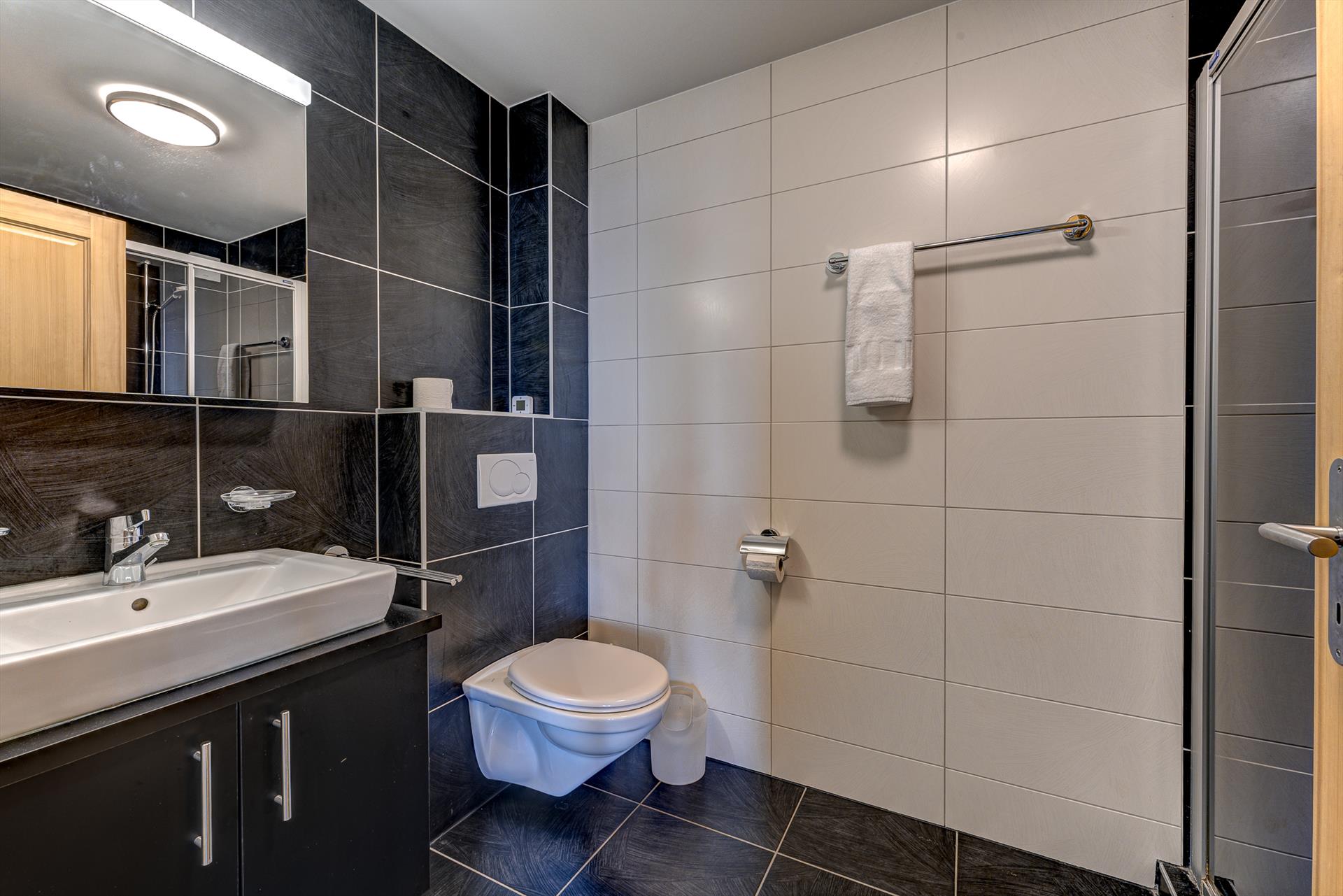 - Bad mit Einzelwaschbecken, Badewanne/Duschkombination, Toilette und Haartrockner.