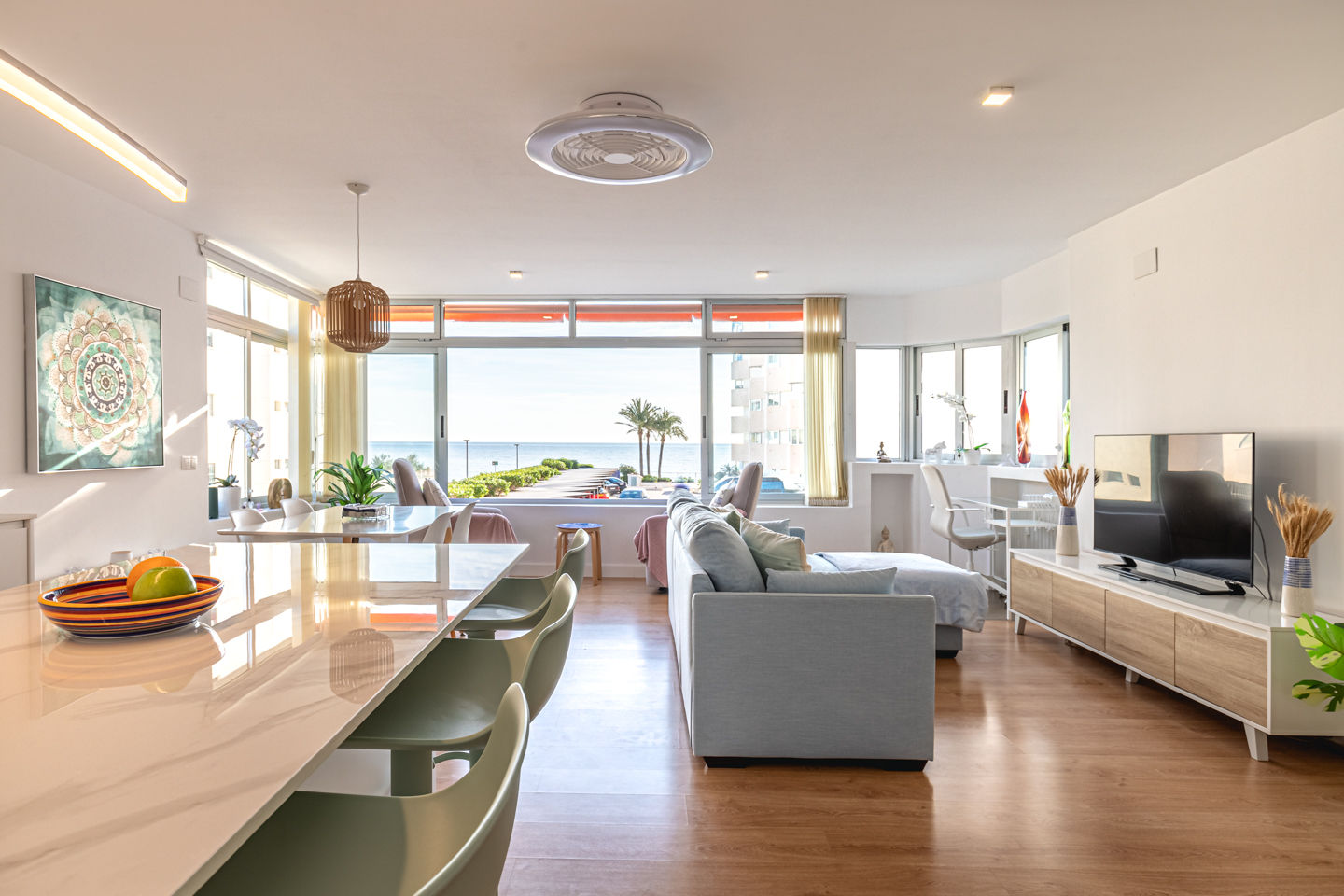• Wohnzimmer mit Klimaanlage, Fernseher, Schlafsofa und Deckenventilator