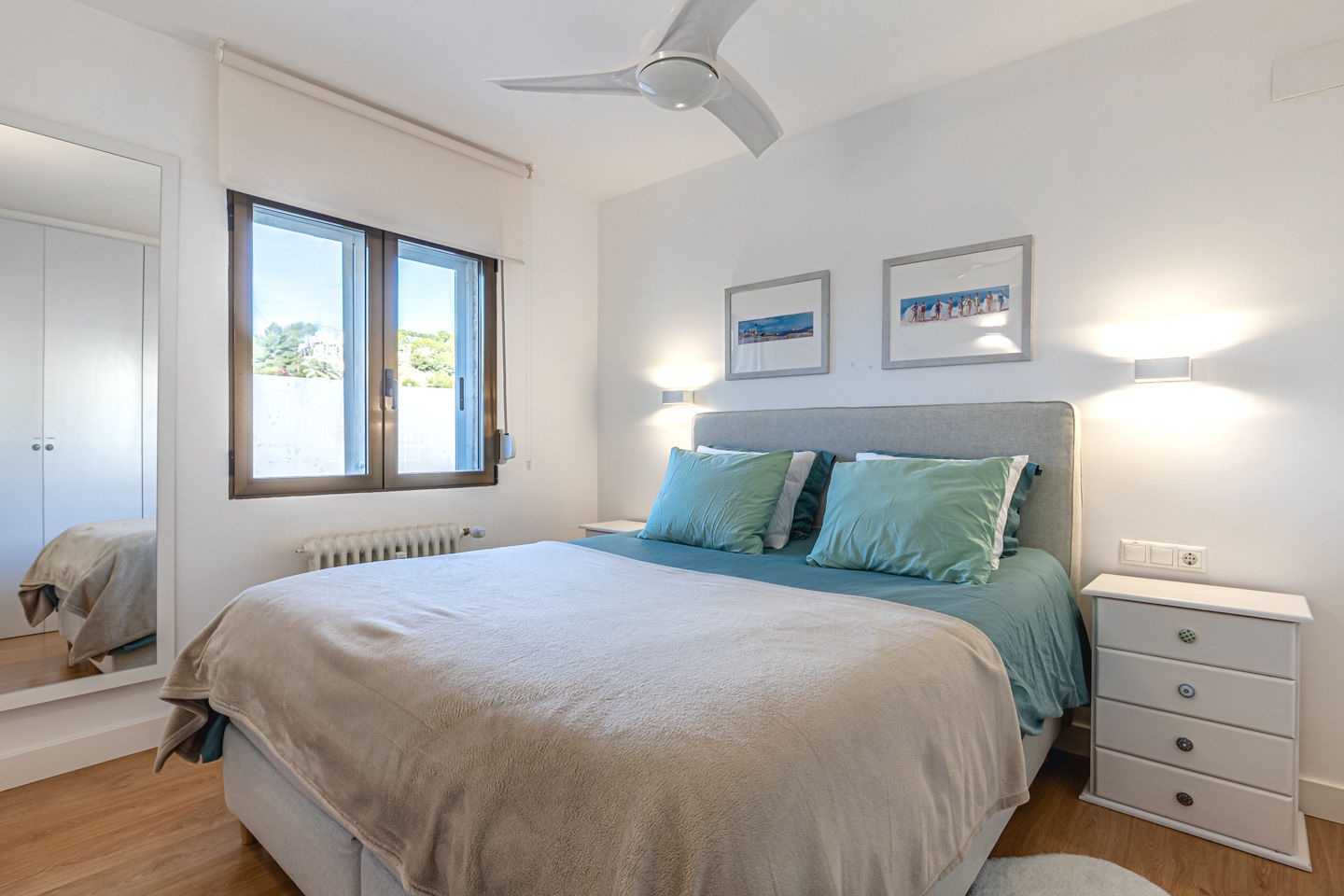 • Schlafzimmer mit Klimaanlage und Queensize-Bett (200 x 160 cm) und Ventilator