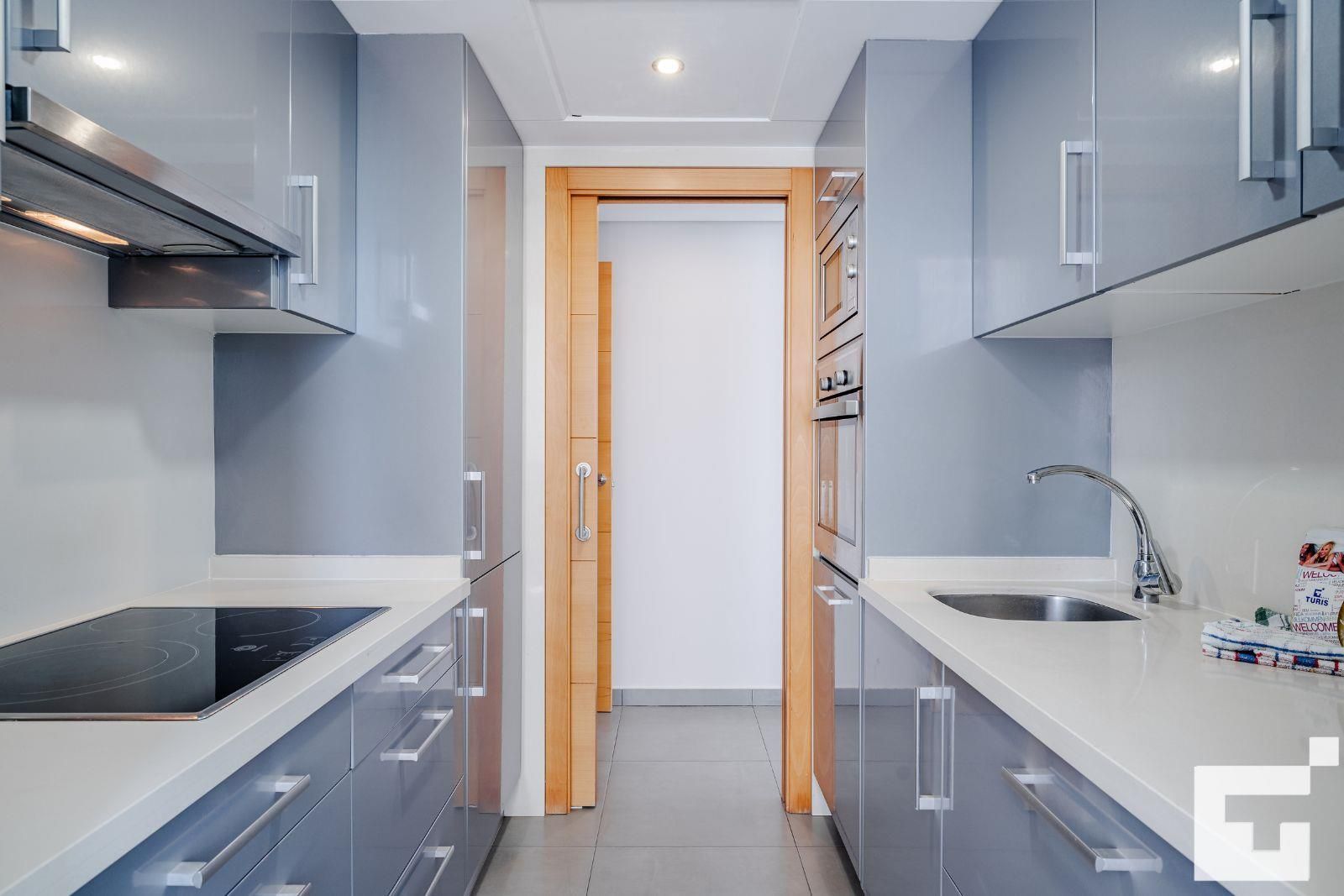 🍳 Voll ausgestattete Küche mit Cerankochfeld, Backofen, Geschirrspüler, Mikrowelle, Kühlschrank und Hauswirtschaftsraum mit Waschmaschine.