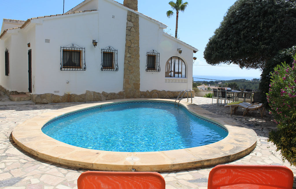 Schöne und komfortable Villa in Moraira, Costa Blanca, Spanien, mit einem privaten Pool für 6 Personen. Das Haus befindet sich in einer hügeligen Wohngegend und ist 3 km vom Strand Ampolla Moraira entfernt.