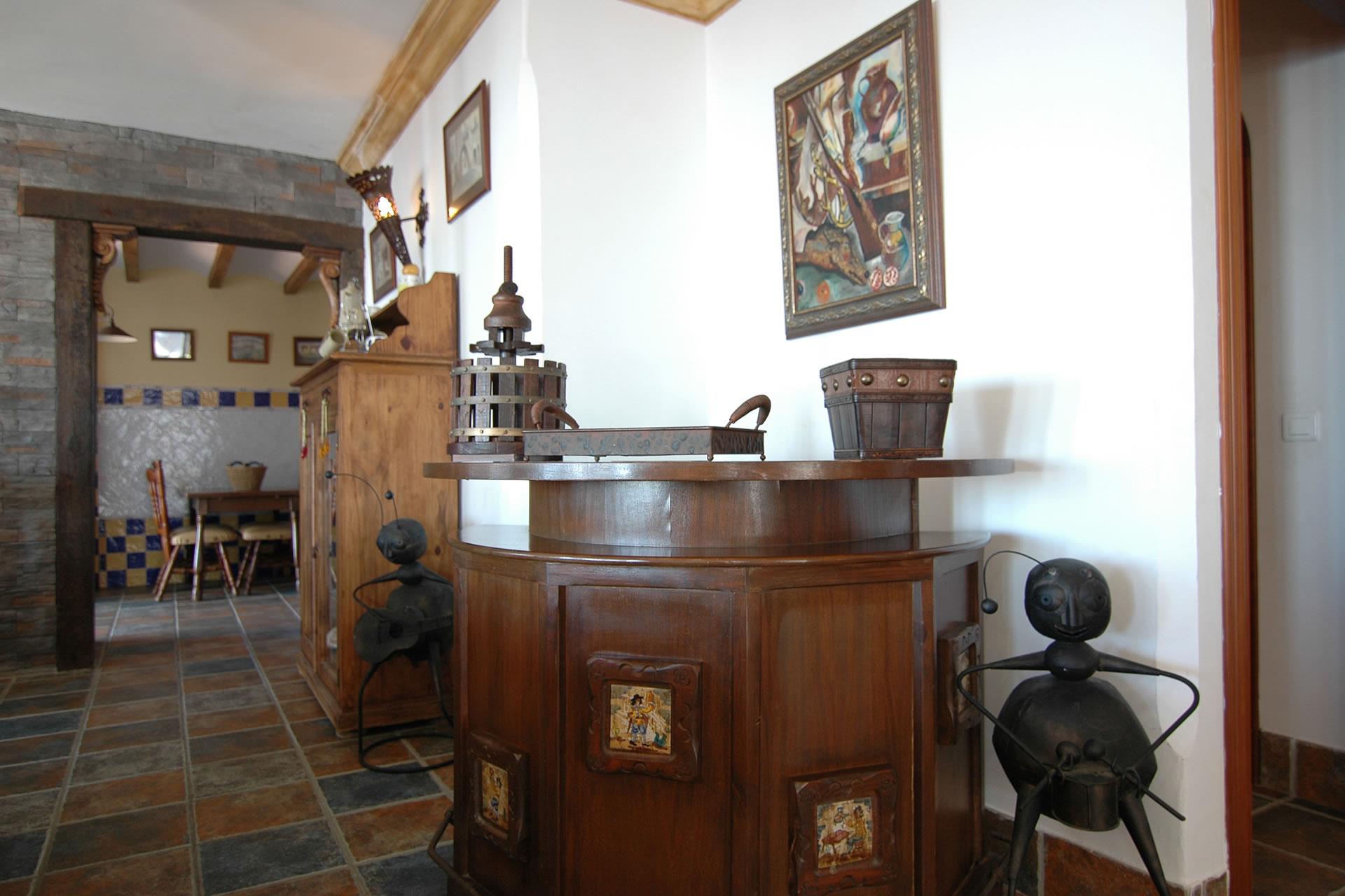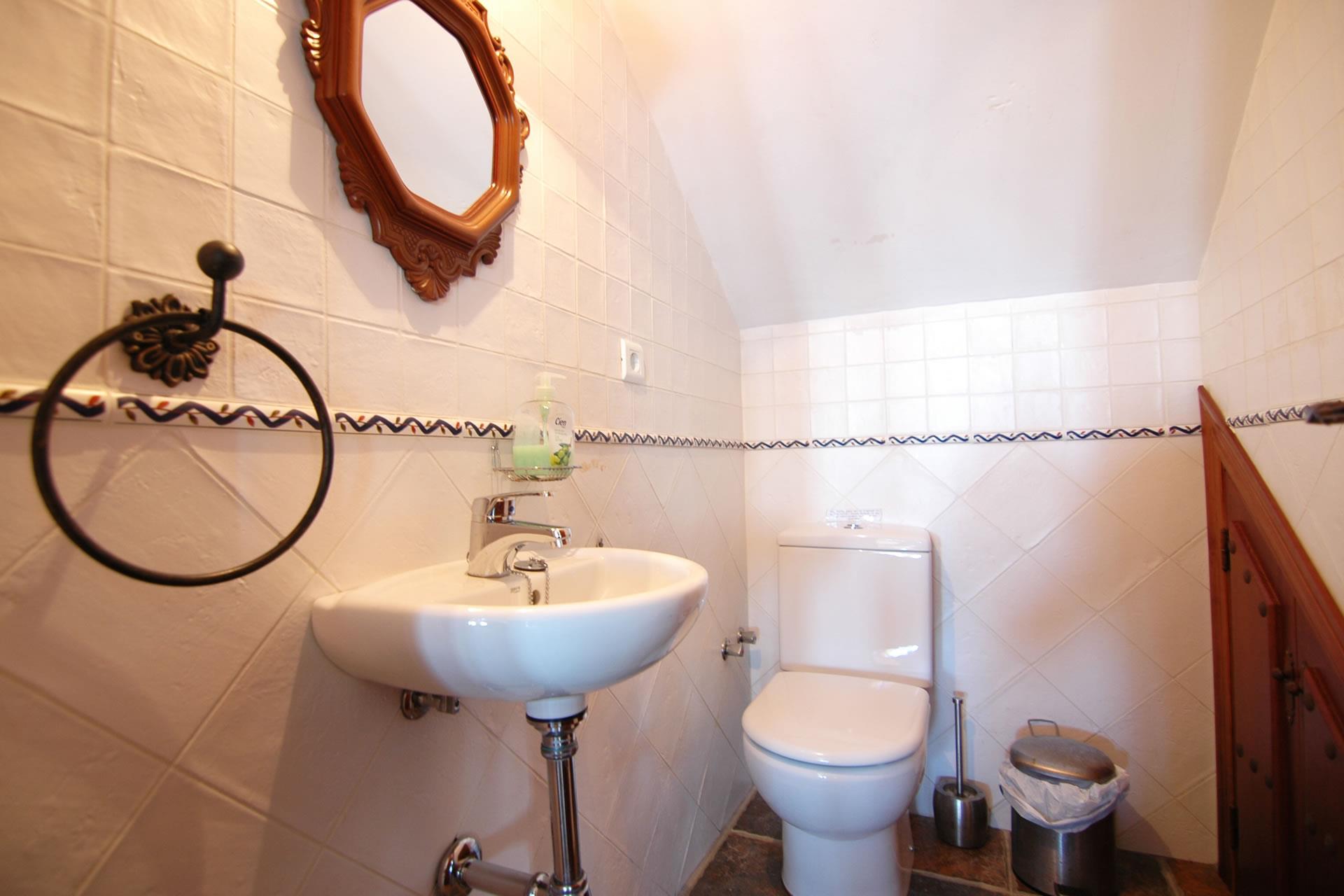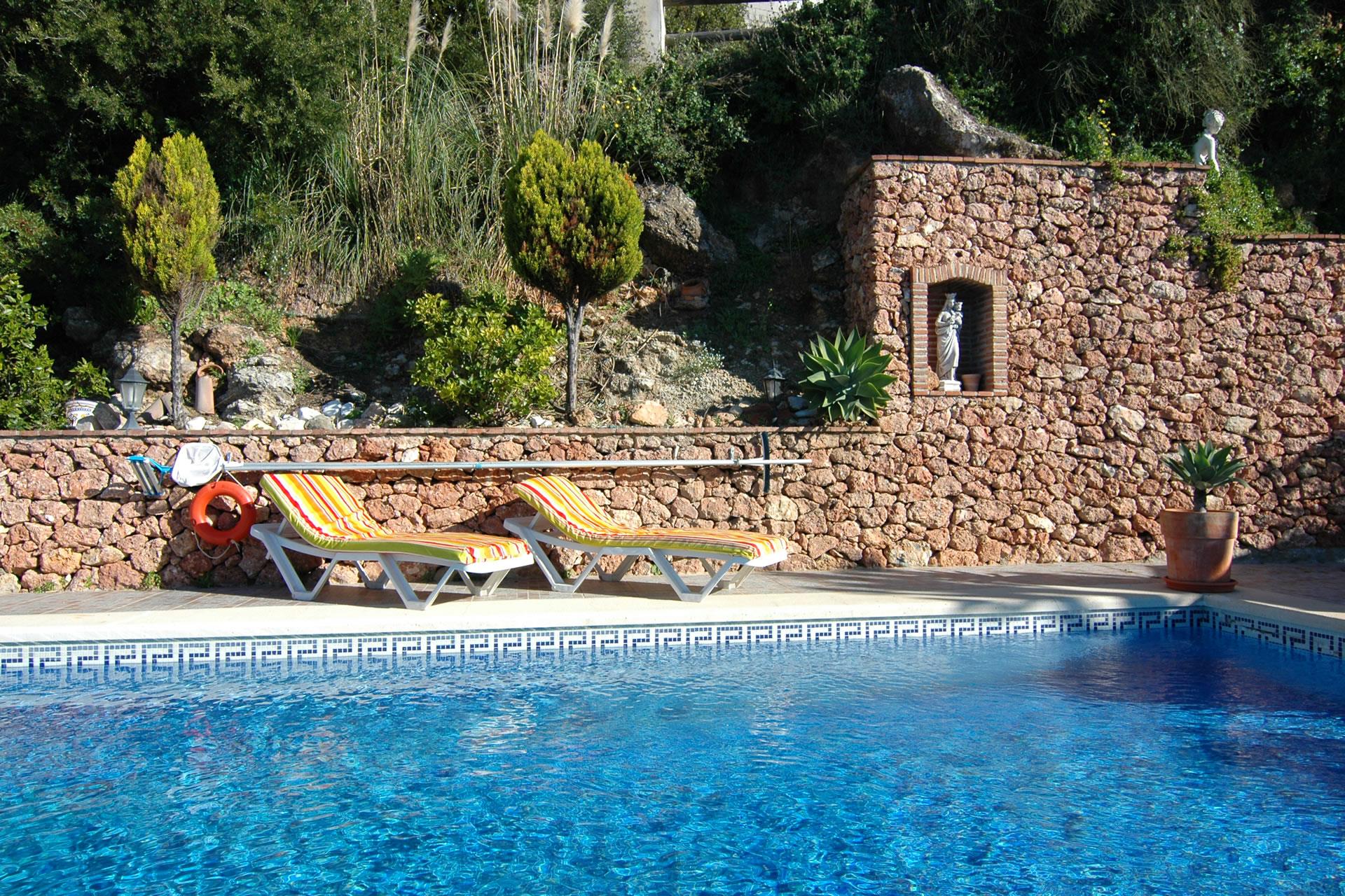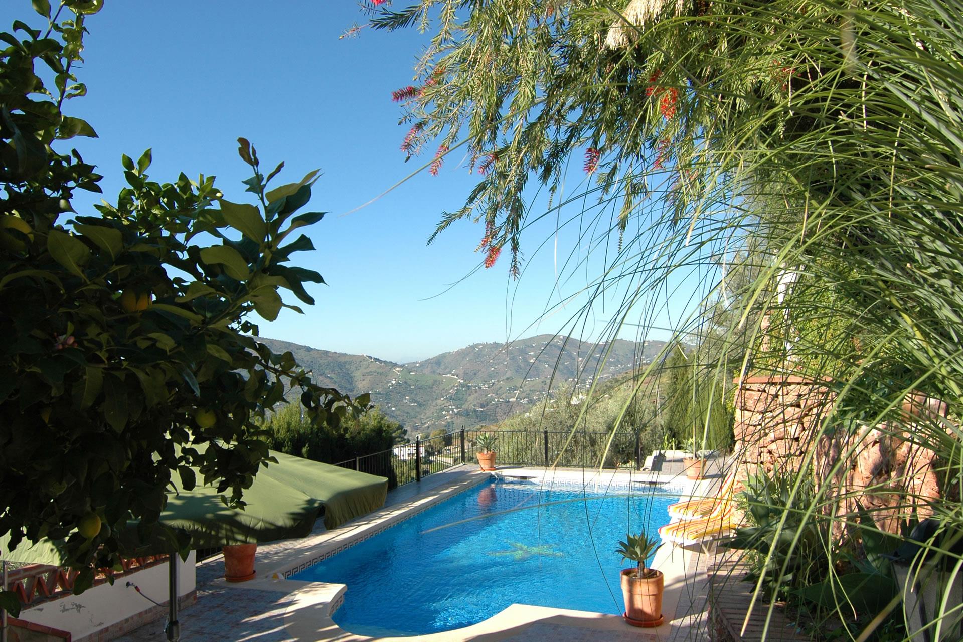Diese schöne Doppelhaus-Villa ist über eine kurvige, befestigte Landstraße zu erreichen, und doch sind es weniger als 10 Autominuten bis nach Frigiliana (4,0 km) und nur 20 Minuten bis zur Küste von Nerja und deren Sandstrände (11 km). Bei der Ankunft wird Ihr Auge unweigerlich von der herrlichen Aussicht über die umliegende Landschaft bis hinunter zum Mittelmeer angezogen. Die Anlage hat mehrere große Terrassen und Sitzecken, während der Pool von einem Garten voller Blumen, Pflanzen, Sträuchern und Bäumen umgeben ist. Der private Pool im römischen Stil befindet sich in einem umzäunten Bereich, um Sicherheit für Kinder zu garantieren, und hat bemerkenswerte Ausmaße: 10m x 5m und 1m bis 2,50m tief. Der Grillplatz ist mit Gartenmöbeln ausgestattet und der richtige Ort, um Ihre Gäste abends bei einer kühlen Sangria unter dem Sternenhimmel zu bewirten. Auf der Pool-Terrasse verfügen Sie über eine Dusche im Freien.