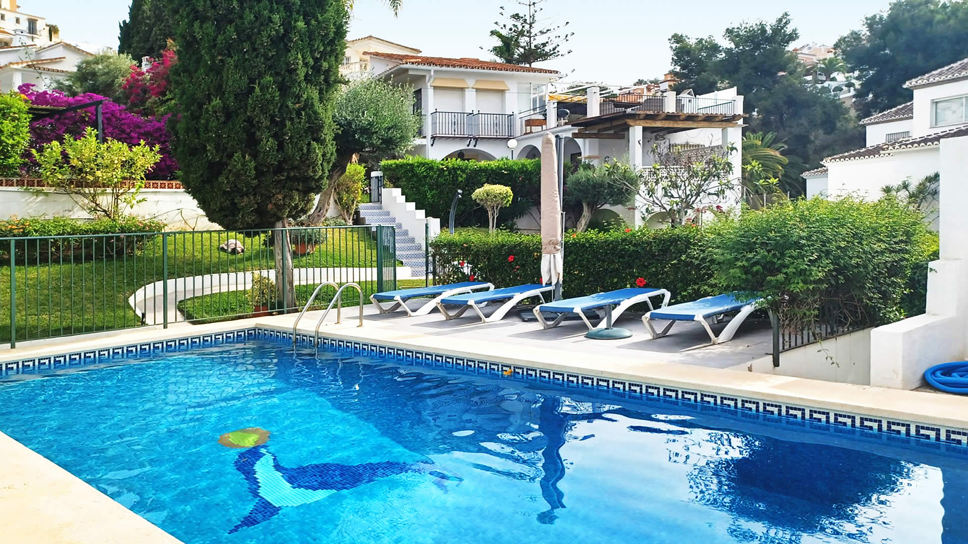 Gleich in der Nähe befindet sich der Naturpark Acantilados de Maro, mit einer Reihe dramatisch hoher Steilkliffs, mehreren abgelegenen Strandbuchten und sogar einem kleinen Wasserfall. Nähert man sich den Kliffs vom Meer aus, hat man einen einzigartigen Blick auf diese unglaubliche, unberührte Küstenlandschaft. Sollten Sie das Strandleben vorziehen, dann dürfen Sie auf keinen Fall den pescaito frito auslassen, der in verschiedenen traditionellen chiringuitos (typische Strandrestaurants) serviert wird. Es wäre allerdings kein Wunder, wenn es Ihnen schwerfiele sich von dem großen üppig bewachsenen Garten (1000m2) dieser Villa loszureißen, wo Sie auf verschiedenen Ebenen gemütliche Sitzecken und einen Swimmingpool (9x4 m) haben. Grill und 7 Sonnenliegen sind vorhanden. Die Villa hat 3 Parkplätze für Autos. Zum Strand und seinen zahlreichen Annehmlichkeiten sind es nur 5 Minuten zu Fuß. Sollten Sie in das Stadtzentrum von Nerja wollen (1,2 km), nehmen Sie am besten das Auto oder ein Taxi.