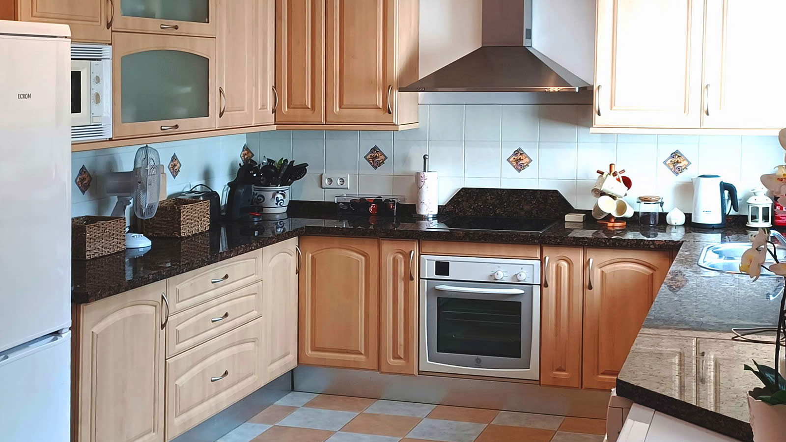 Die Räume der Villa sind in einer attraktiven Weise auf 2 Ebenen verteilt. Im Erdgeschoss haben Sie eine Eingangshalle, ein Wohnzimmer mit offenem Kamin und eine große Küche mit Kühlschrank/Gefrierfach, Ceranfeld mit 4 Kochstellen, Mikrowelle, elektrischem Backofen, Geschirrspüler und einem Esstisch für 4 Personen. Auf dieser Ebene befindet sich auch ein Schlafzimmer mit zwei Einzelbetten. Der erste Stock hat 4 Schlafzimmer (3 mit Doppelbett, eins mit zwei Einzelbetten) sowie ein vollausgestattetes Badezimmer. Eines der Doppelzimmer hat eine eigene Dusche. Diese Etage besitzt auch ein geräumiges Wohnzimmer mit Satellitenfernsehen und Musikanlage mit CD-Player. Der Esstisch befindet sich auf der Außenterrasse, denn Sie werden ganz bestimmt nicht drinnen essen wollen!