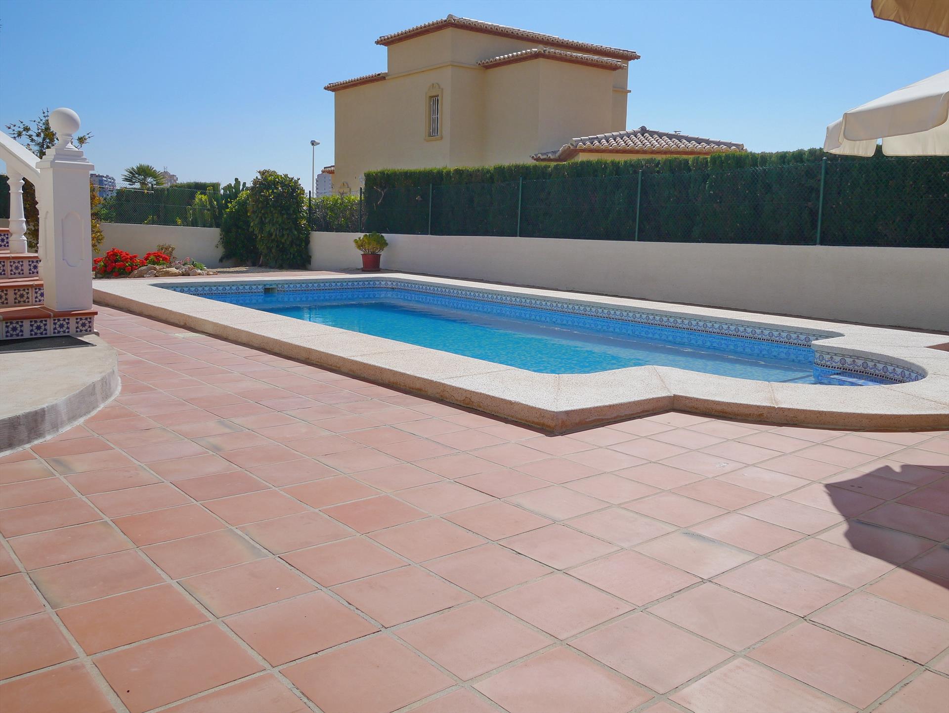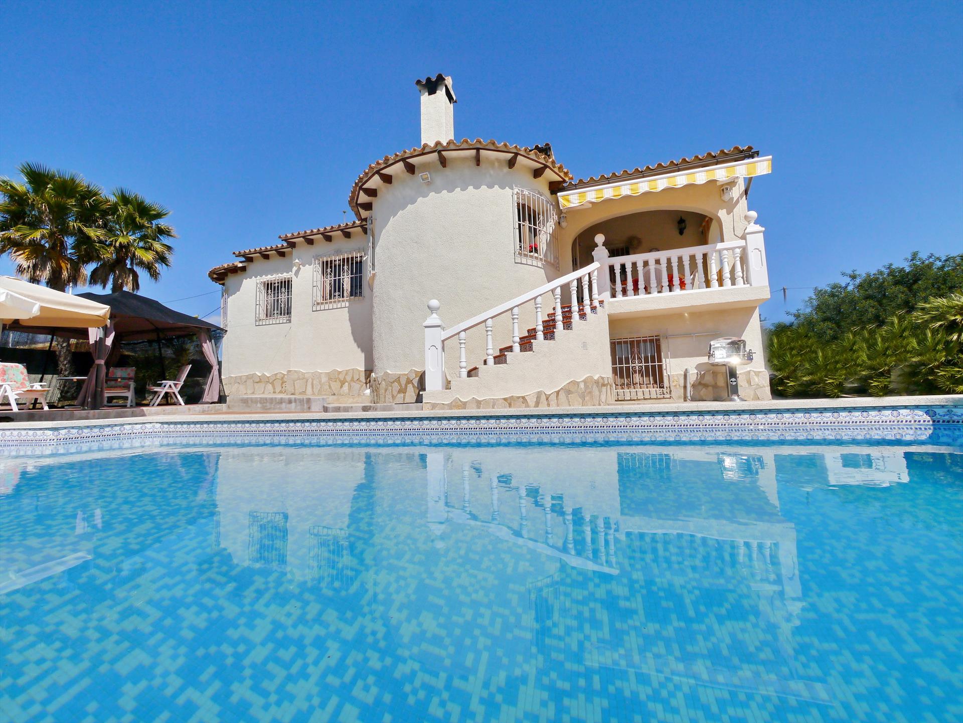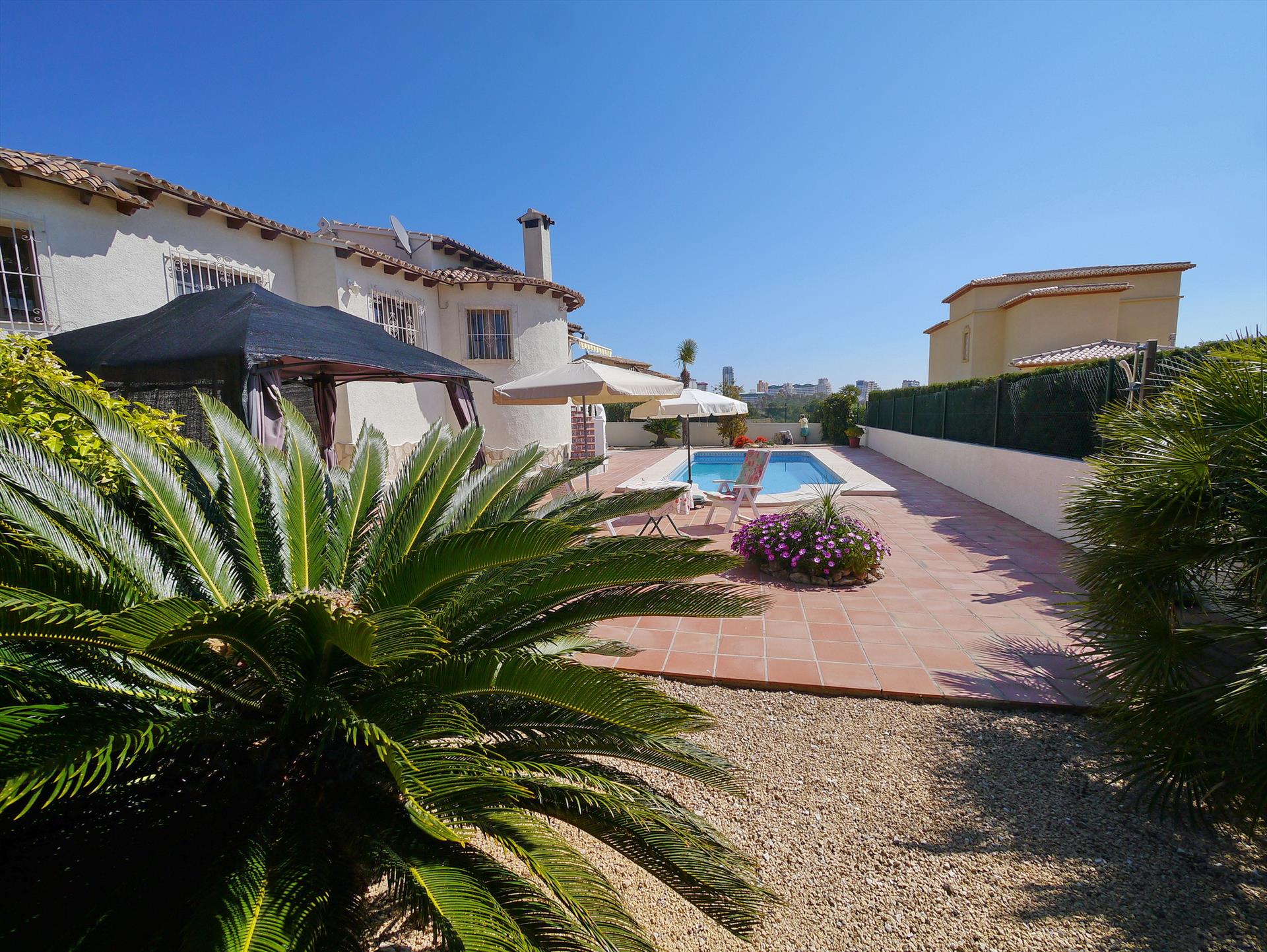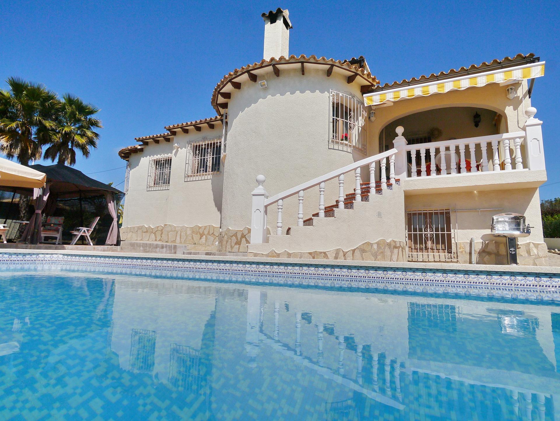 Stor og komfortabel villa i Calpe, Costa Blanca, Spania med privat svømmebasseng for 6 personer. Huset ligger i et boligområde nær stranden, tett på restauranter og barer, butikker, supermarkeder og en tennisbane, 1 km fra Arenal-Bol-stranden, 10 km fra Moraira, Benissa og 0,05 km fra Las Salinas.