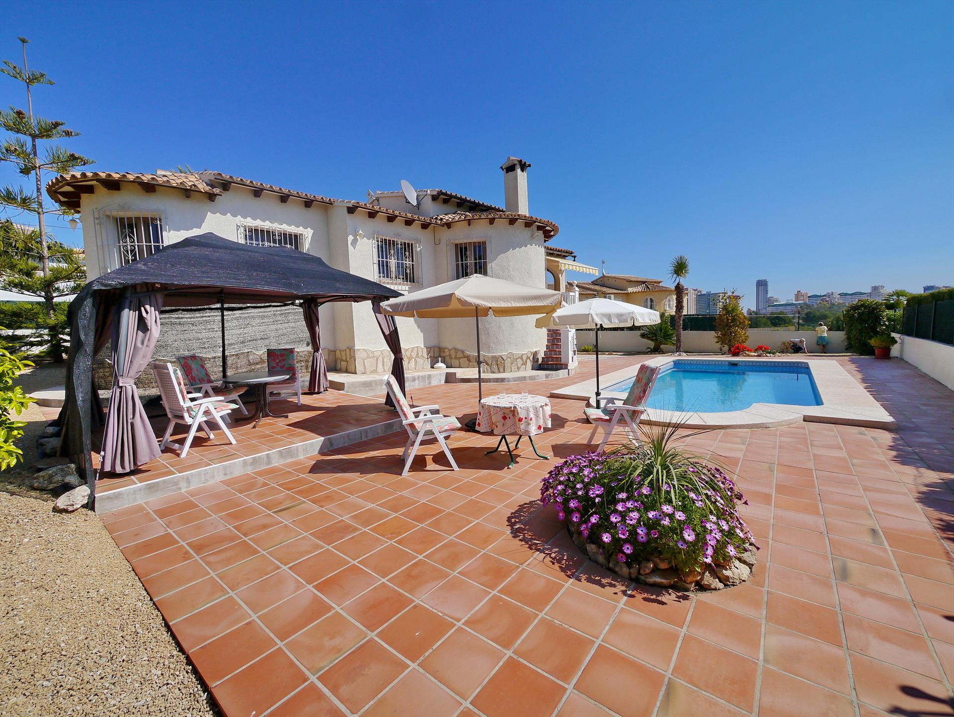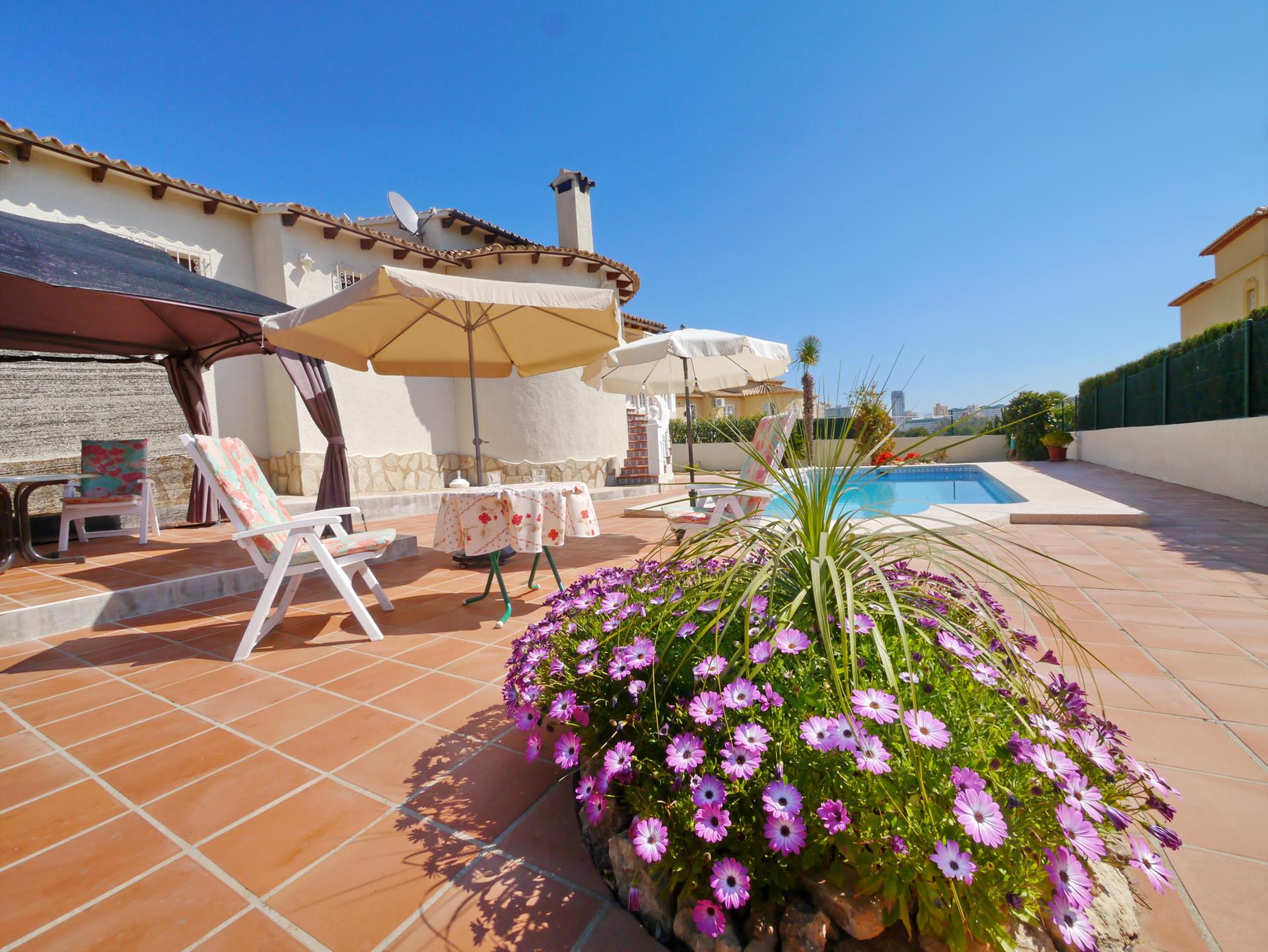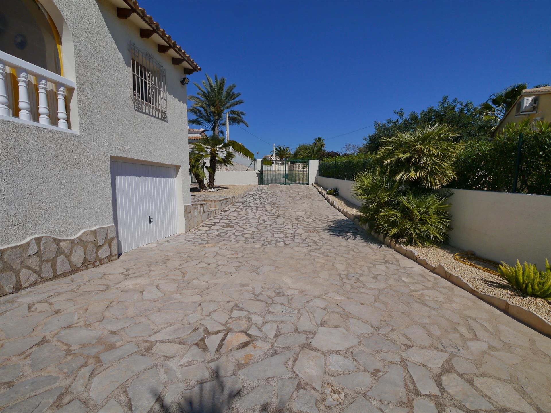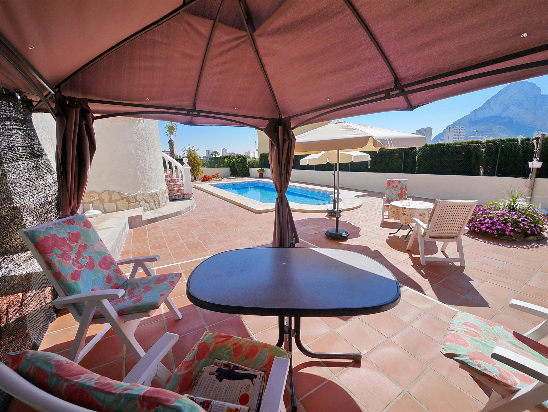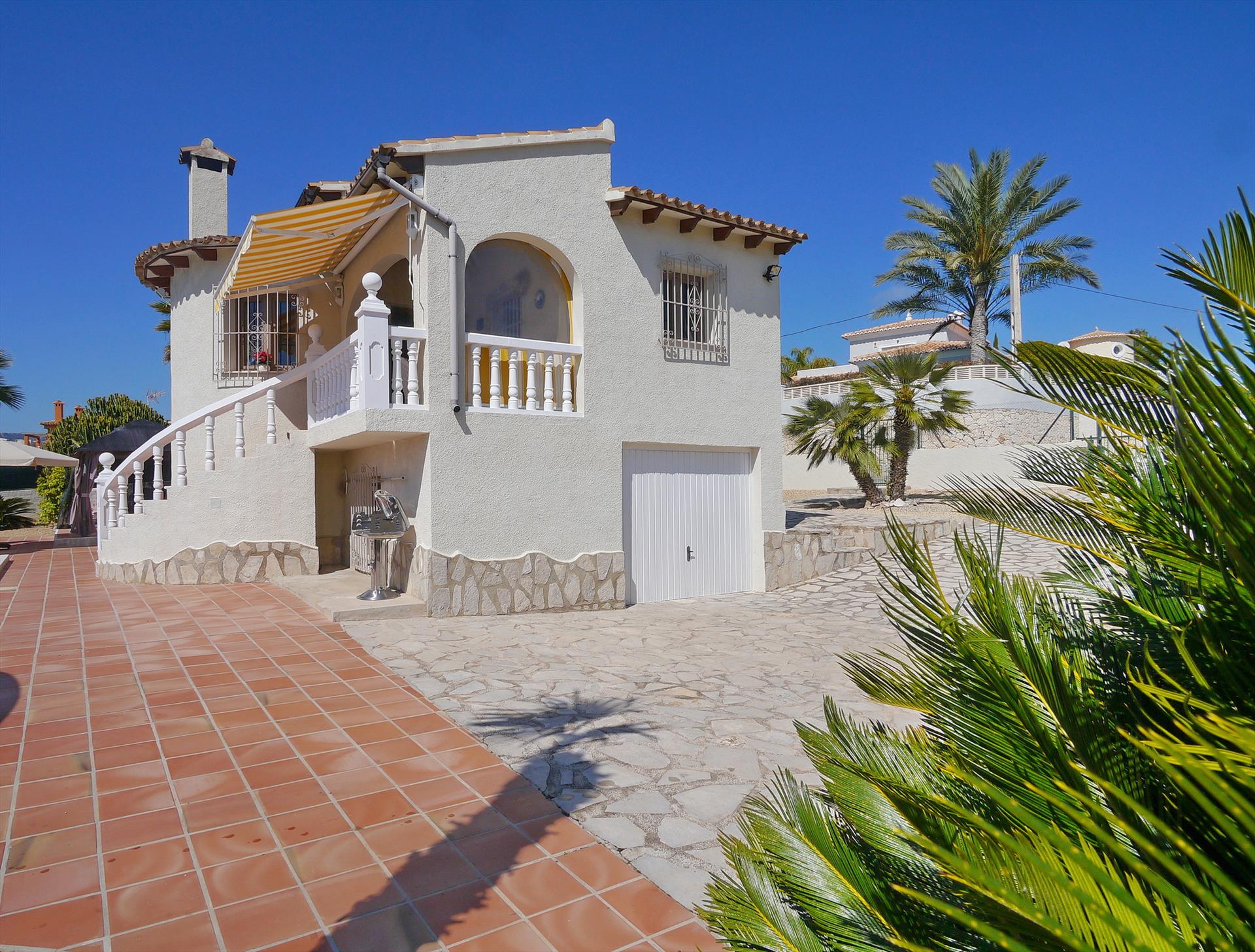 Stor og komfortabel villa i Calpe, Costa Blanca, Spania med privat svømmebasseng for 6 personer. Huset ligger i et boligområde nær stranden, tett på restauranter og barer, butikker, supermarkeder og en tennisbane, 1 km fra Arenal-Bol-stranden, 10 km fra Moraira, Benissa og 0,05 km fra Las Salinas.