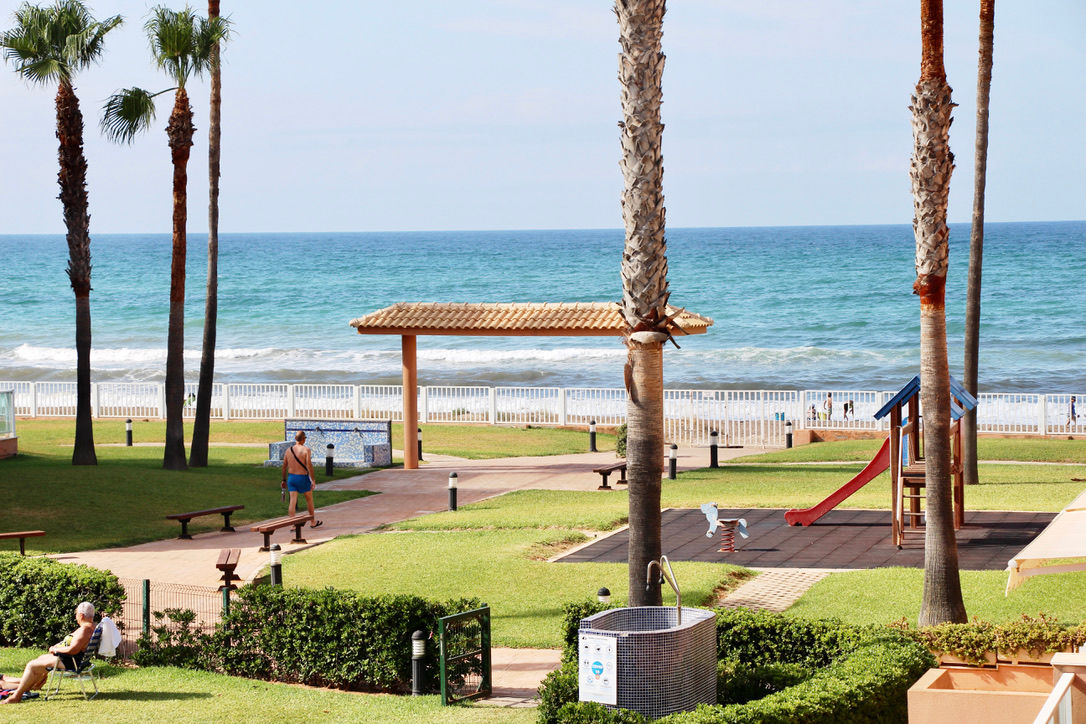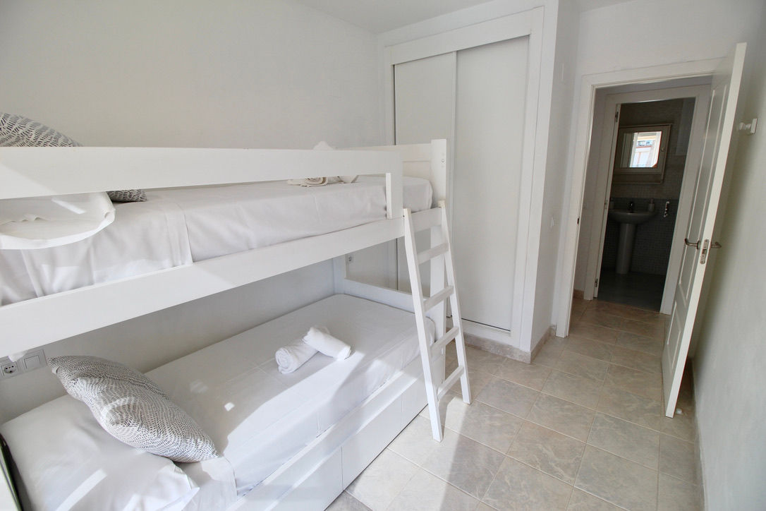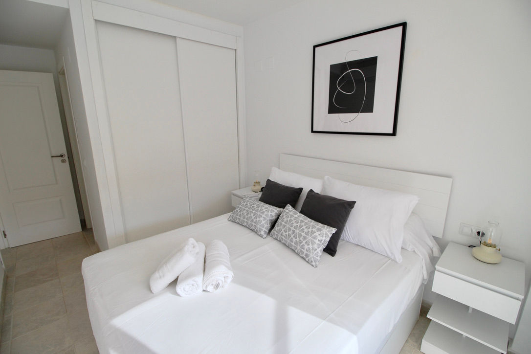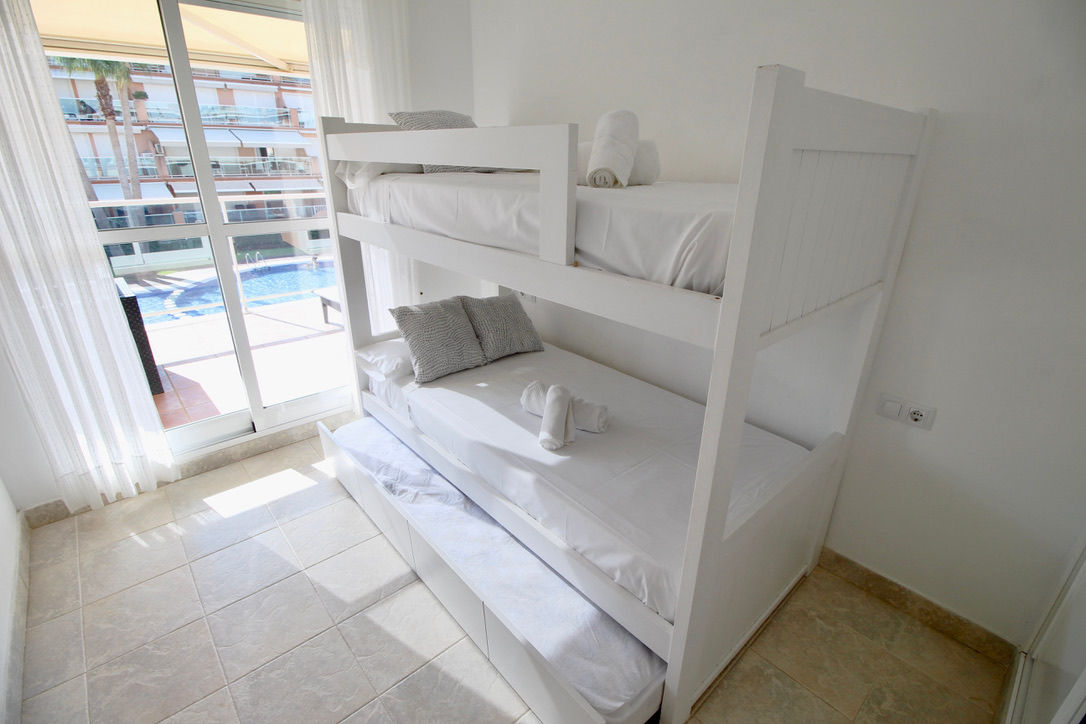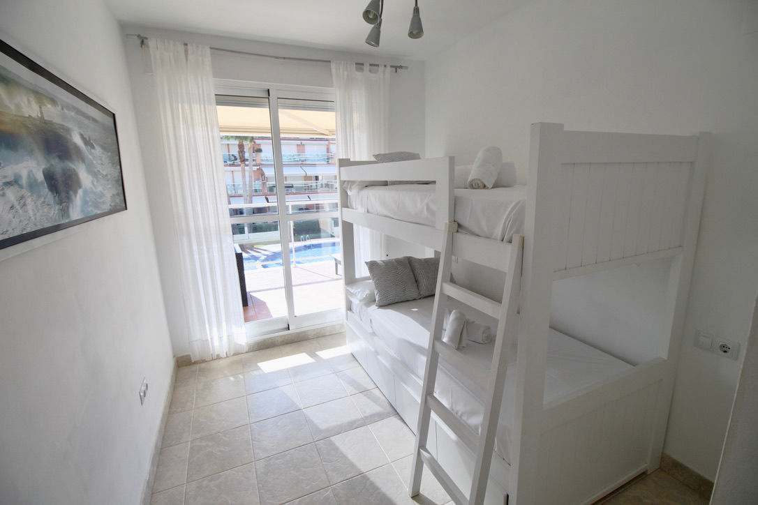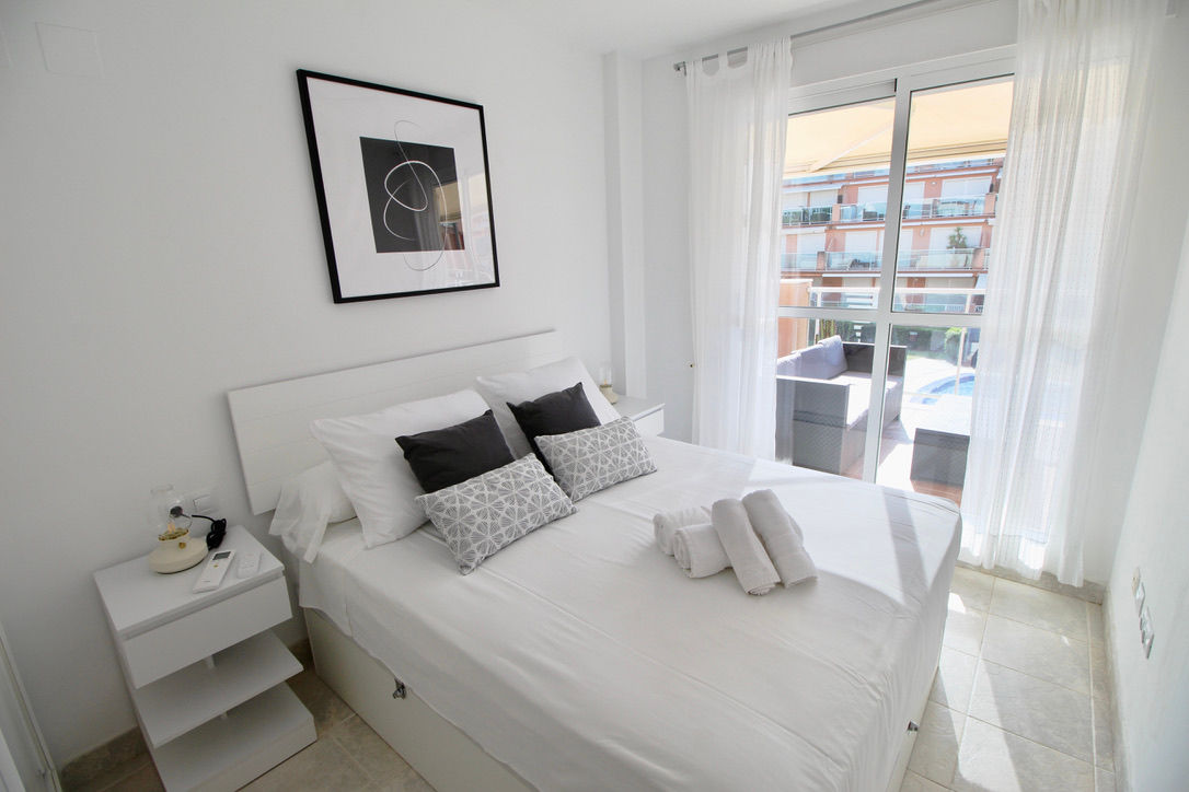 Leiligheten har 2 soverom og 2 bad. Boligen tilbyr privatliv, en vakker plenhage, en felles plenhage, fantastiske utsikter over bukten, stranden, havet, bassenget og hagen, samt flotte utsikter til gaten. Dens komfort og nærhet til stranden, butikker, sportsaktiviteter og uteliv gjør dette til en ideell leilighet for å tilbringe ferien i Spania med familie eller venner.
