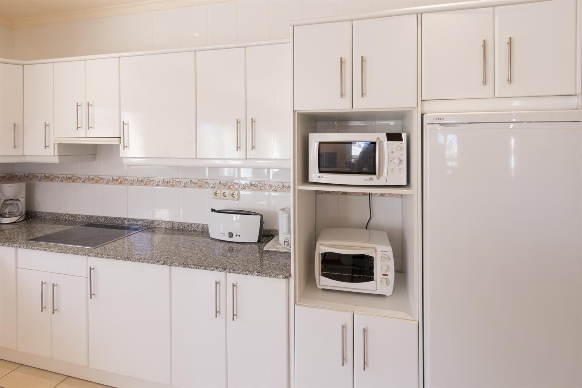 • open kitchen with electric hob, electric oven, microwave, dishwasher, refrigerator-freezer, coffee machine, electric kettle and toaster