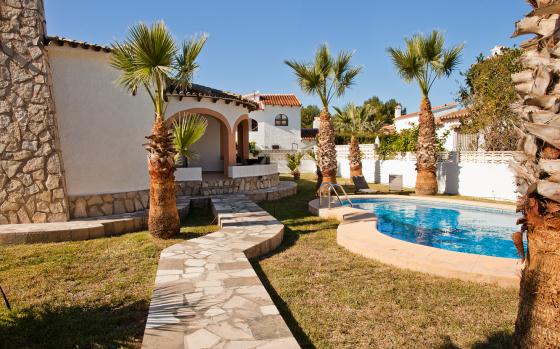 Beautiful and comfortable villa in Denia, on the Costa Blanca, Spain with private pool for 6 persons. The house is situated in a residential beach area, close to restaurants and bars and at 1 km from the beach. The house has 3 bedrooms and 2 bathrooms. The accommodation offers a lawned garden with trees. The vicinity of the beach, places to shop, sports activities, places to go out, sights and culture makes this a fine villa to spend your holidays in Spain with family or friends and even your pets.