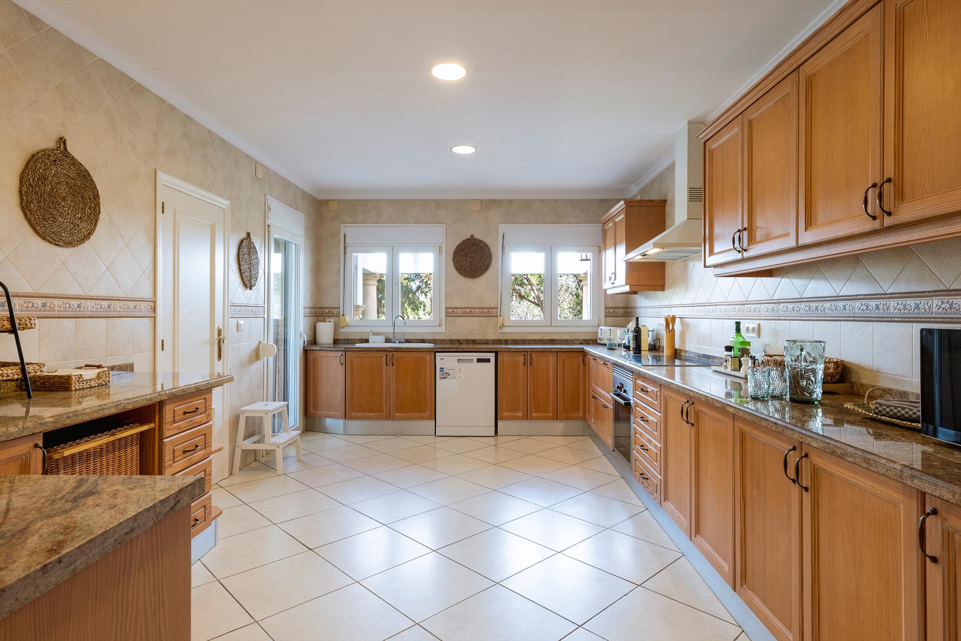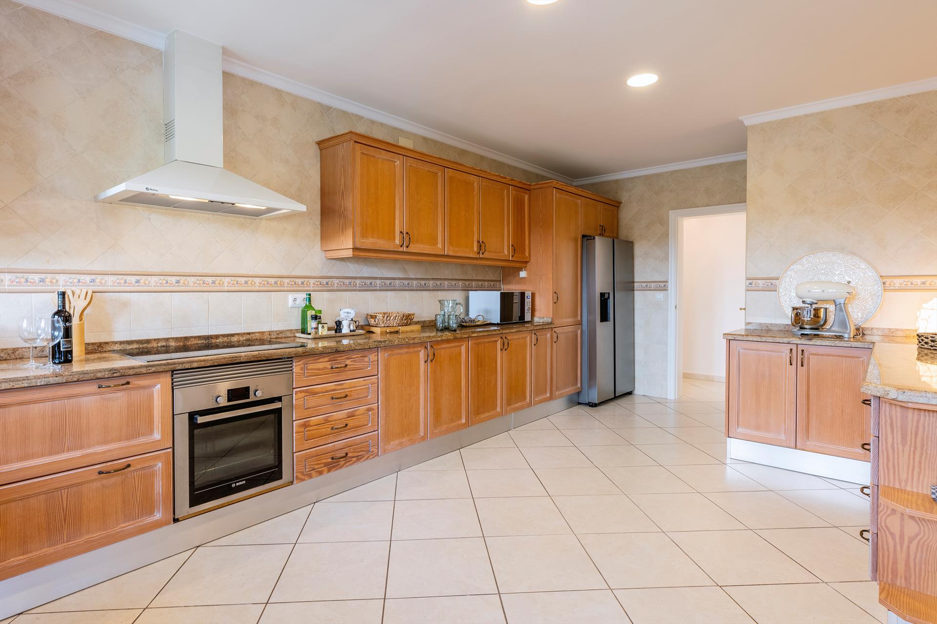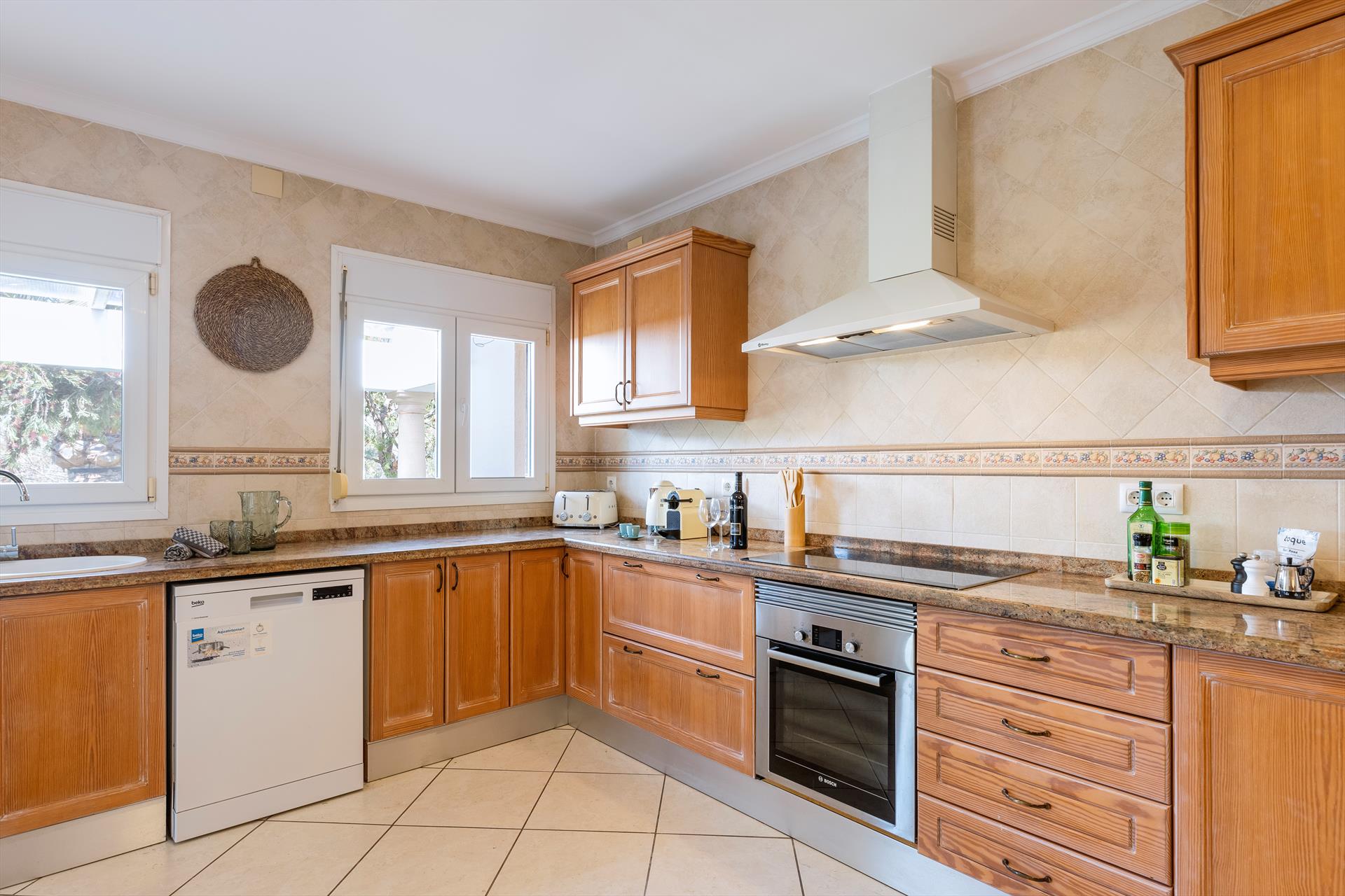 • kitchen with electric hob, electric oven, microwave, dishwasher, refrigerator-freezer, coffee machine, electric kettle, mixer and toaster