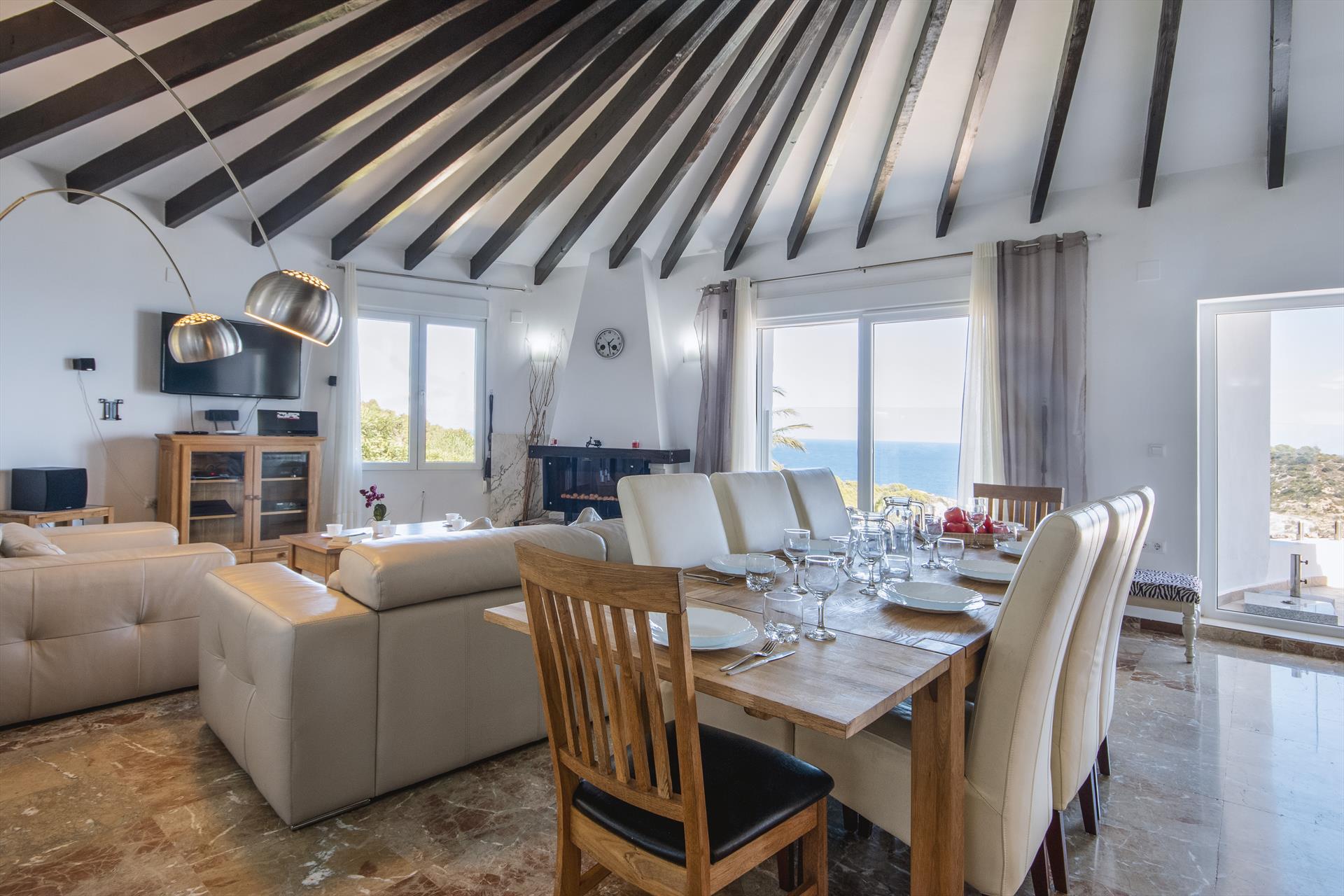 The luxury villa has 4 bedrooms and 3 bathrooms, spread over 2 levels. The accommodation offers privacy, a garden with gravel and trees, a beautiful pool and wonderful views of the sea. Its comfort and the vicinity of the beach make this an ideal luxury villa to spend your holidays in Spain with family or friends, and even your pets.