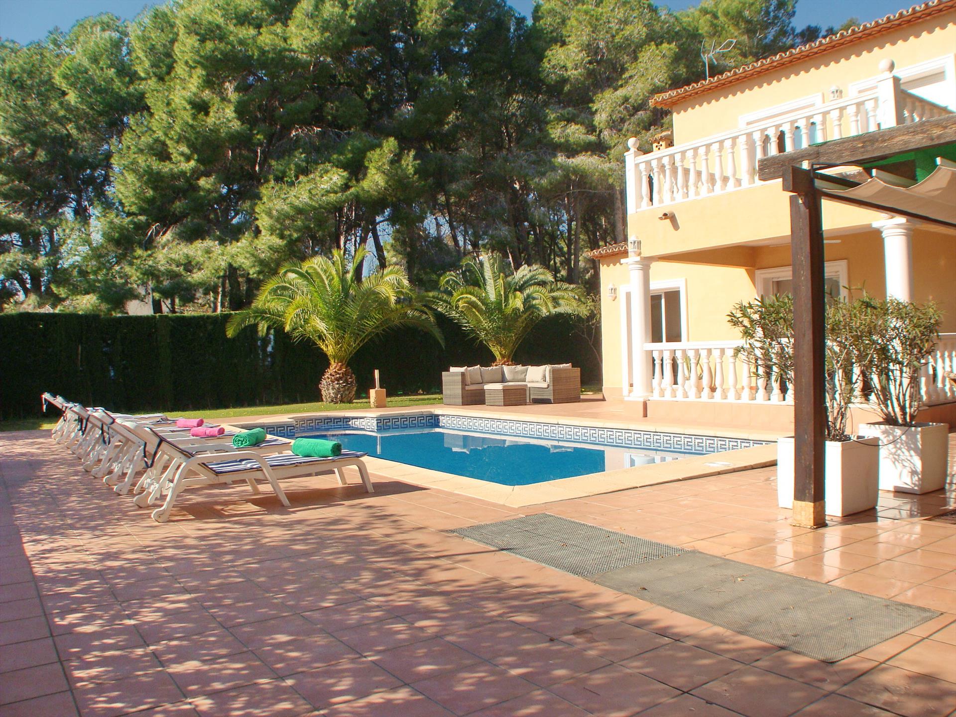 The villa has 4 bedrooms, 2 bathrooms and 1 guest toilet, spread over 2 levels. The accommodation offers privacy, a wonderful lawned garden with trees and a lovely pool. Its comfort and the proximity to the beach, shops, sports activities, entertainment facilities and places to go out make this an ideal villa to spend your holidays in Spain with family or friends.