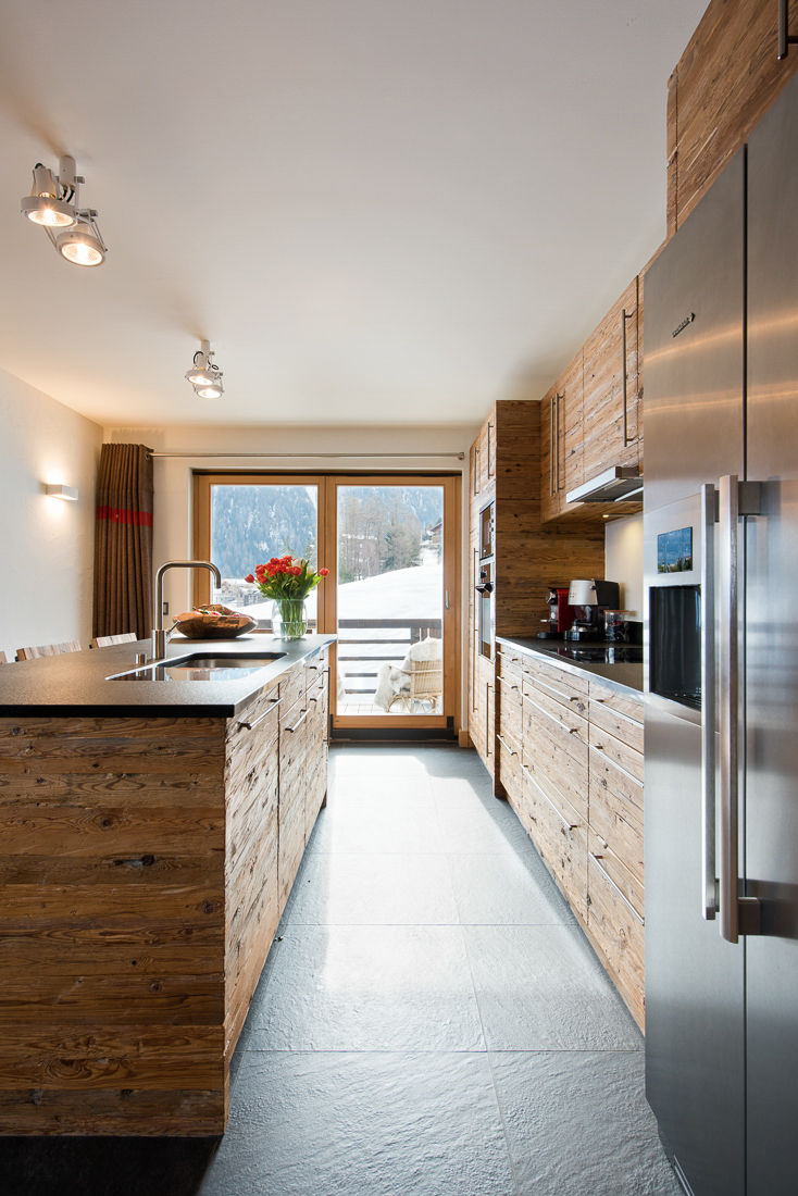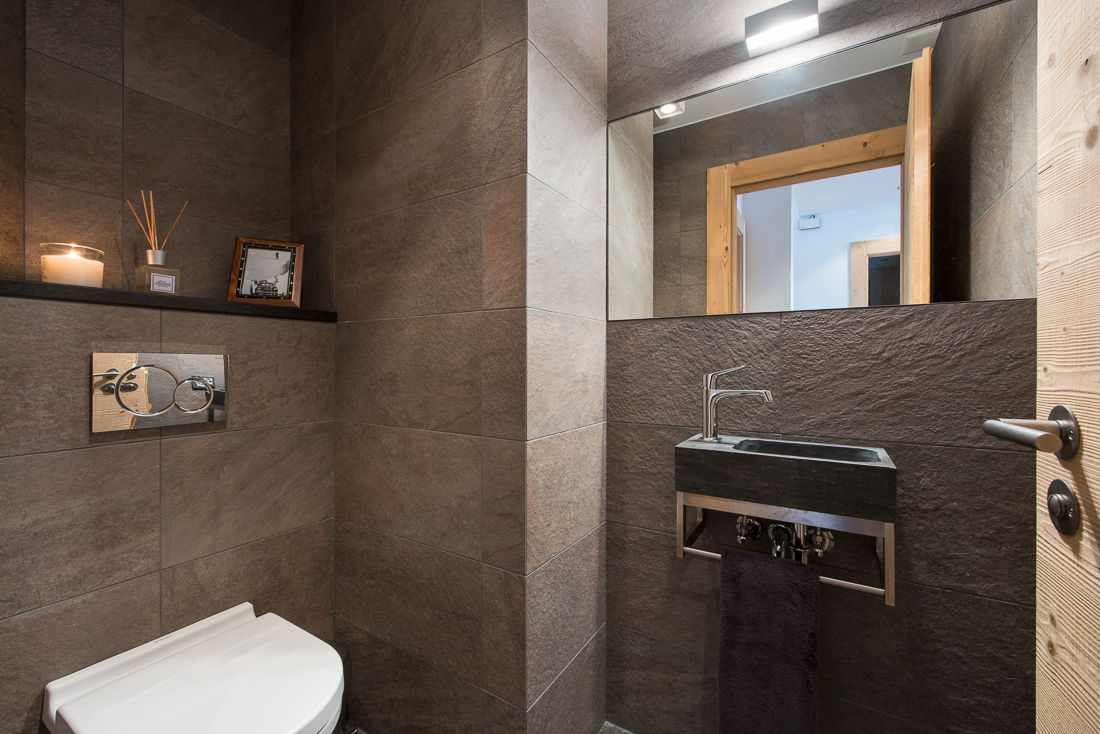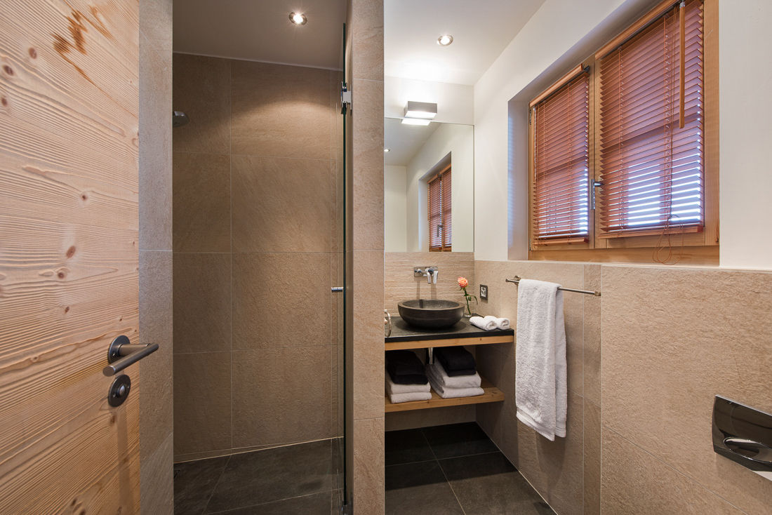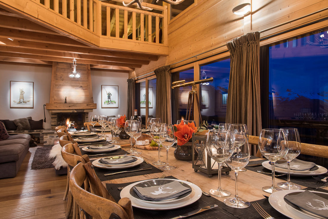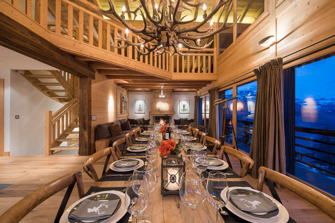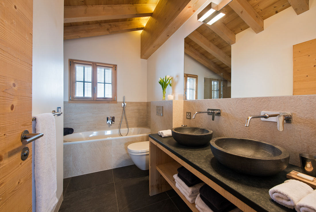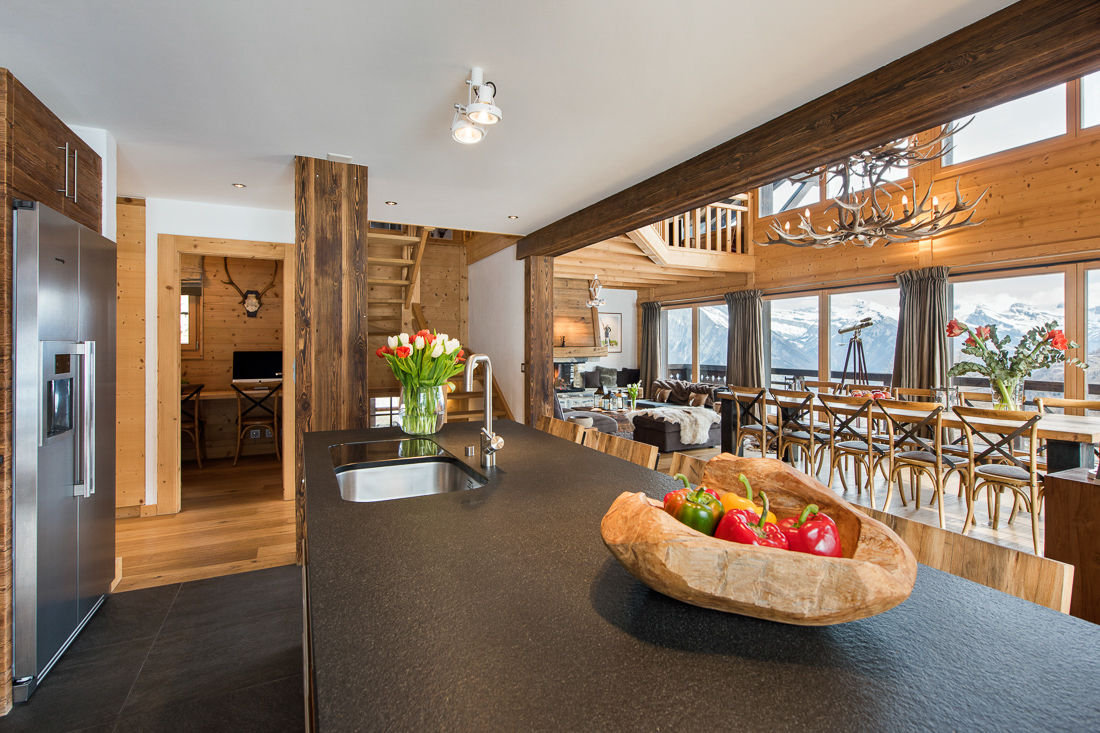 The main double-height living area is the central masterpiece, with superb views over the Rhone valley and the surrounding mountains. Here, the chalet structural design emphasises feelings of openness and space, with plenty of light streaming in from the large glass doors and windows that expose the stunning scenery all around. The carefully selected furnishings and fittings separate this huge space into a cosy lounge area focused around the open fireplace, a modern kitchen with cooking island and bar to seat five people, and a dining area that comfortably seats 12 around the large table. The fully-fitted kitchen has everything you might need for your hioliday cooking, including oven, 4-ring hob, separate freezer, microwave, kettle, toaster, electric filter coffee-machine, Nespresso coffee-machine plus 2 fondue sets and 2 raclette sets.