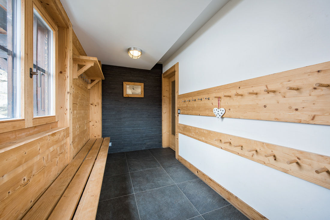 Patio doors on this level lead to the balcony, terrace and upper garden. The outside garden has two levels, great for summer barbecues, dinners on the large outside table, a game of table tennis or lounging on the deck chairs. The entrance is on the lower floor through the ski-room, which has enough space for ski gear for 12 people and a separate heater to ensure gloves and ski boots are comfortable and dry again the next day.