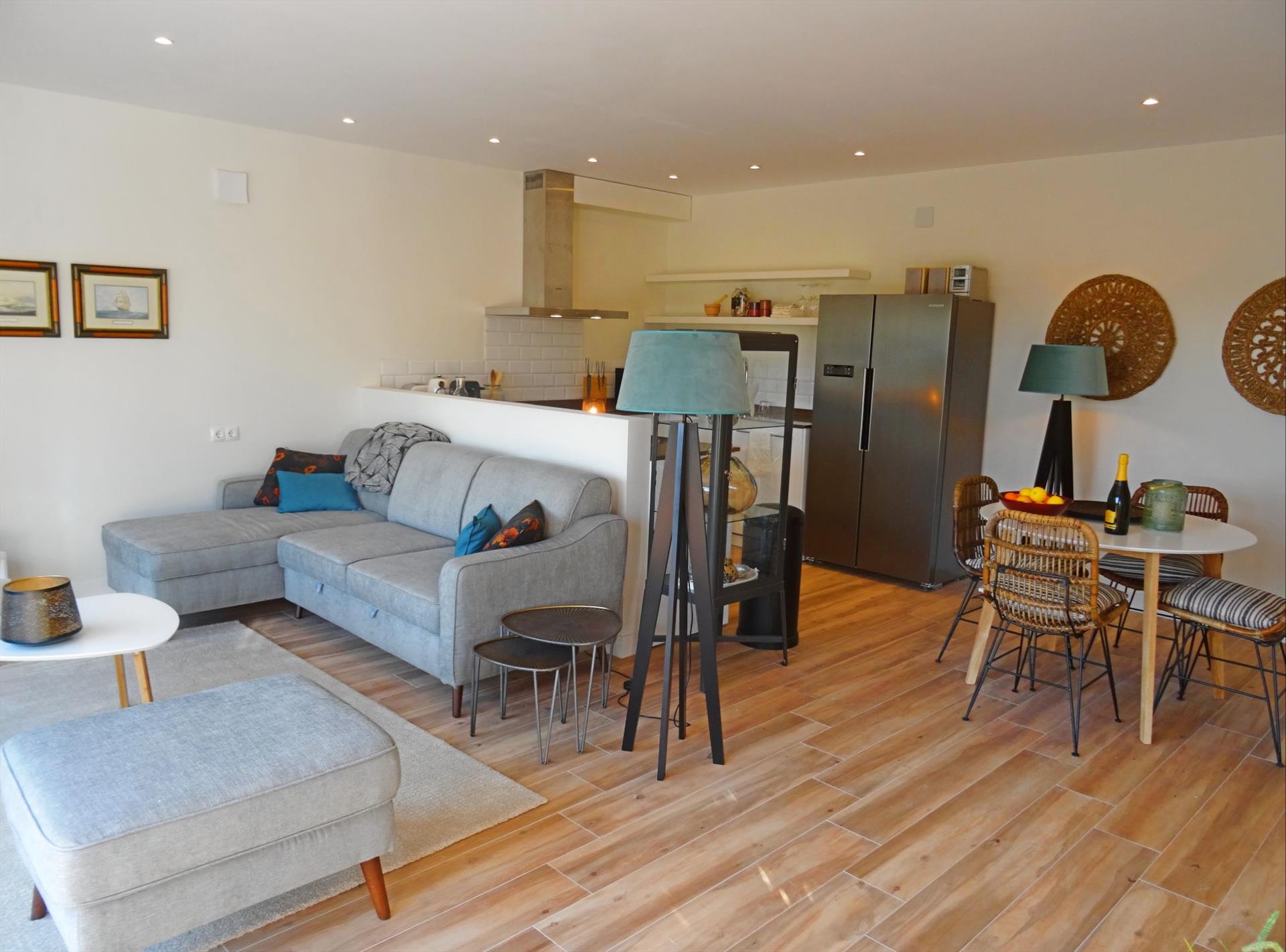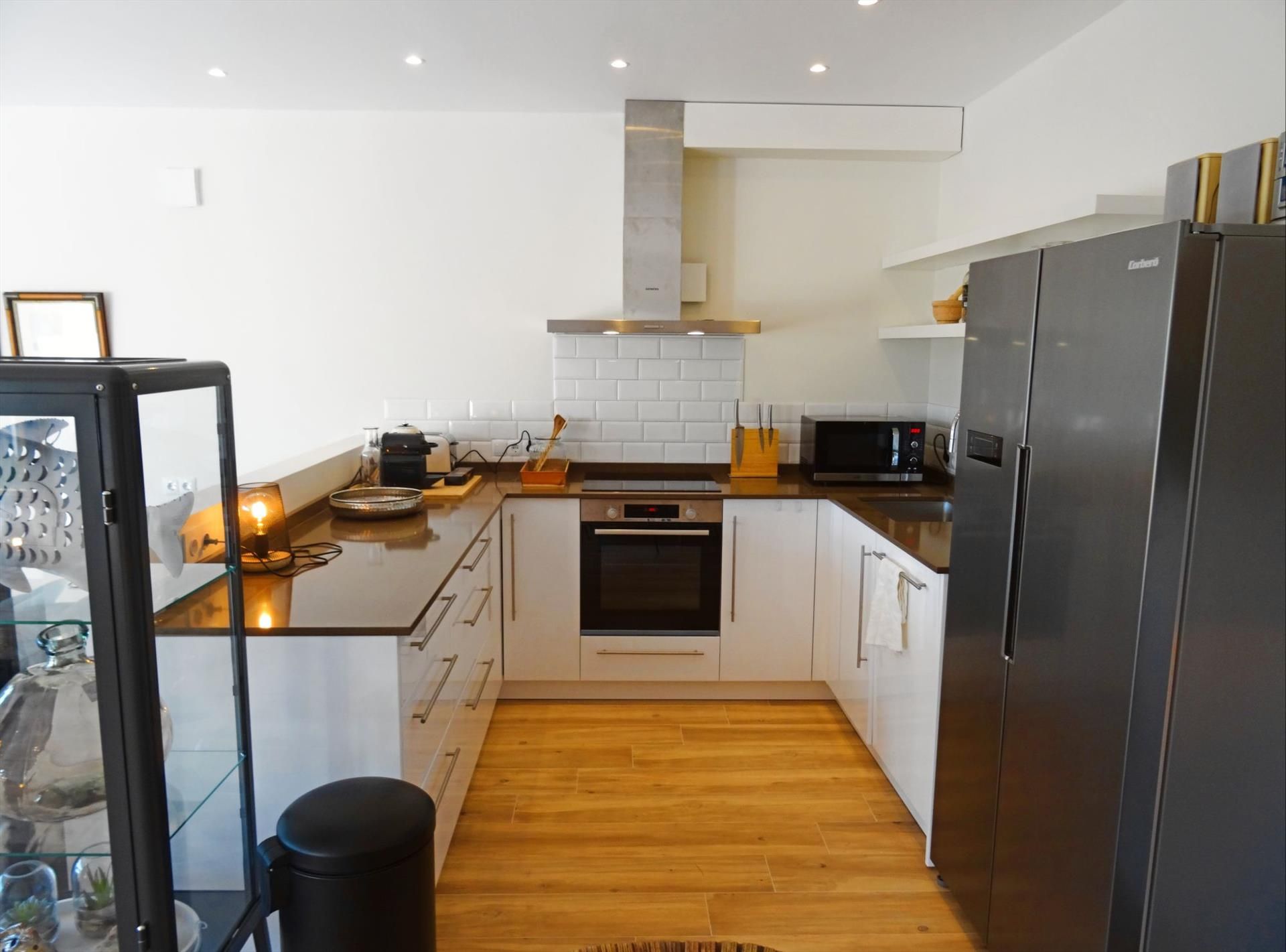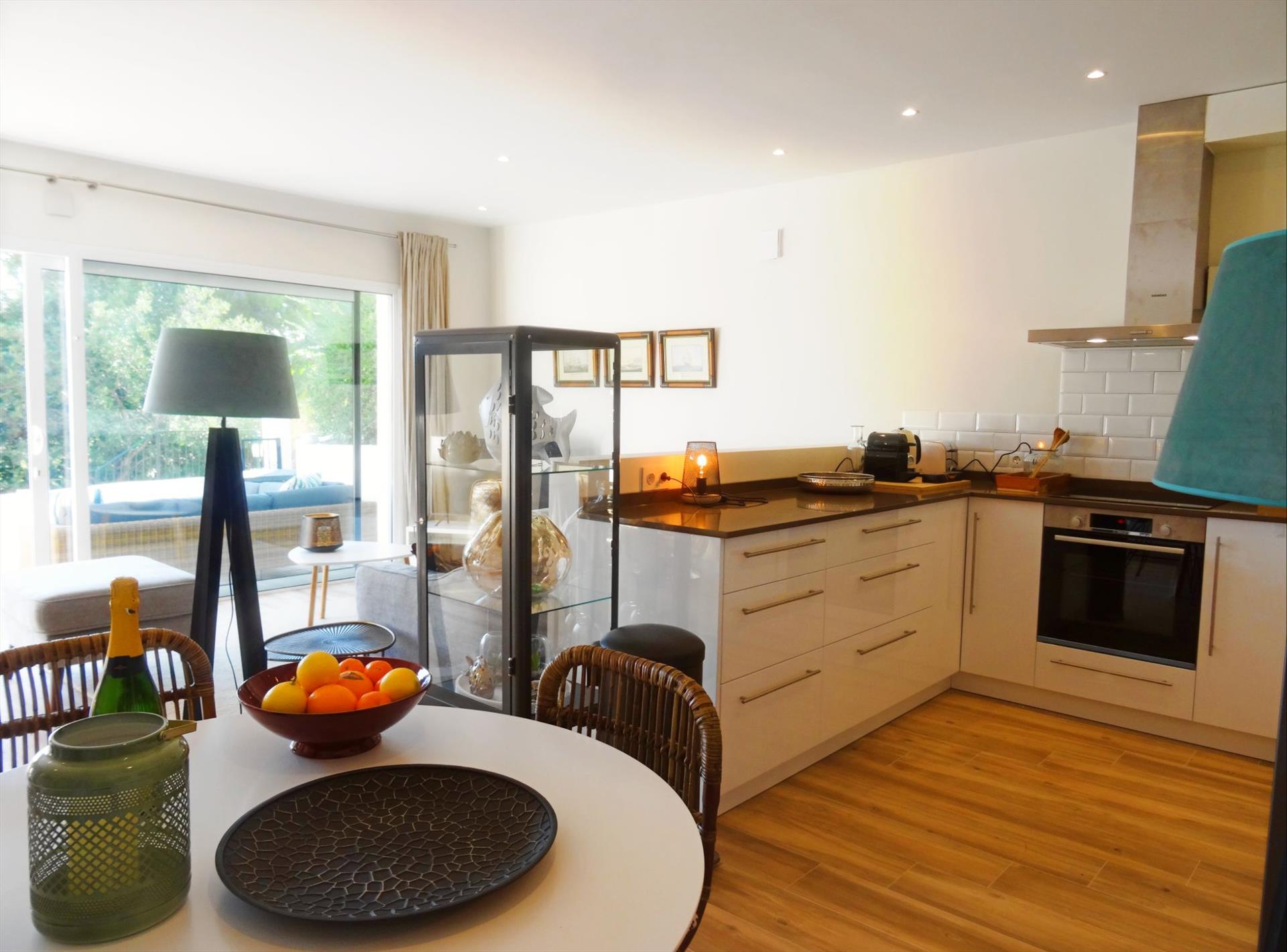 • otvorena kuhinja s indukcijskom pločom, električnom pećnicom, mikrovalnom, perilicom posuđa, hladnjakom s zamrzivačem, aparatom za kavu, električnim kuhalom i tosterom