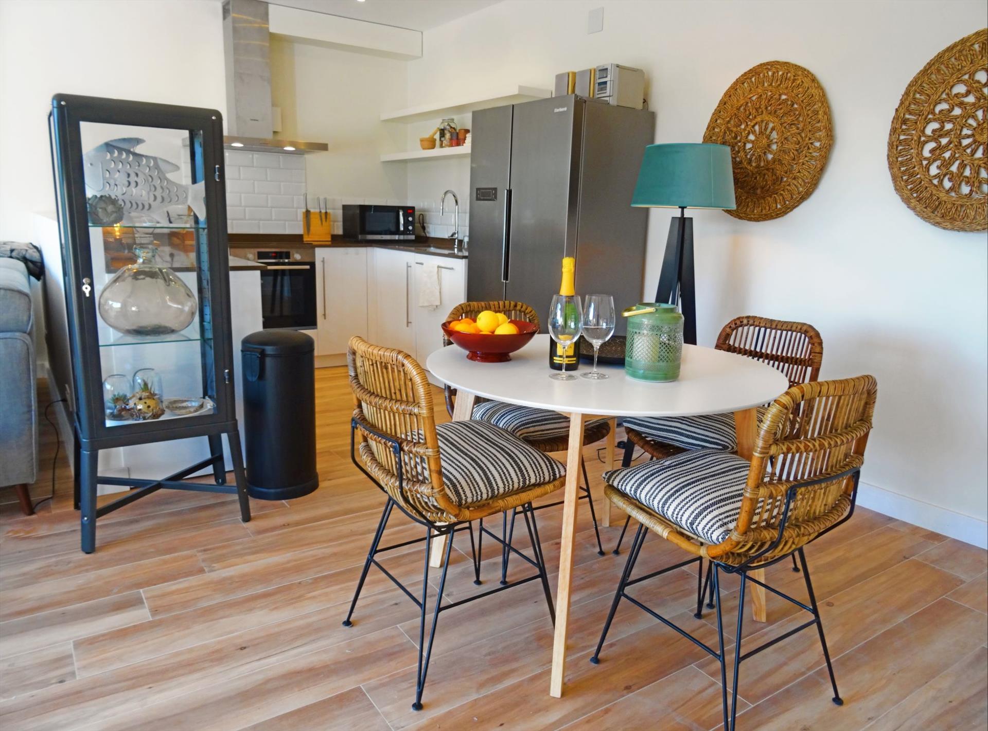 - cuisine ouverte avec plaque à induction, four électrique, micro-ondes, lave-vaisselle, réfrigérateur-congélateur, machine à café, bouilloire électrique et grille-pain