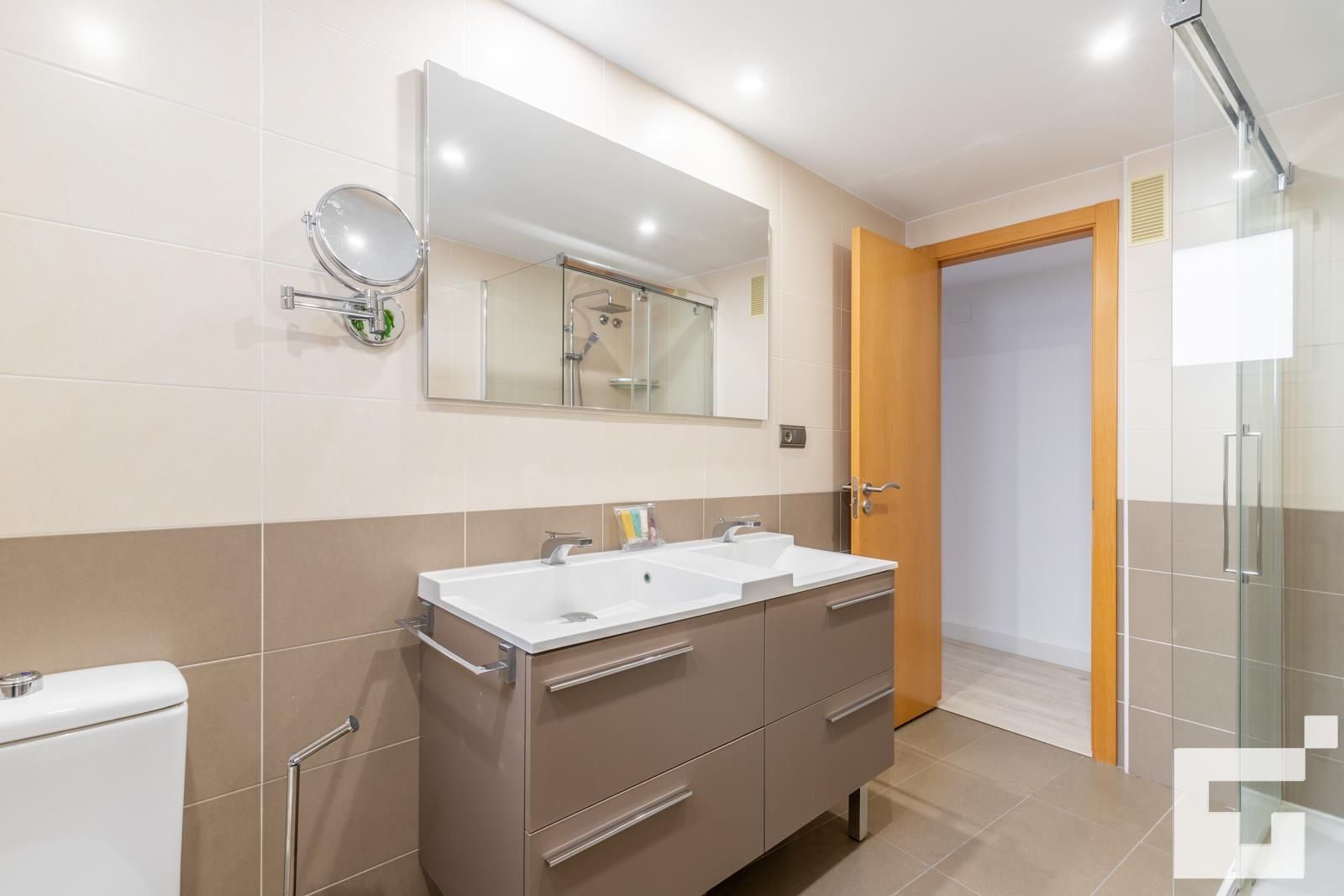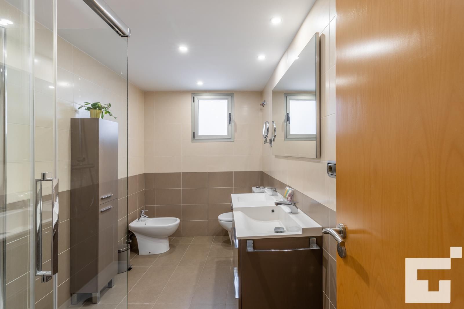 • salle de bain avec double lavabo, douche, bidet et toilettes
