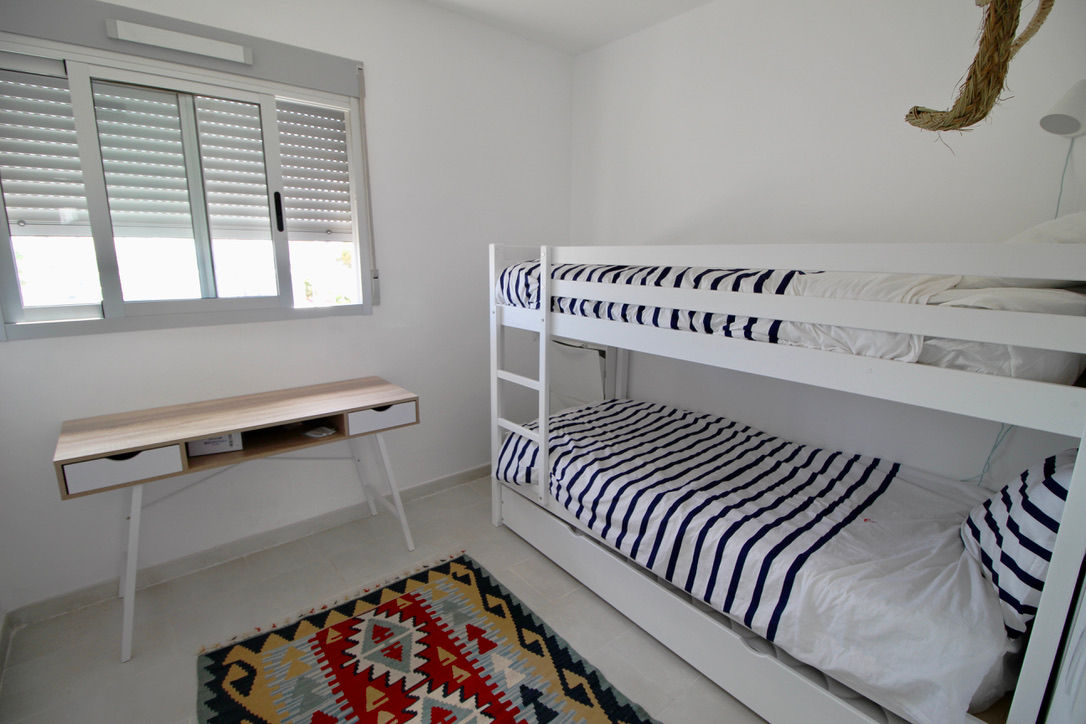 L'appartement dispose de 2 chambres et 2 salles de bain. Le logement offre intimité, un magnifique jardin gazonné, un jardin commun, de merveilleuses vues sur la baie, la plage, la mer, les montagnes, la piscine et le jardin, ainsi que de belles vues sur la rue et d'autres bâtiments. Son confort et sa proximité de la plage, des commerces, des activités sportives et des divertissements font de cet appartement un lieu idéal pour passer vos vacances en Espagne en famille ou entre amis.