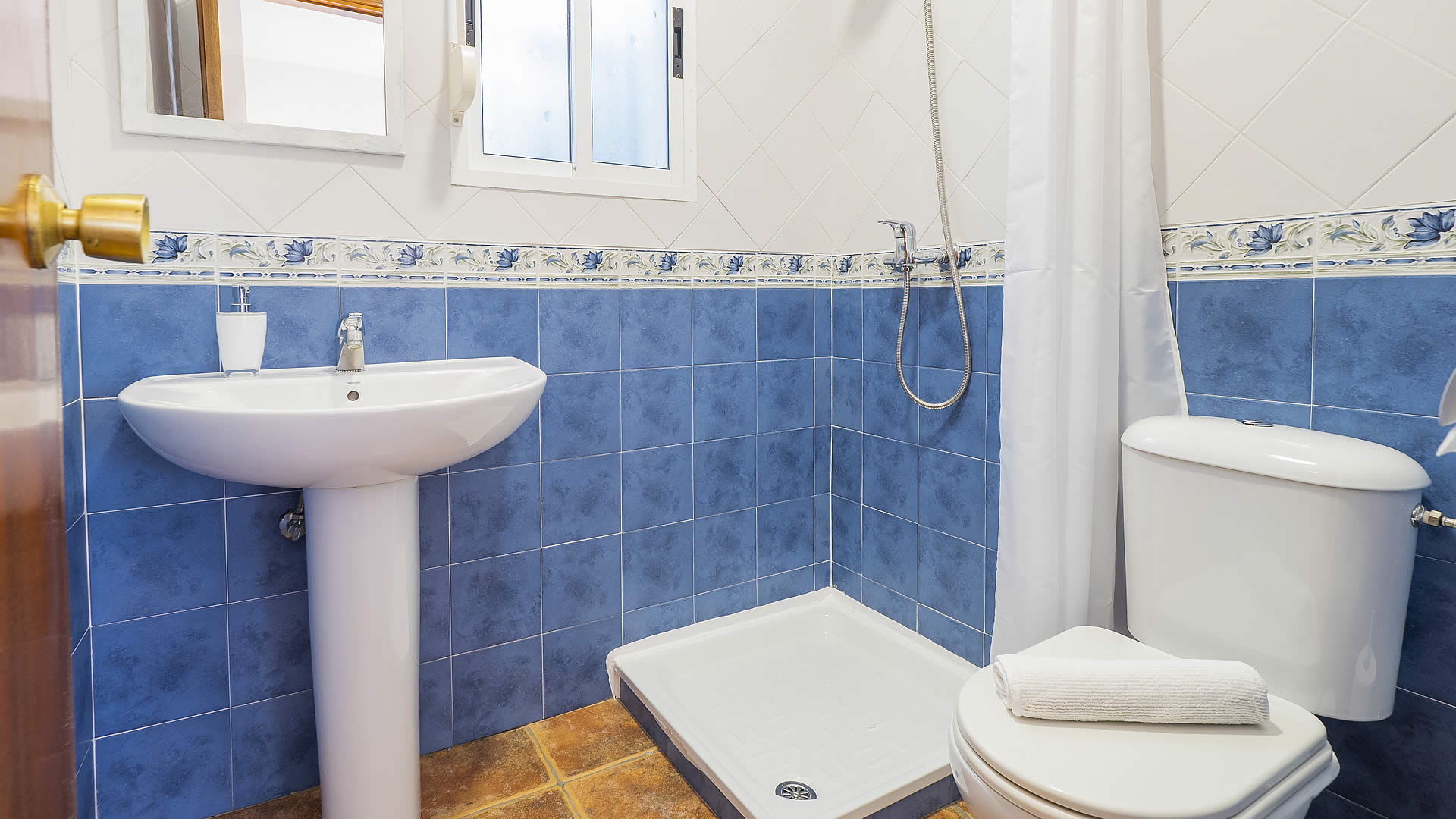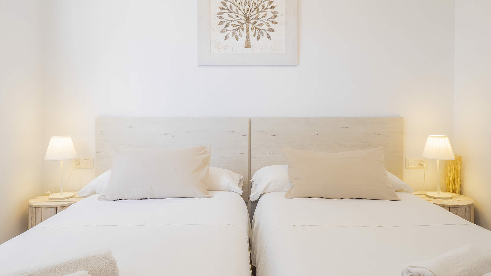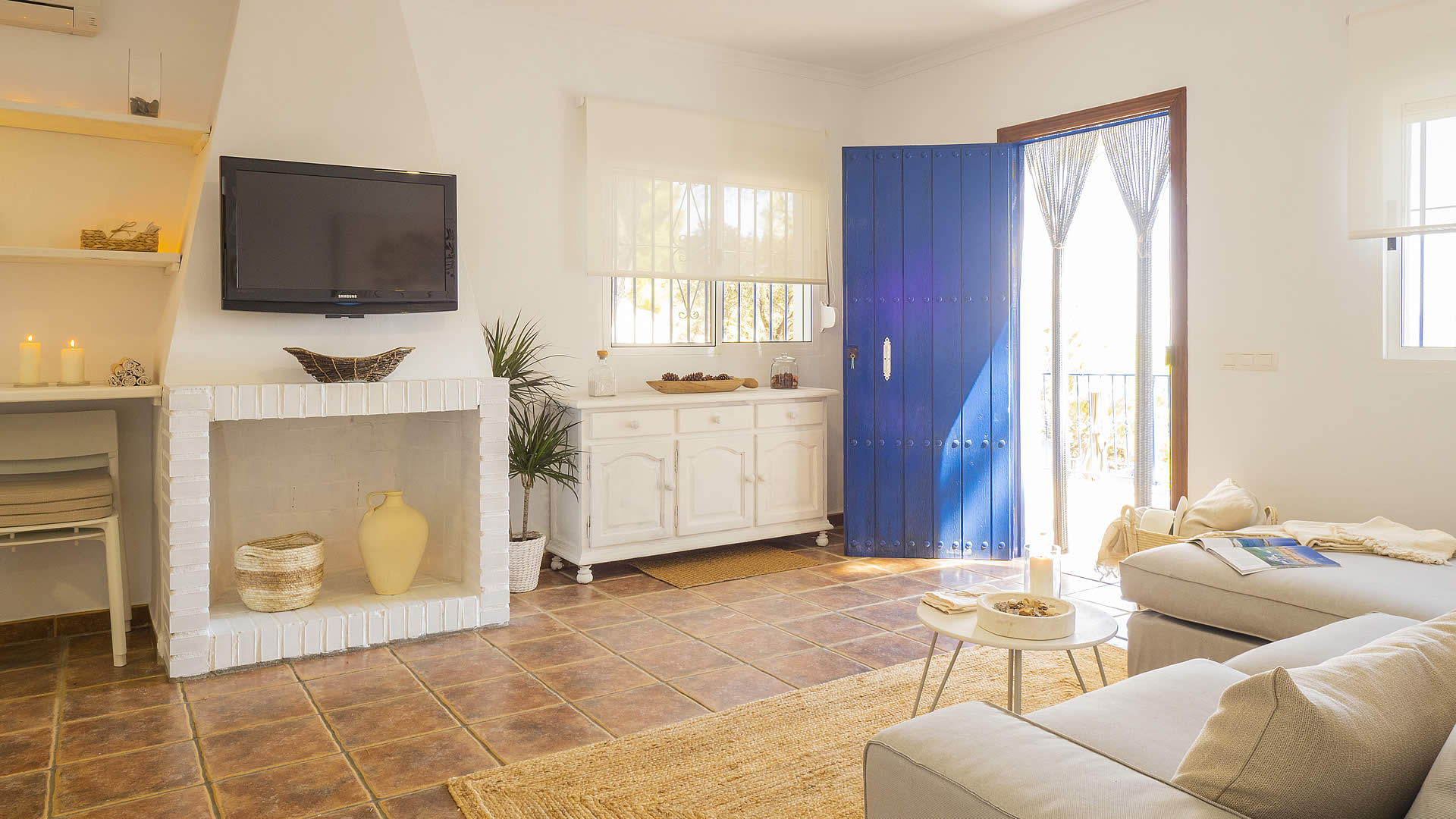 L'intérieur de la maison est lumineux avec des meubles simples et confortables. Toutes les chambres sont à l'étage avec le salon ouvrant sur la cuisine. Le salon offre un canapé, des fauteuils, un foyer et la télévision par satellite. La cuisine est bien équipée avec une cuisinière à induction à 4 feux, un réfrigérateur/congélateur, four, lave-linge et lave-vaisselle. La chambre principale a un lit 2 personnes et une salle de bain en suite. Les deux autres chambres ont 2 lits 1 personne et partagent une deuxième salle de bain. Équipée de climatisation dans le salon/salle à manger et de radiateurs électriques pour les jours plus froids en hors-saison.