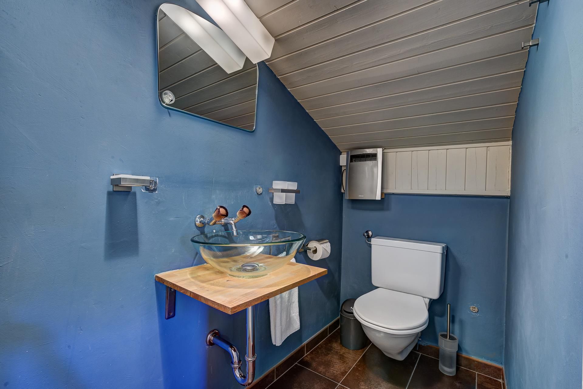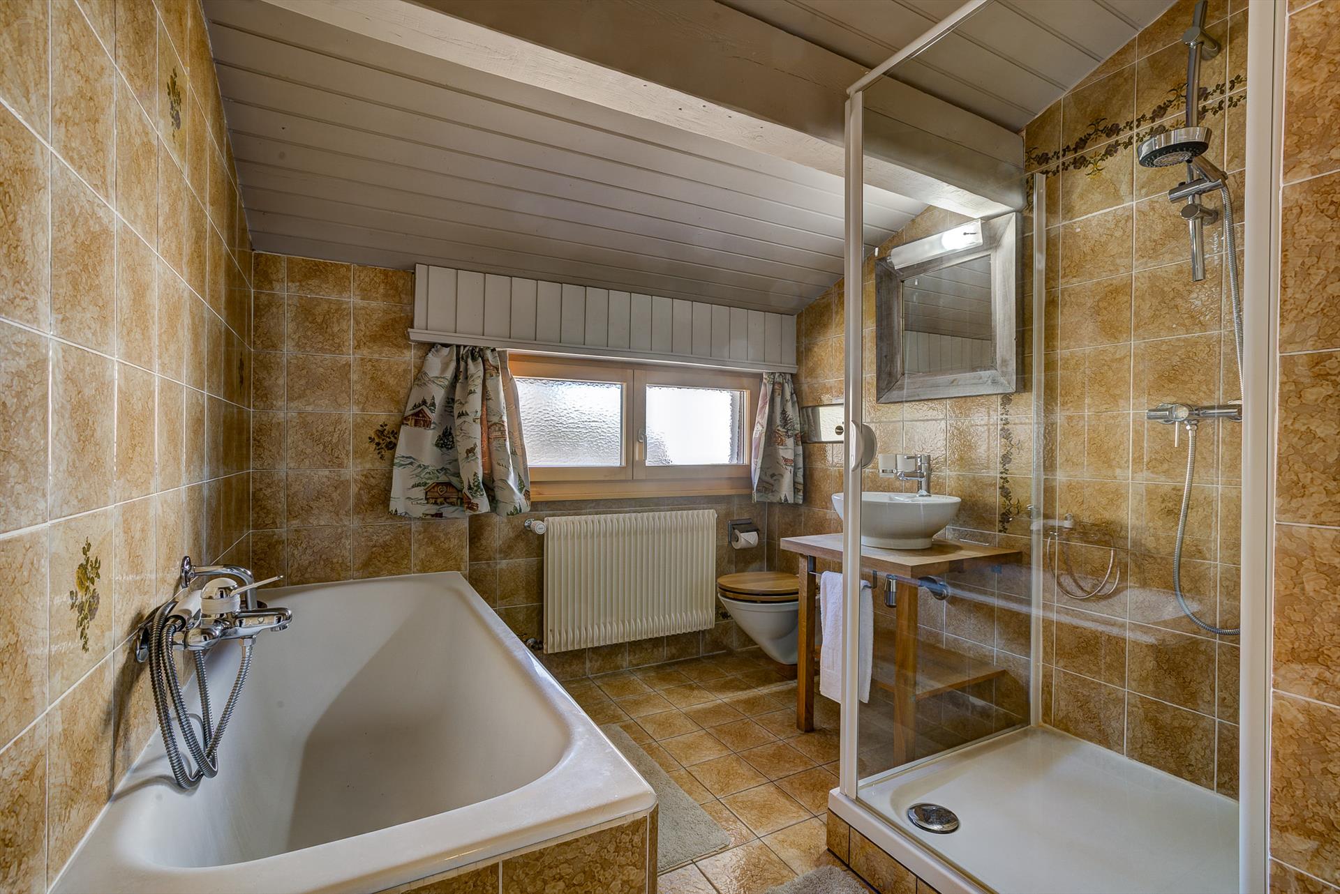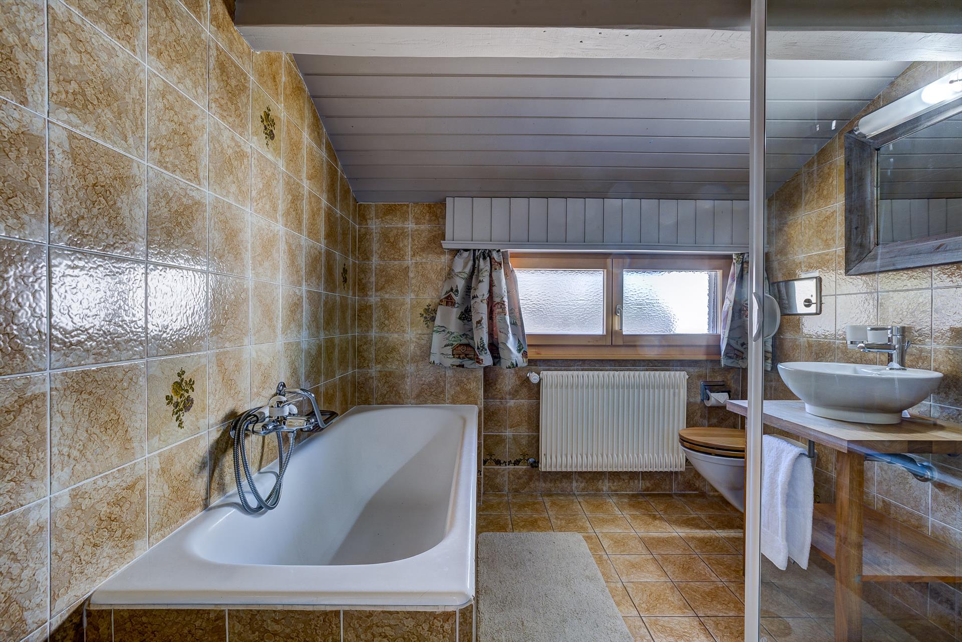 - Salle de bains 1 (attenante à la chambre 1), avec baignoire et douche à effet pluie, lavabo, sèche-cheveux et WC. Des fenêtres donnent sur le balcon sur le toit. Une partie de la pièce a un plafond bas.