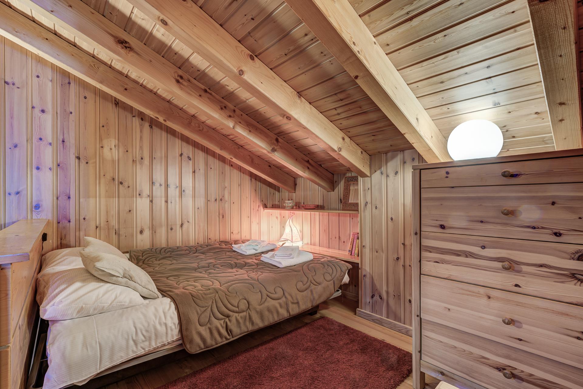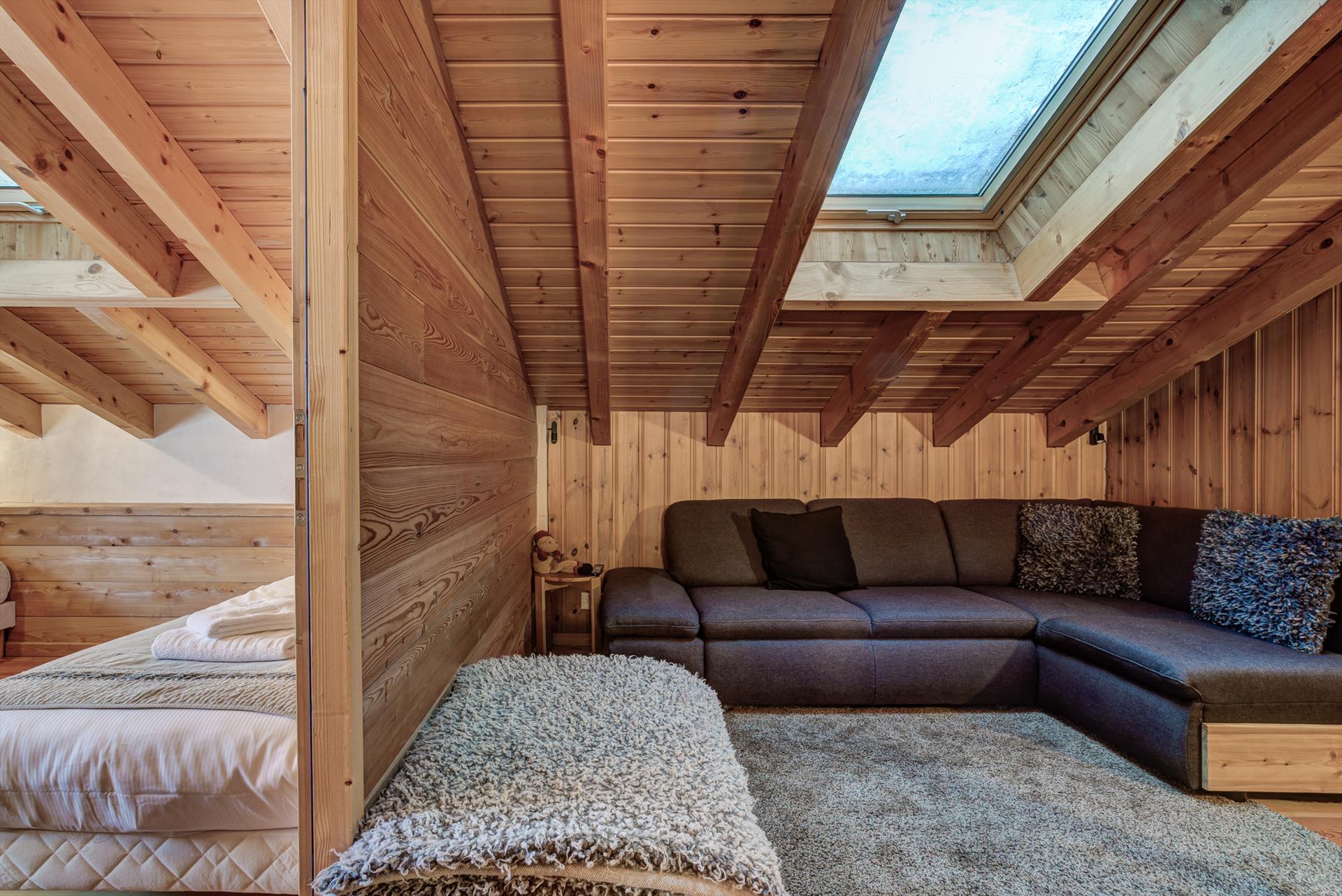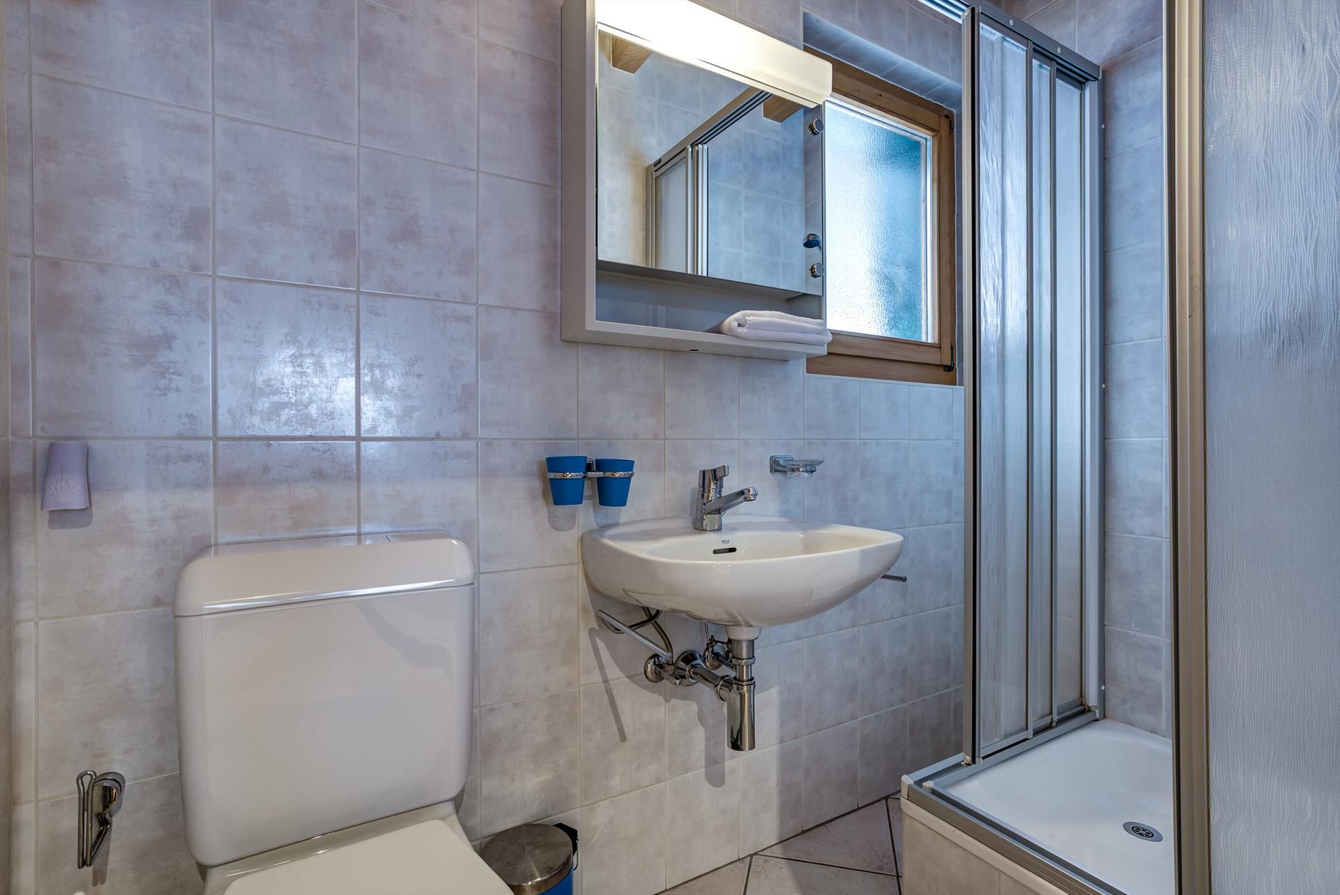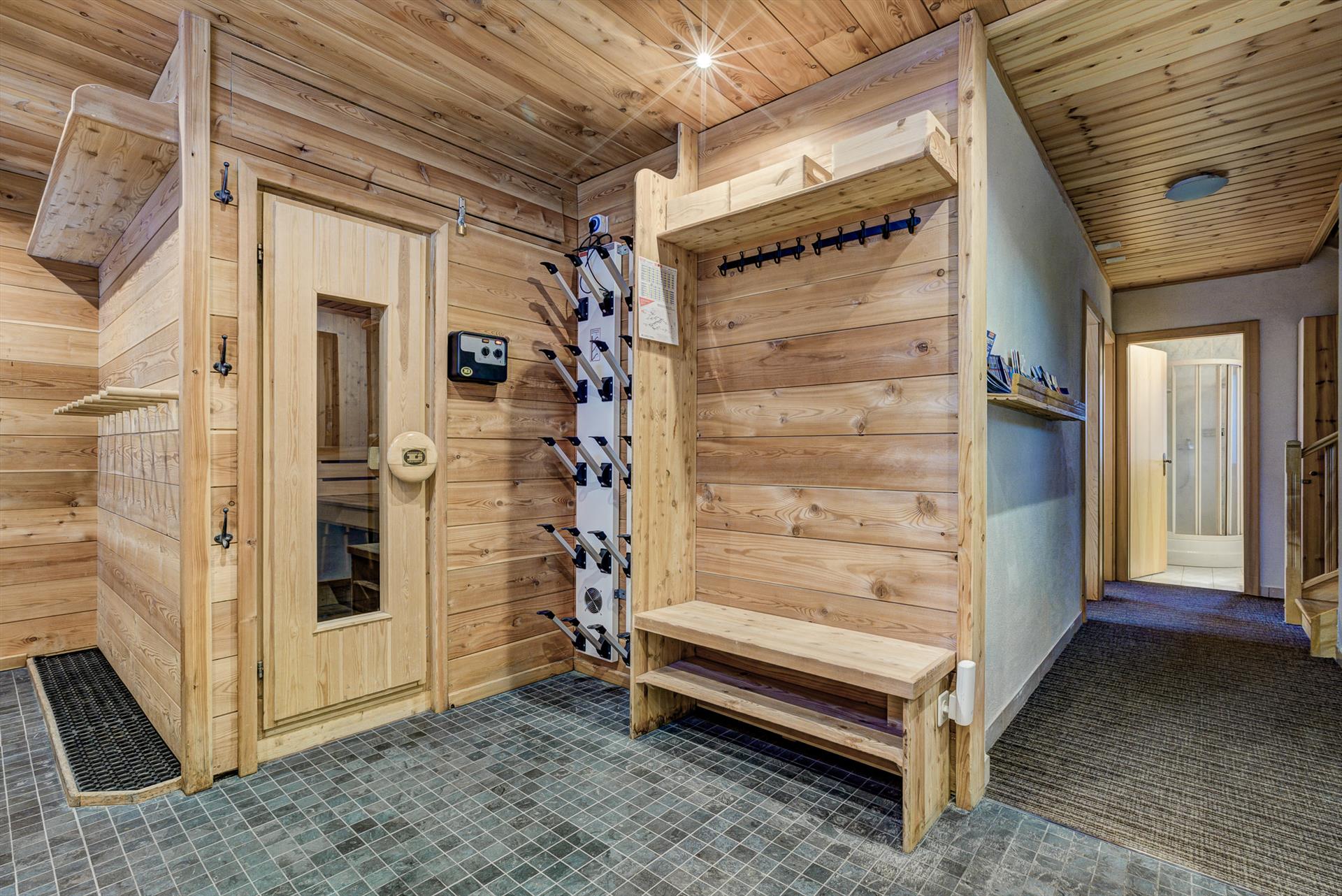 Il y a quatre chambres spacieuses et une cinquième chambre ouverte, de sorte que le chalet peut accueillir confortablement un total de 10 personnes. Au rez-de-chaussée, l'entrée se fait par le local à skis et le sauna. On y trouve une chambre double avec une grande salle de bain attenante (avec baignoire d'angle, douche, lavabo et WC), une chambre à deux lits et une salle de douche séparée (équipée d'une double douche à effet pluie, d'un lavabo et de WC).