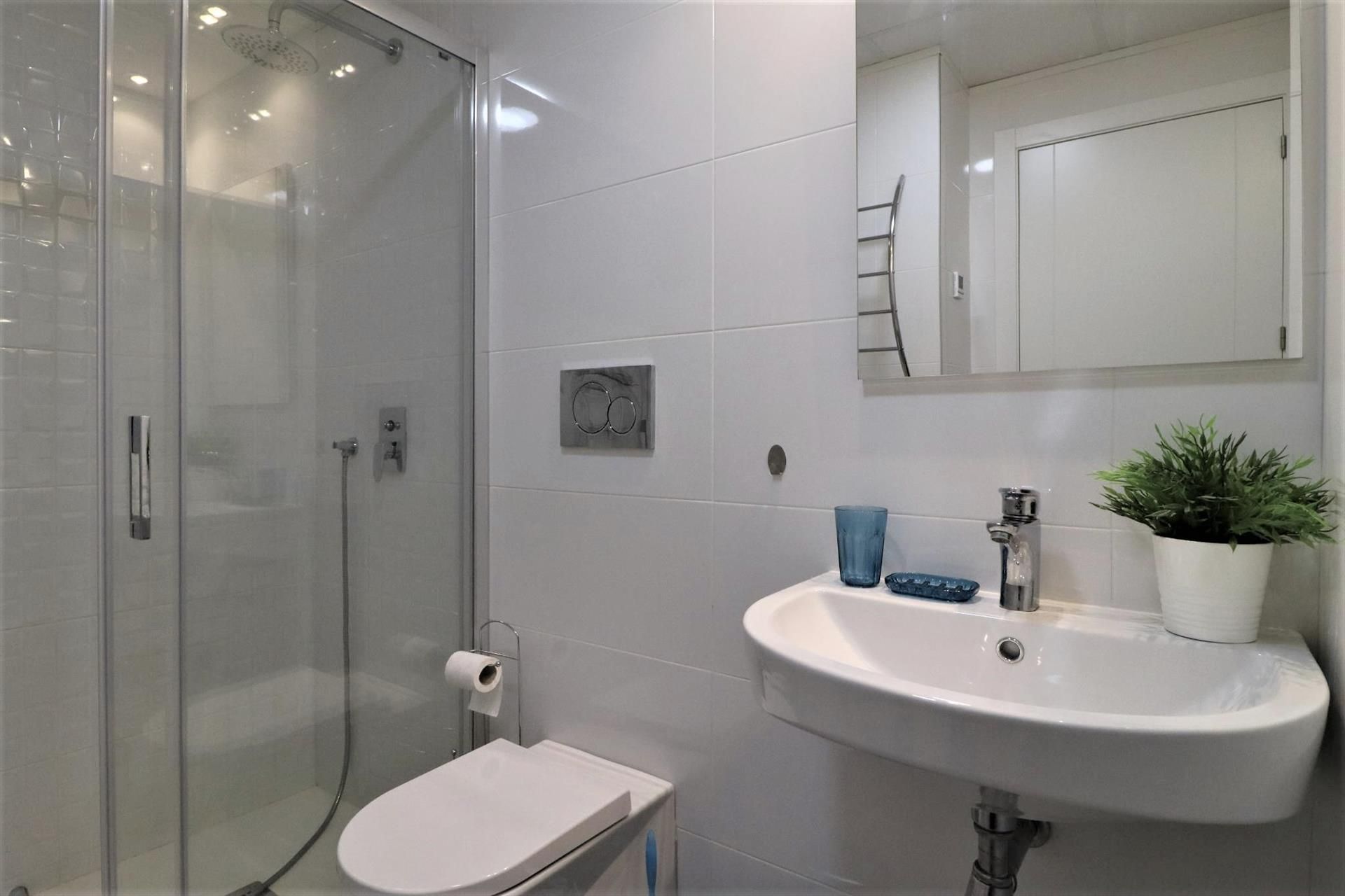 - kamar mandi dengan wastafel tunggal, shower, dan toilet
