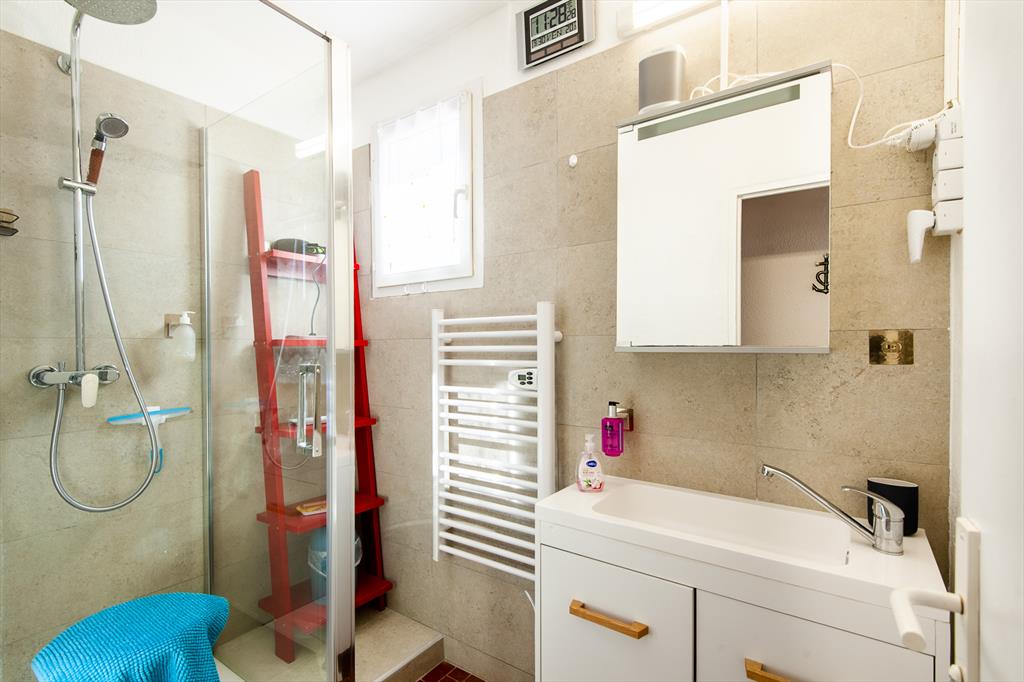 - badrum med enkel tvättställ, dusch och hårtork