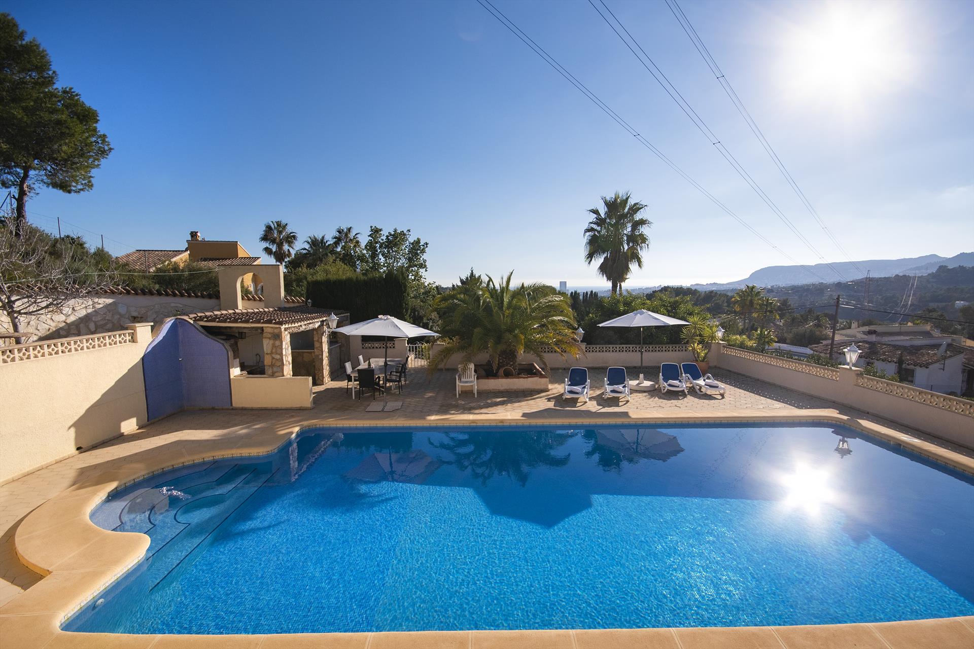 Villan har 3 sovrum och 2 badrum. Boendet erbjuder avskildhet, en trädgård med träd, en stor härlig pool, fantastisk utsikt över havet samt vackra vyer över bergen och staden. Dess komfort och närhet till stranden, sportaktiviteter, underhållningsfaciliteter, sevärdheter och kultur gör detta till en idealisk villa för att tillbringa semestern i Spanien med familj eller vänner.